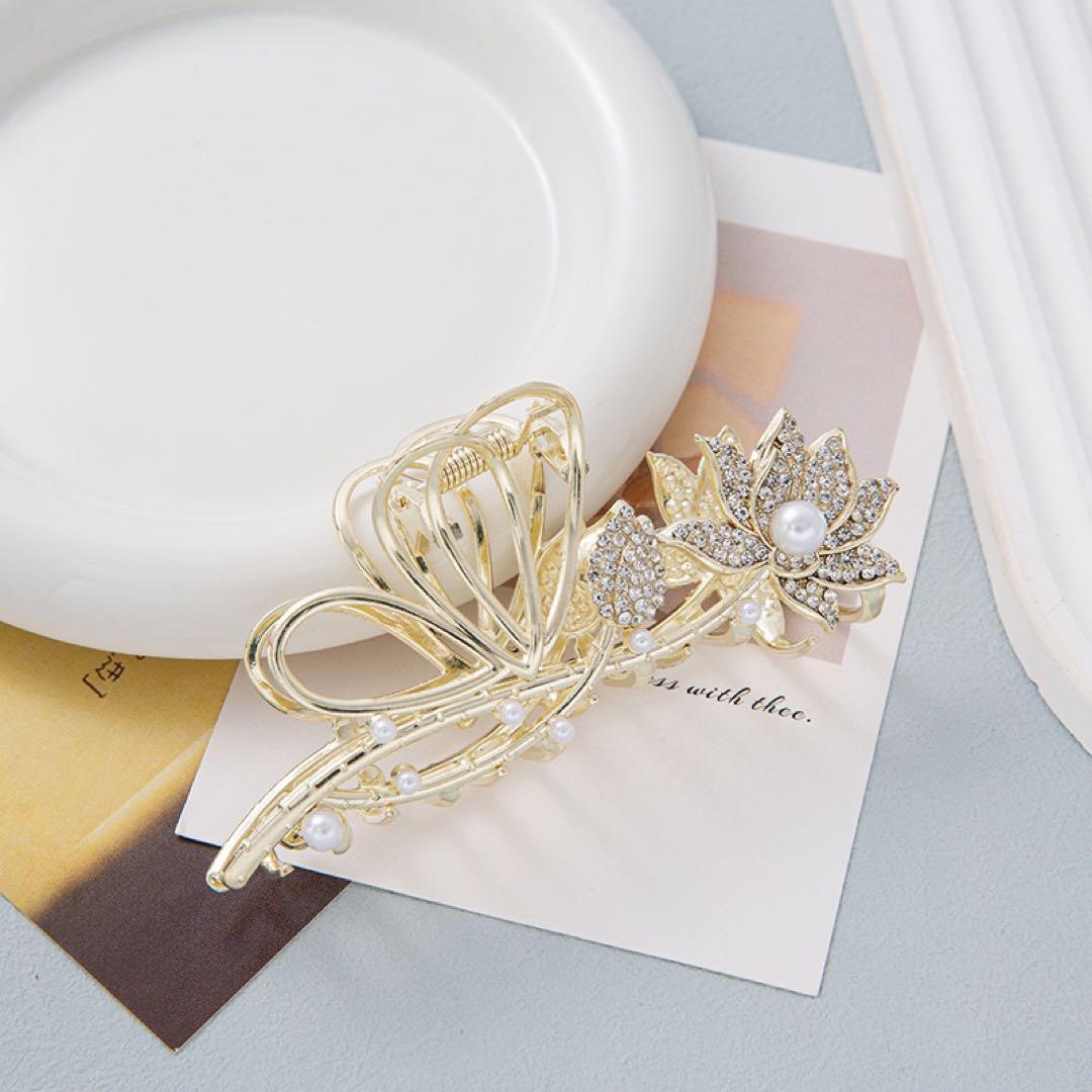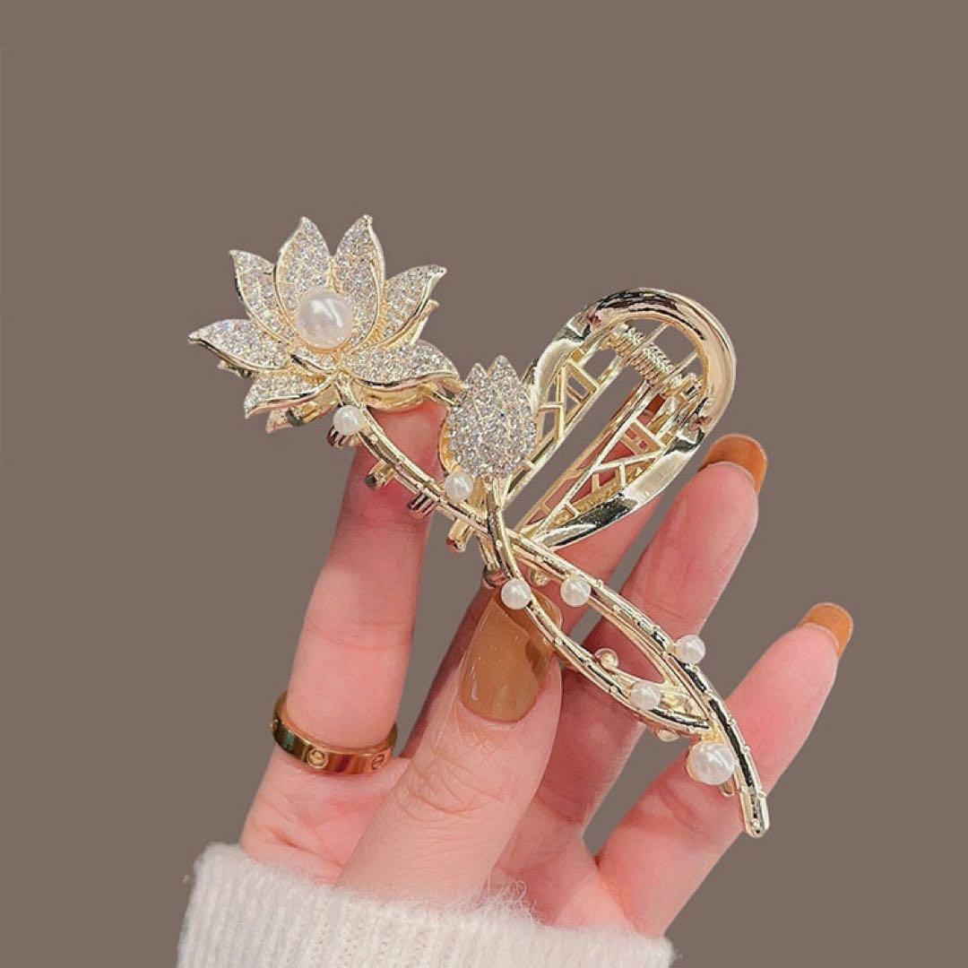 エレガントな蓮の花モチーフのヘアクリップ、パールとグリッターの装飾が特徴、とても綺麗です。