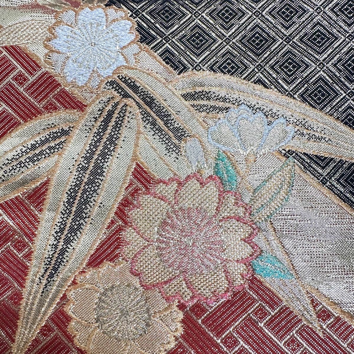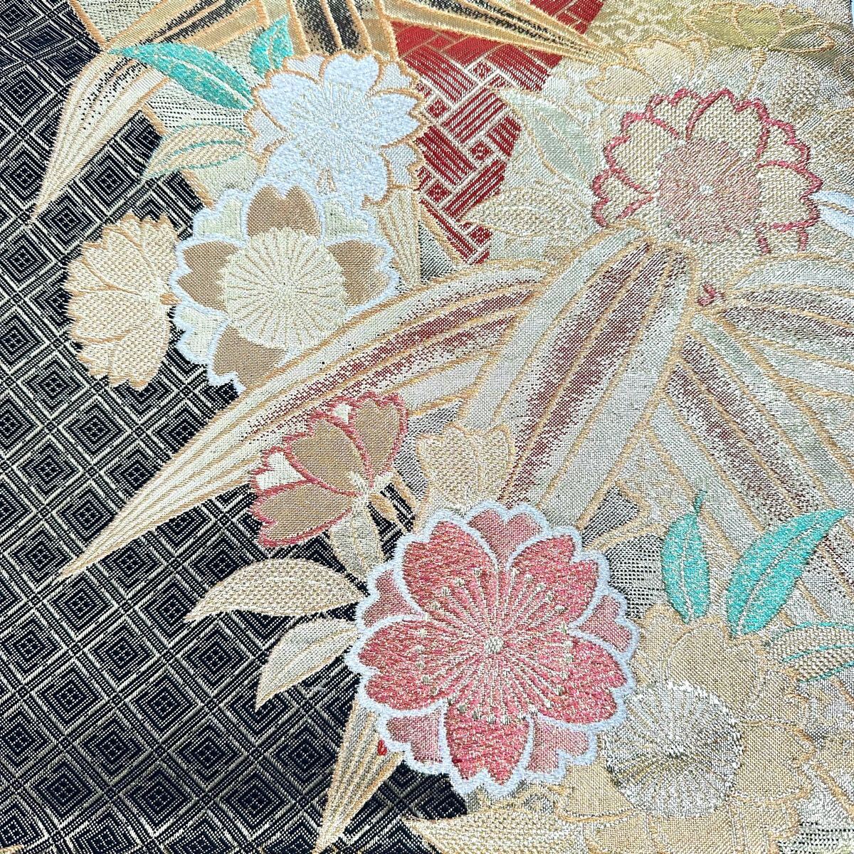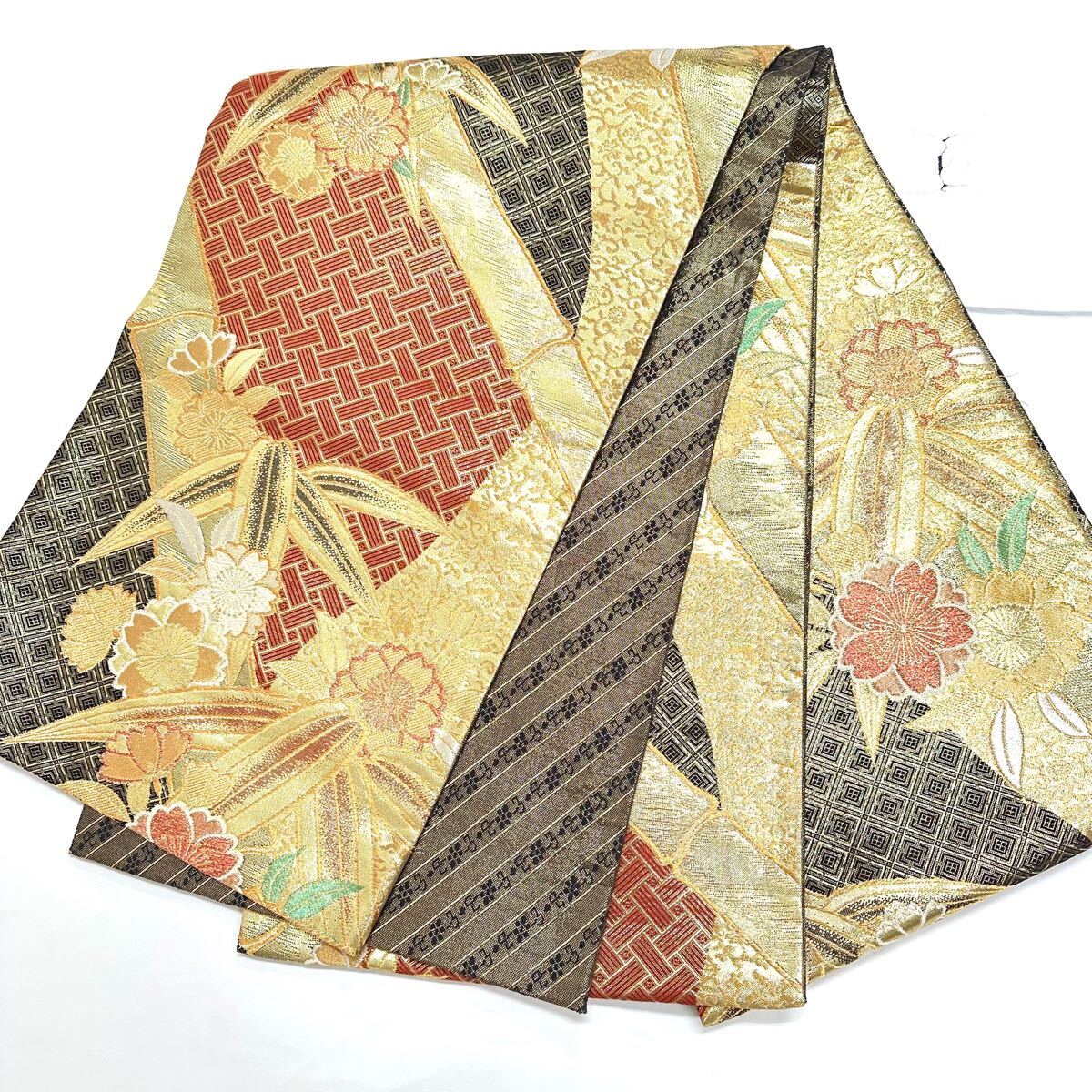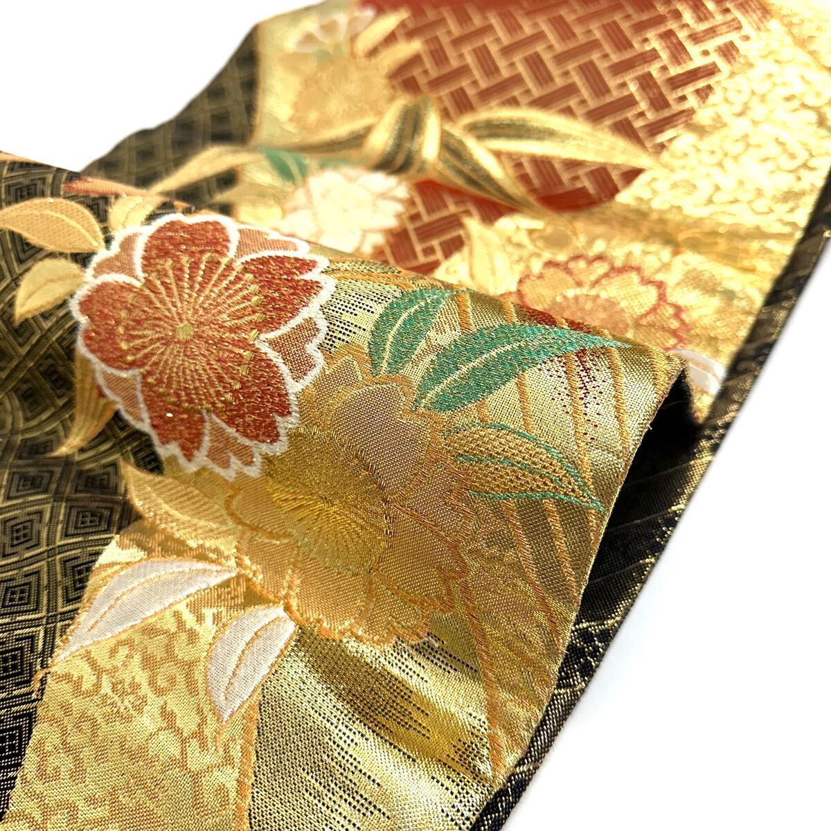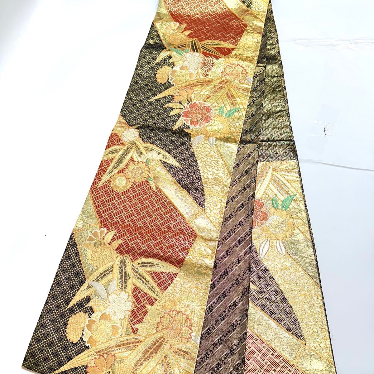 【七福】c427 振袖用帯 豪華 高級品 正絹 西陣 袋帯 六通 桜 笹 箔 金糸 銀糸 ゴールド 成人式 結婚式 卒業式 お祝い