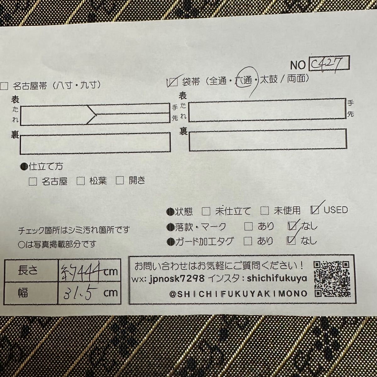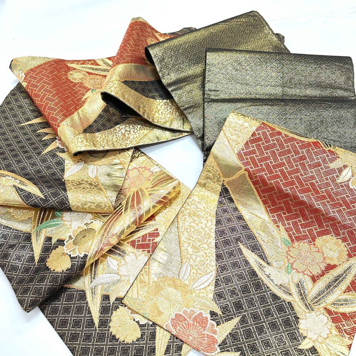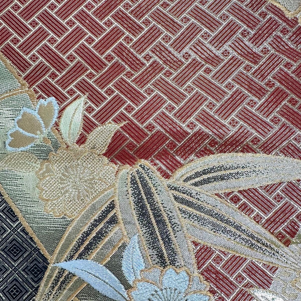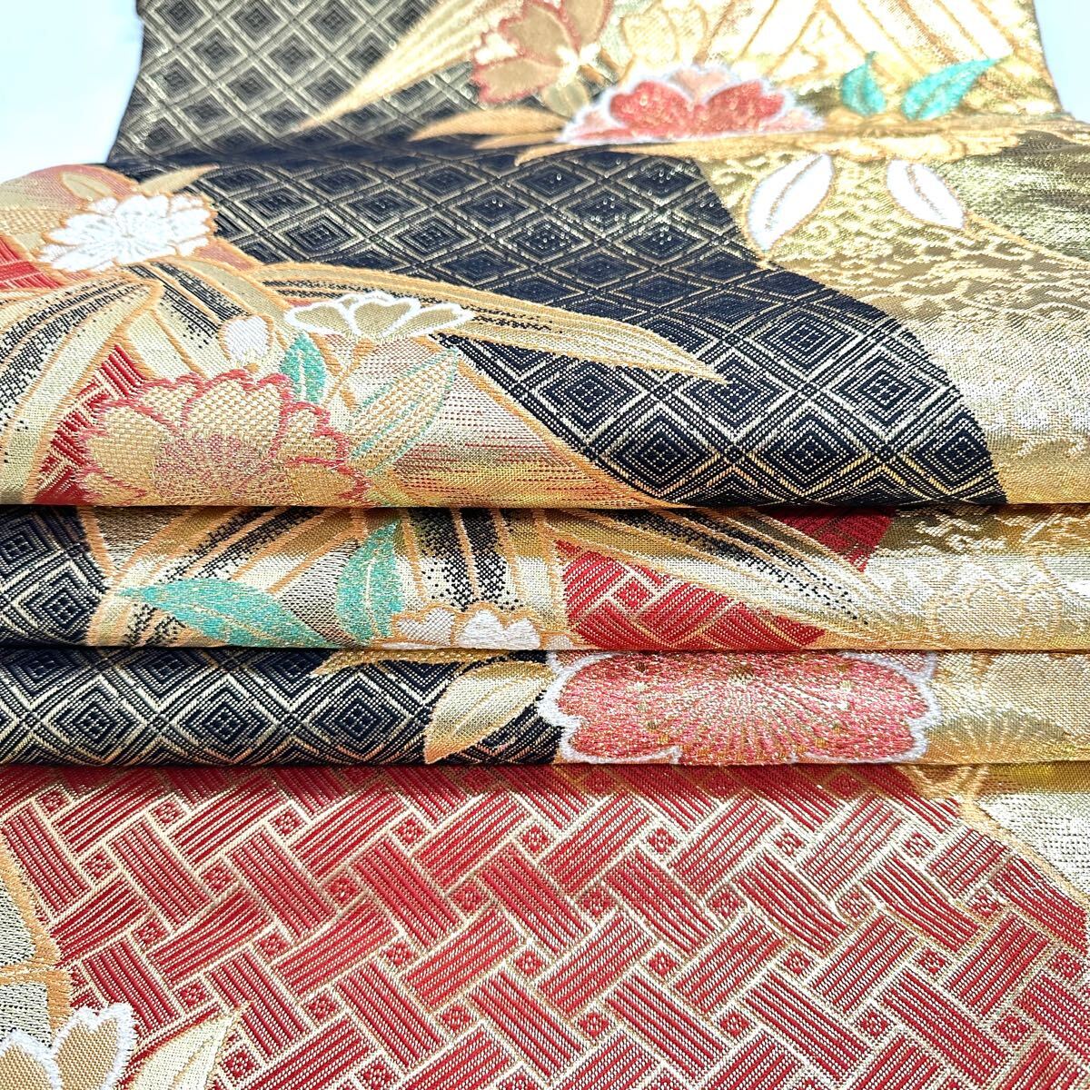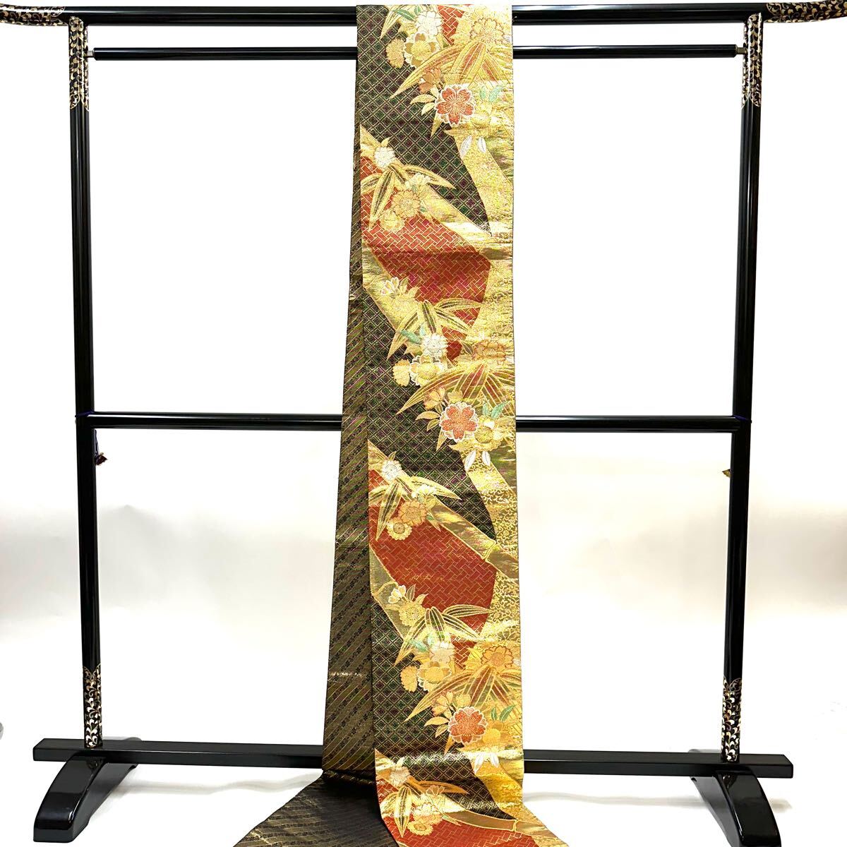 【七福】c427 振袖用帯 豪華 高級品 正絹 西陣 袋帯 六通 桜 笹 箔 金糸 銀糸 ゴールド 成人式 結婚式 卒業式 お祝い