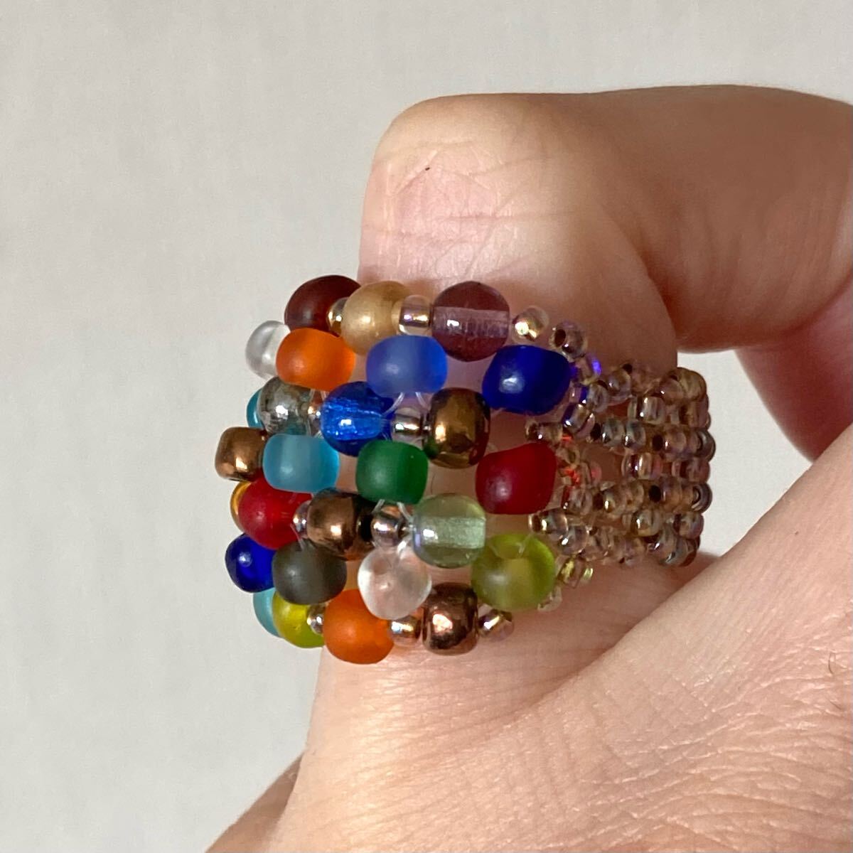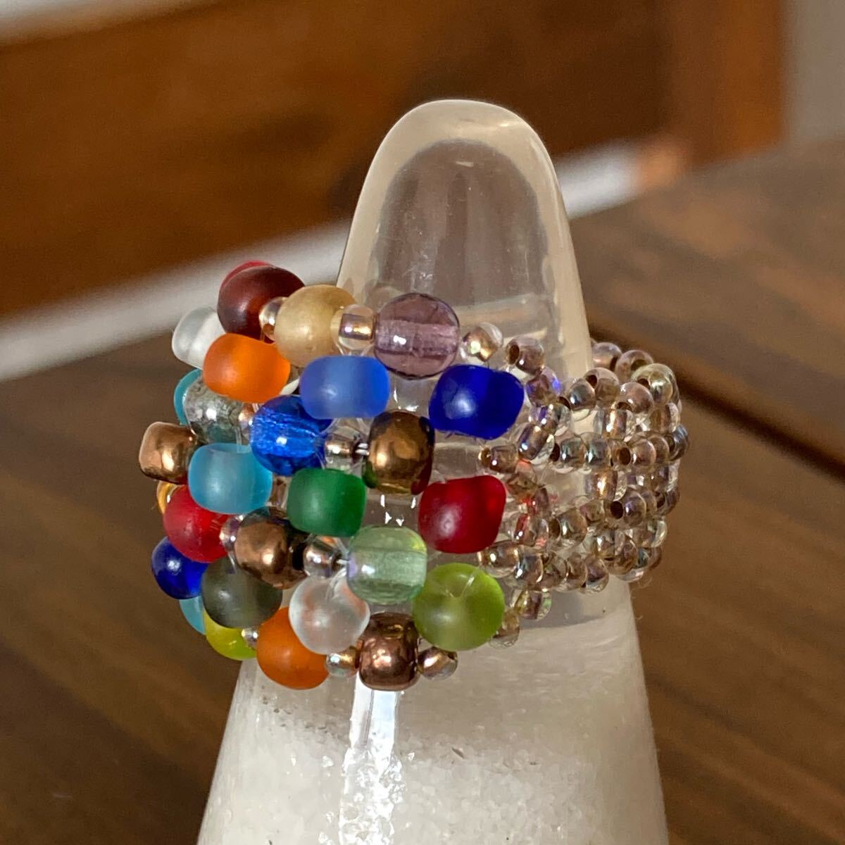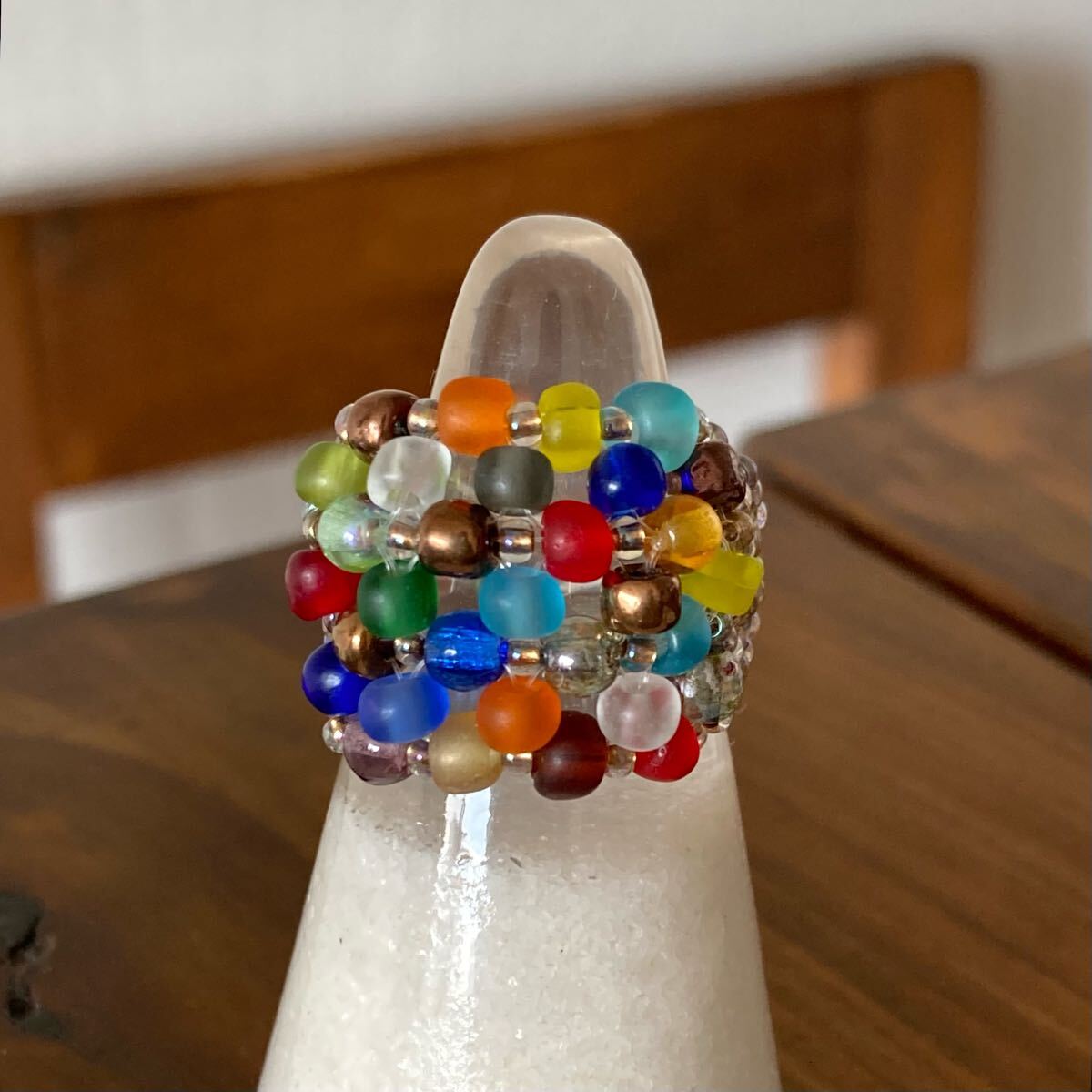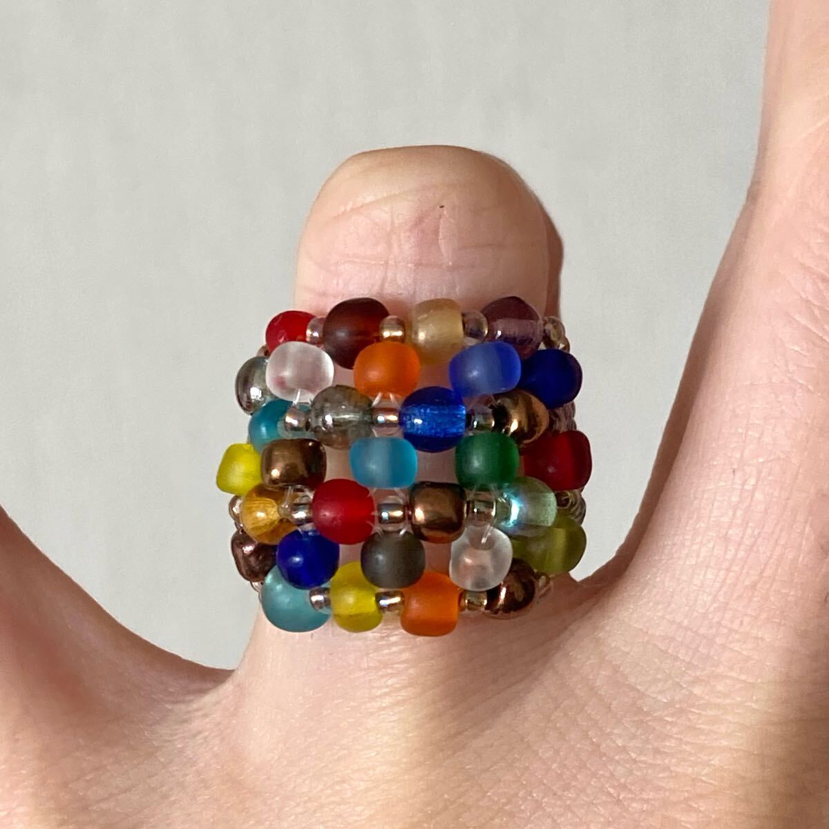 4mmのカラフルなフロストビーズ、4mmのラウンドガラスビーズ、クリアゴールド系の丸小ビーズで作ったリングです。