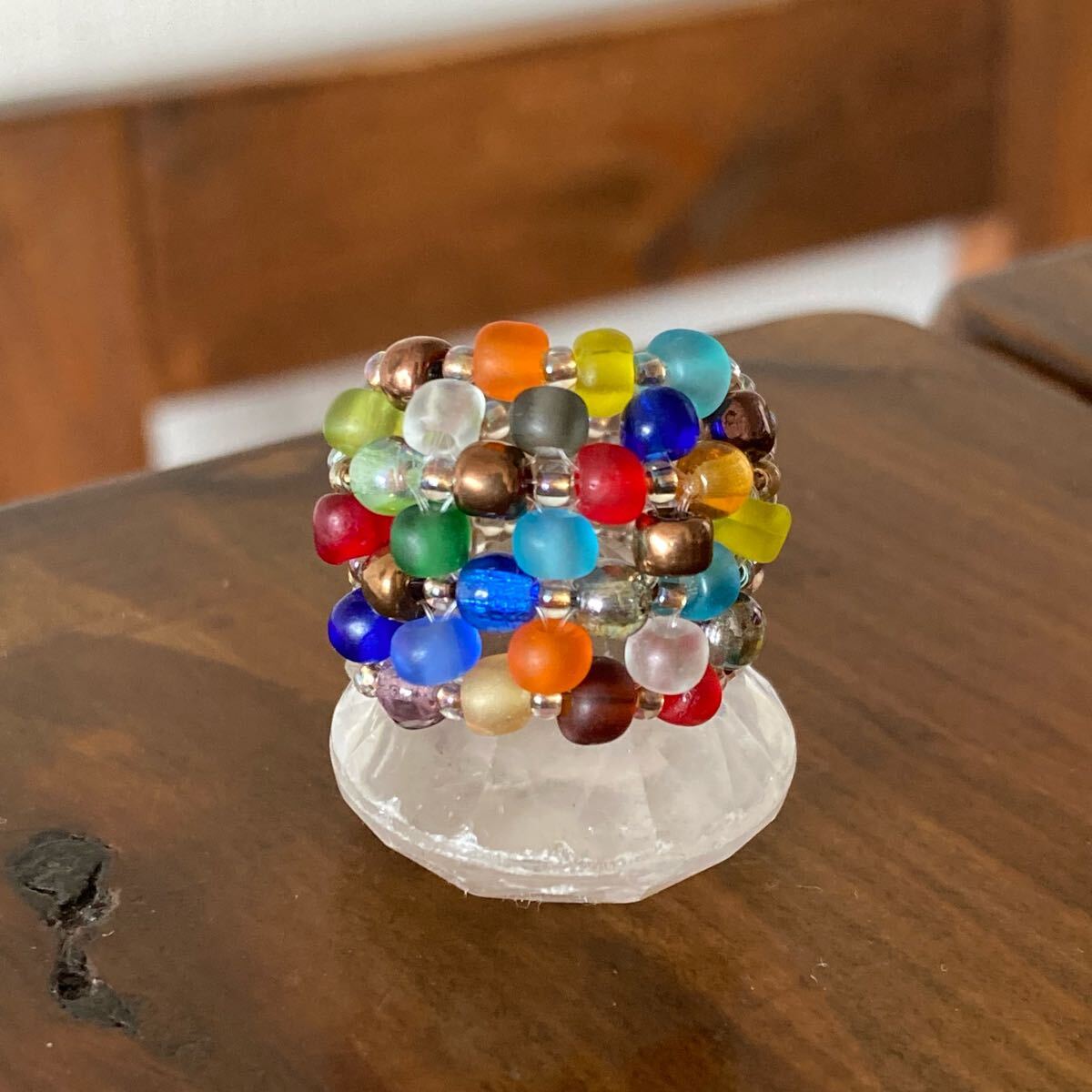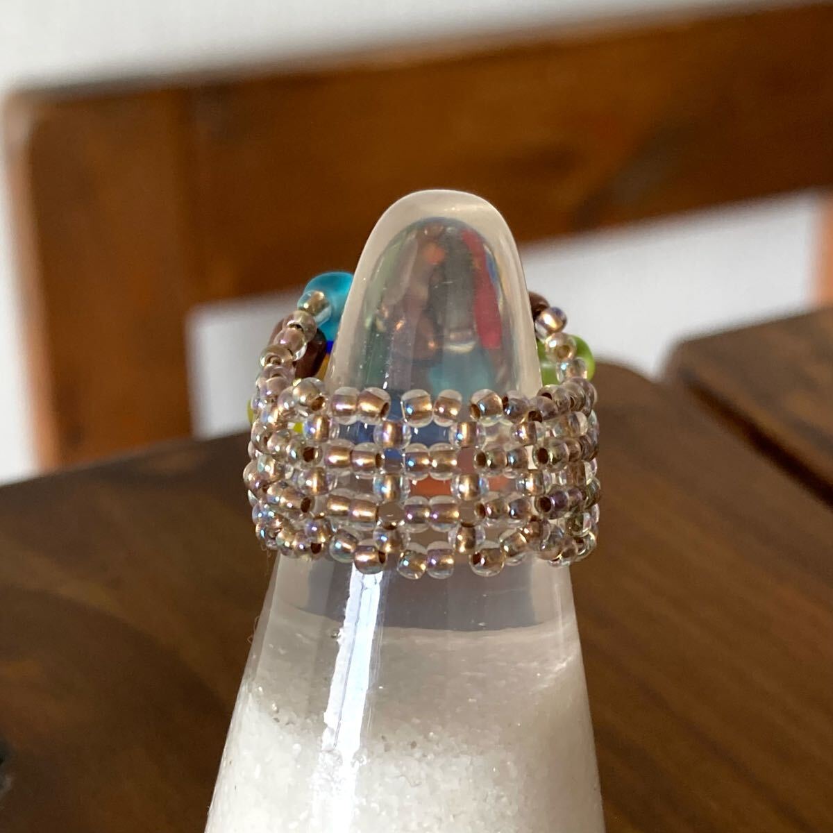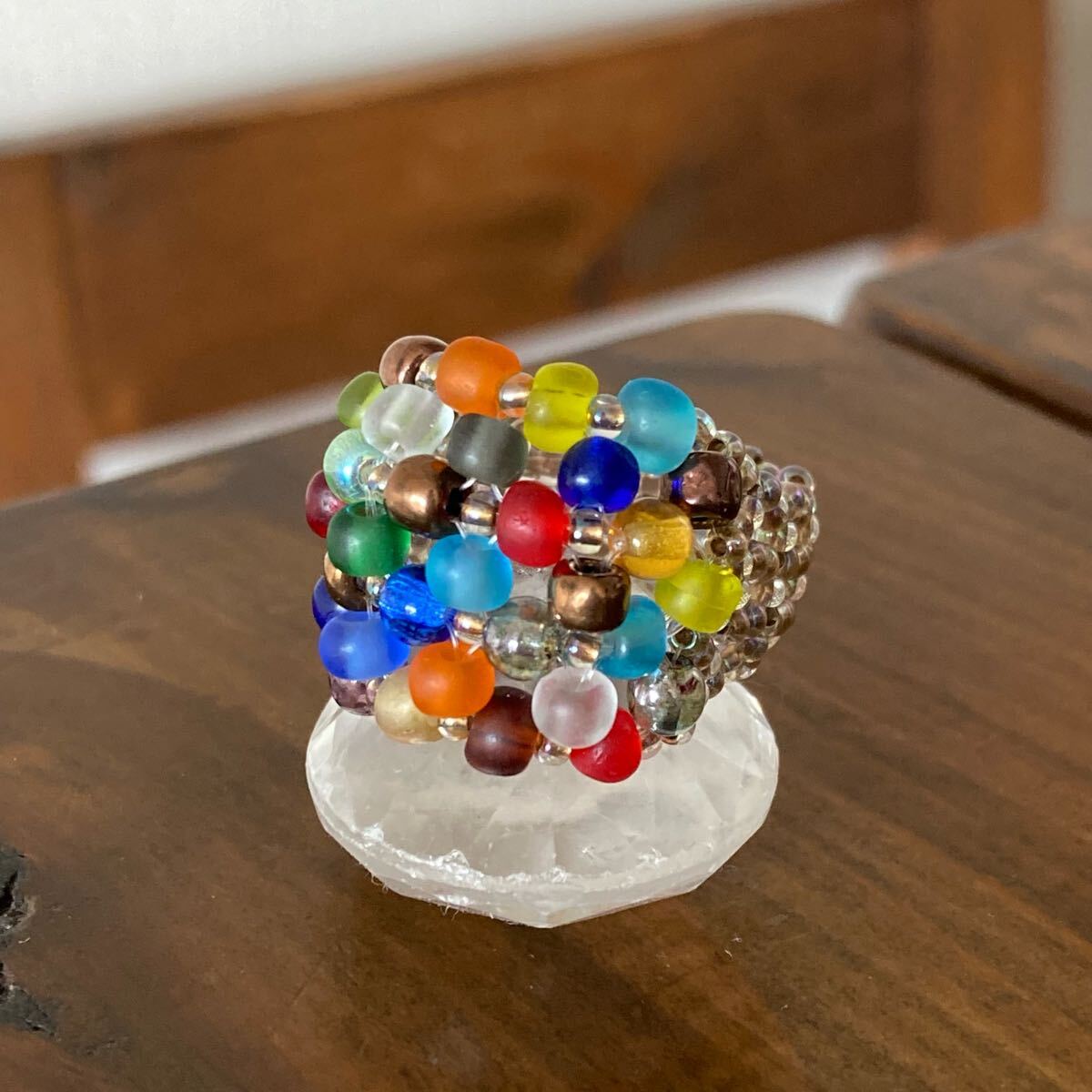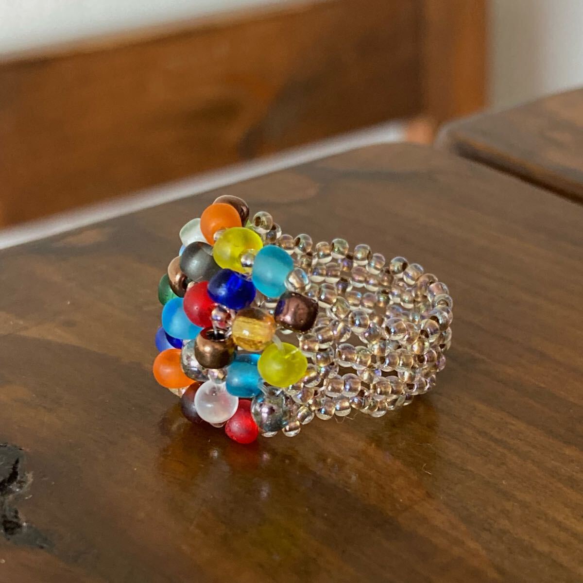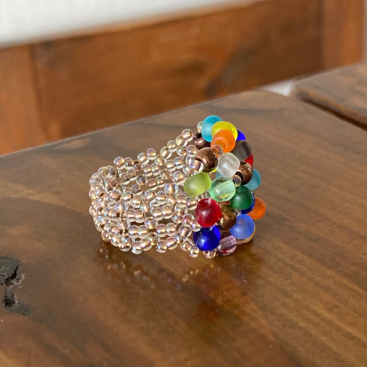 4mmのカラフルなフロストビーズ、4mmのラウンドガラスビーズ、クリアゴールド系の丸小ビーズで作ったリングです。