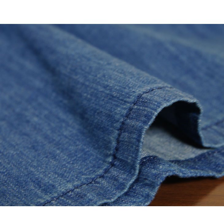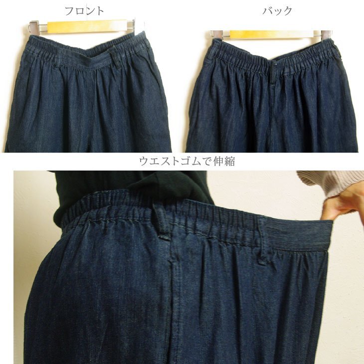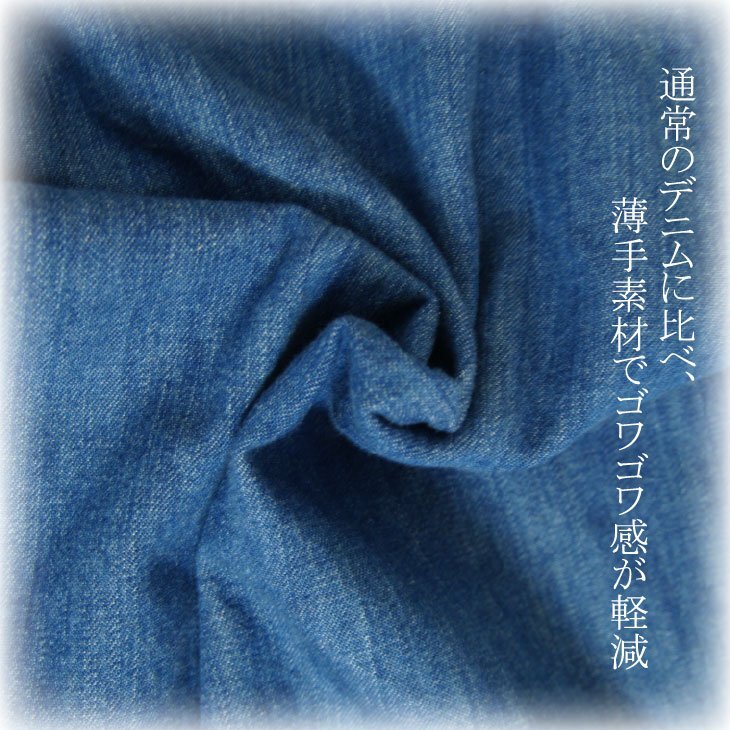 通常のデニムに比べ、薄手のオンスを使用しているのでゴワゴワ感が軽減され、ウエストが背ゴムで楽に着用ができます。