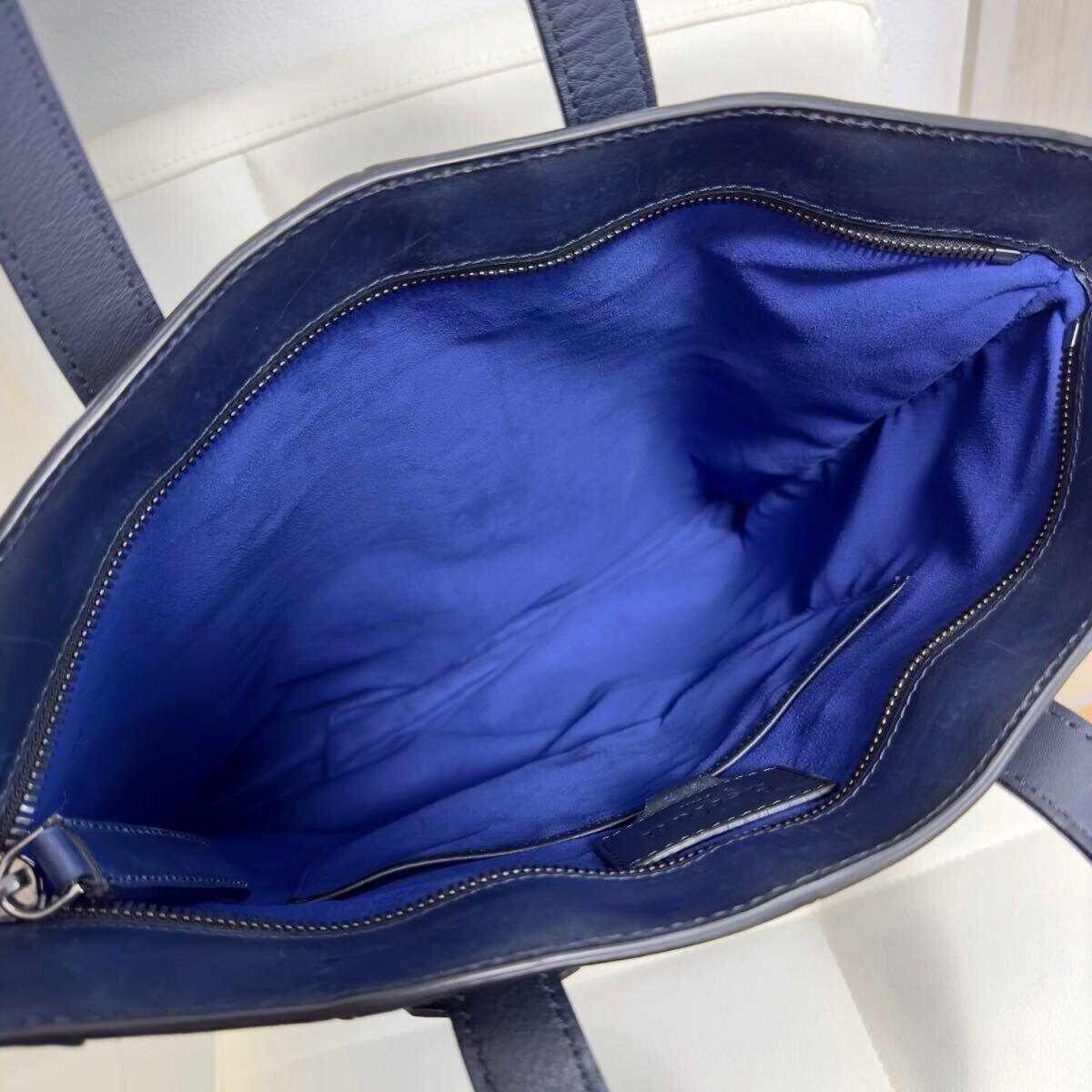 パネル切り替えされた長方形のシンプルなトートバッグで、ブルーパティーヌを施したカリグラフィースクリットレザーを部分的に切り替えております。
