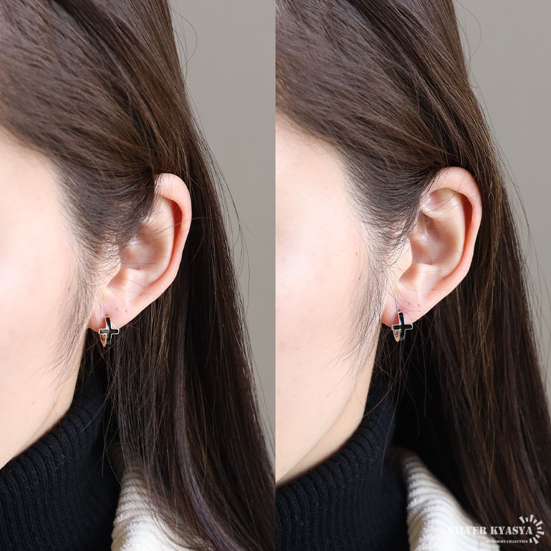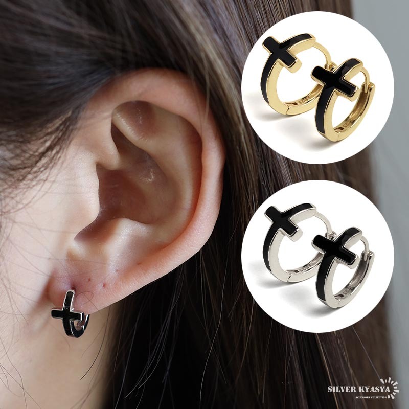 商品概要 | ■ITEM DETAIL 存在感あるブラッククロスの上品なフープピアス。ゴールド/シルバーの2カラーから選べます。 ■SILVER925素材 シルバー925は、銀含有率(純度)92.5%を示し、一般的に純銀として扱われています。サビや劣化等がほとんどなく金属アレルギーも出にくいとされており、アクセサリーとして重宝される金属です。 |