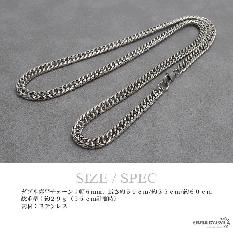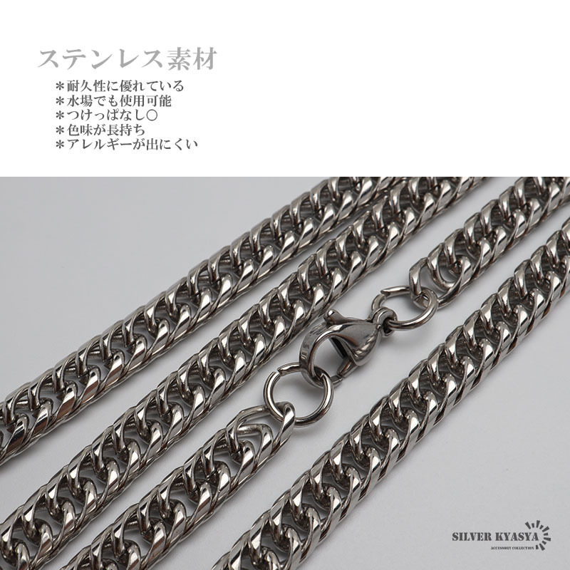 | 商品概要 | ■ITEM DETAIL 厚みがあり、なめらかな質感のダブル喜平チェーン。カット面がなく主張しすぎない大人の雰囲気の輝きを放ってくれます。 ■ステンレス素材を使用 金属部分は頑丈なことで知られるステンレス素材を採用。耐久性はもちろん耐水性も高く水場での着用も可能。金属アレルギーも出にくいとされている金属です。 |