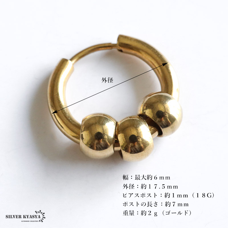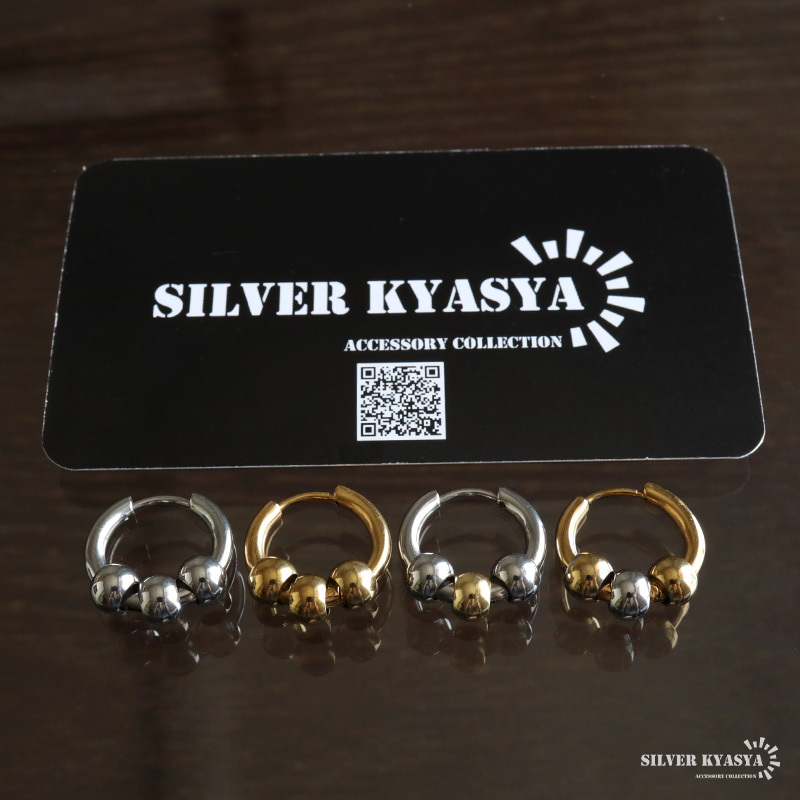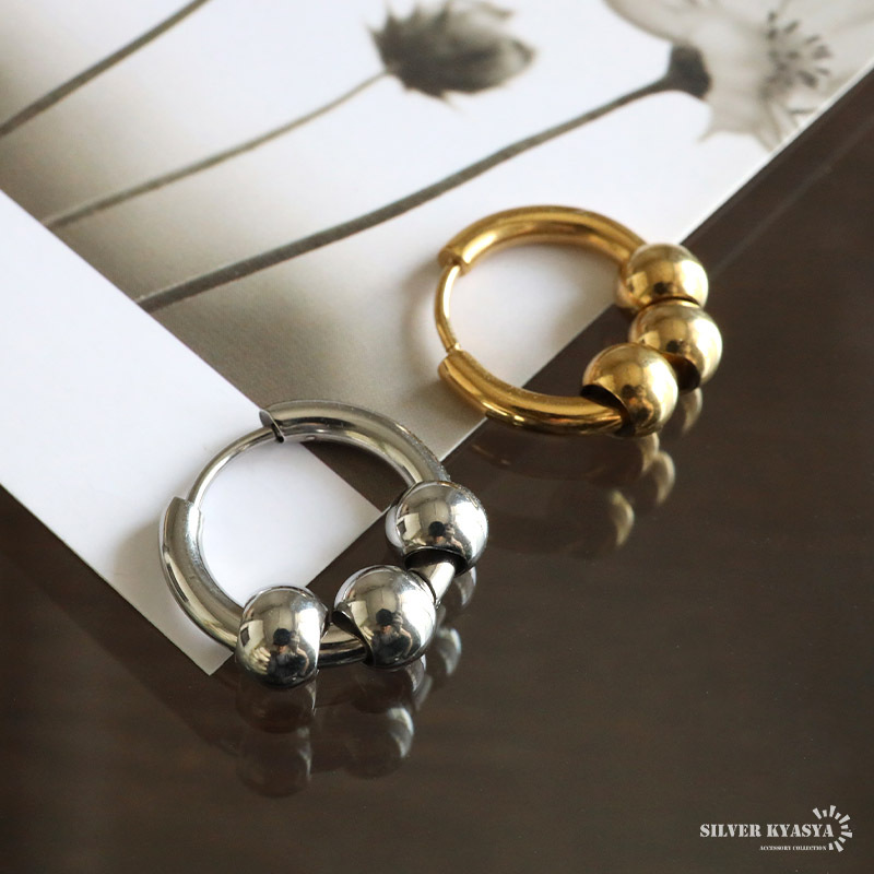 3連ボールをセットしたフープピアス。メタリックな質感でさりげない存在感を演出してくれます。カラーは4タイプからお選びいただけます。