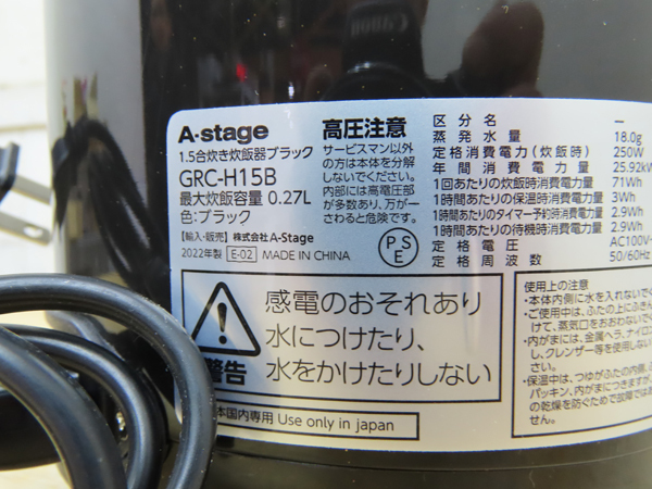 A-Stage・炊飯器・2022年製・GRC-H15B・1.5合炊き・中古品・151279