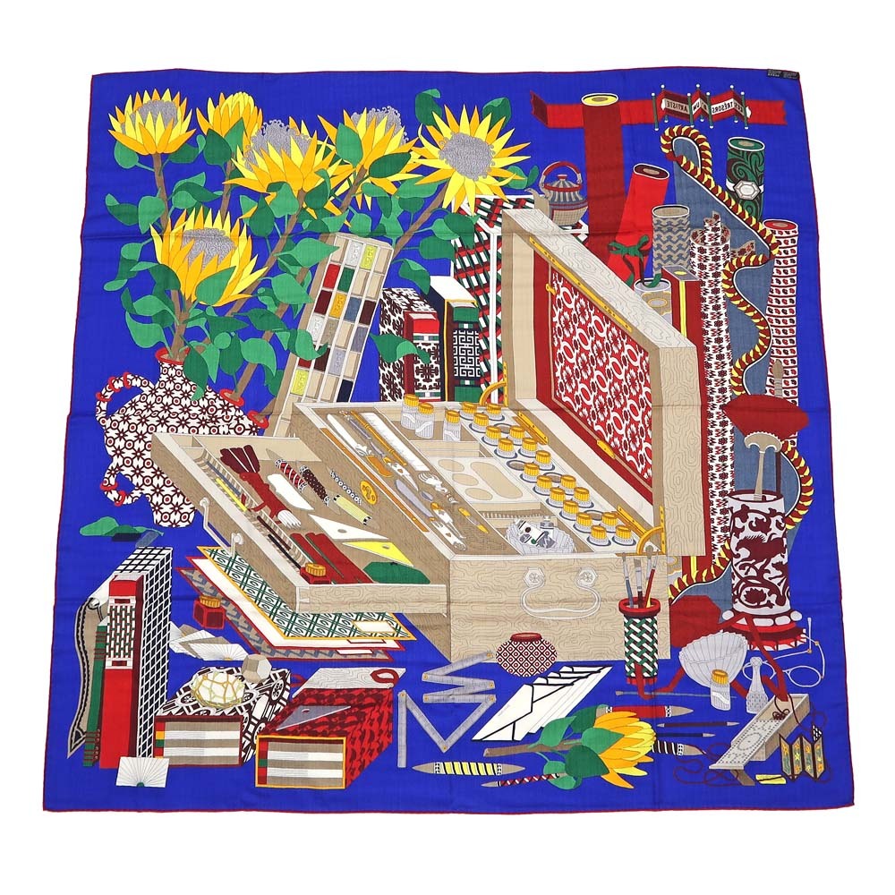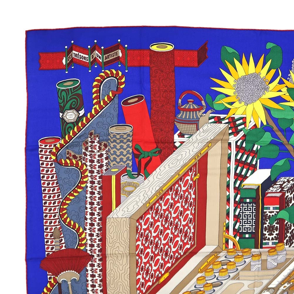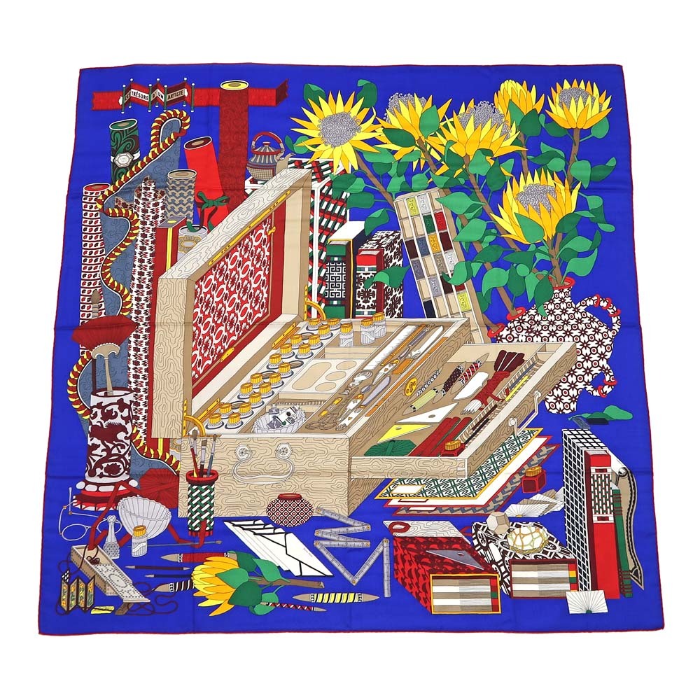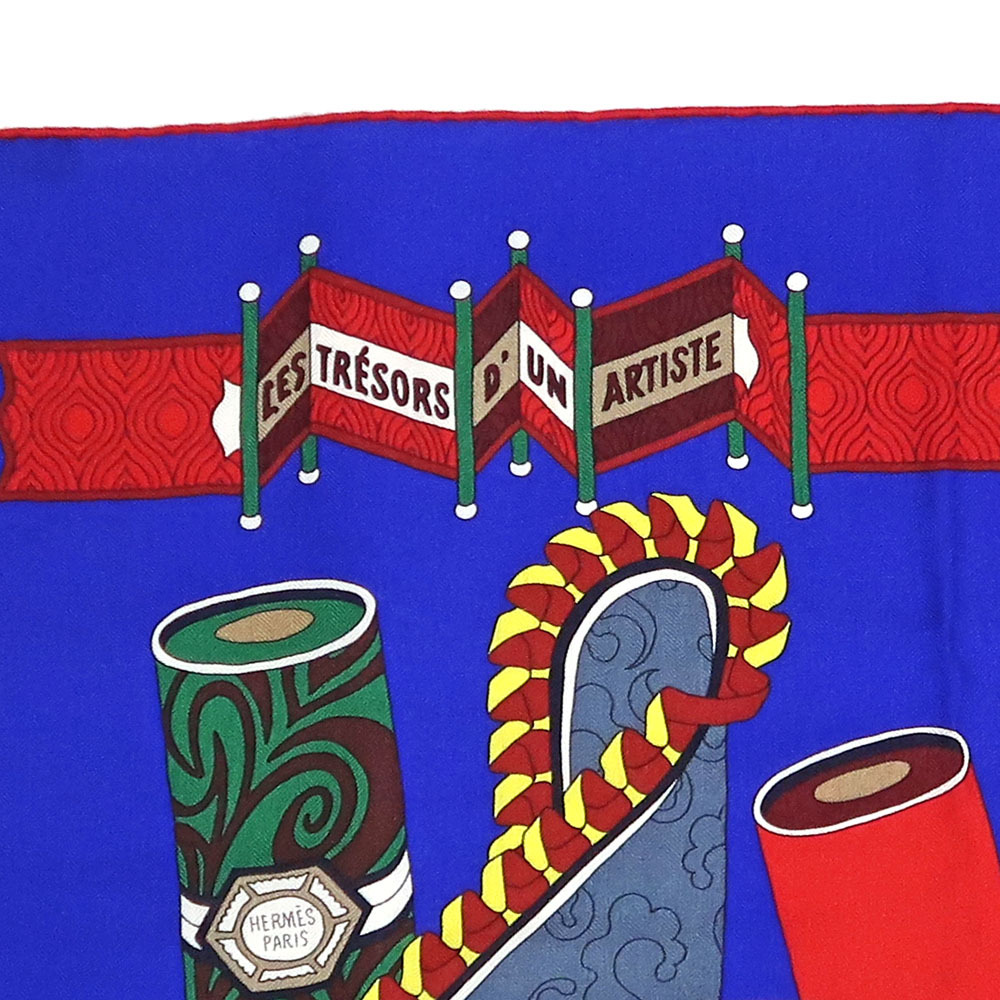 【名東】エルメス カレ 140 LES TRESORS D UN ARTISTE スカーフ カシミヤ シルク ブルー系 小物 レディース その他【未使用】