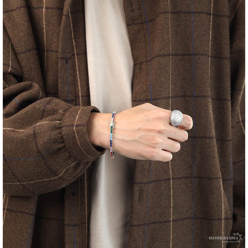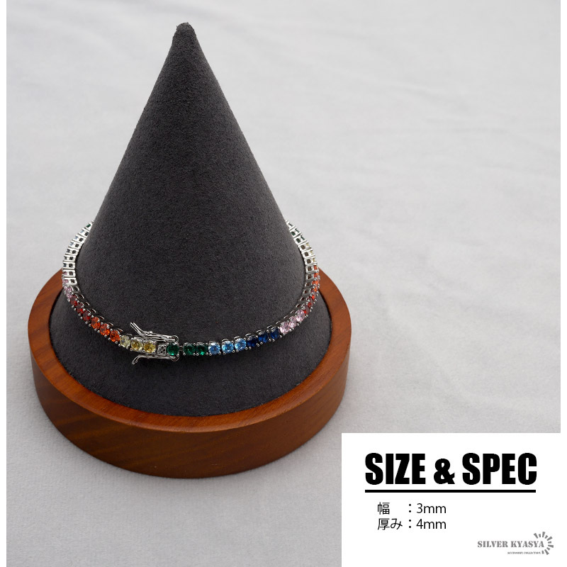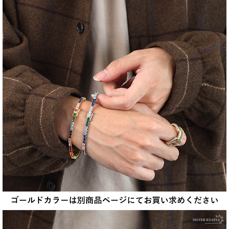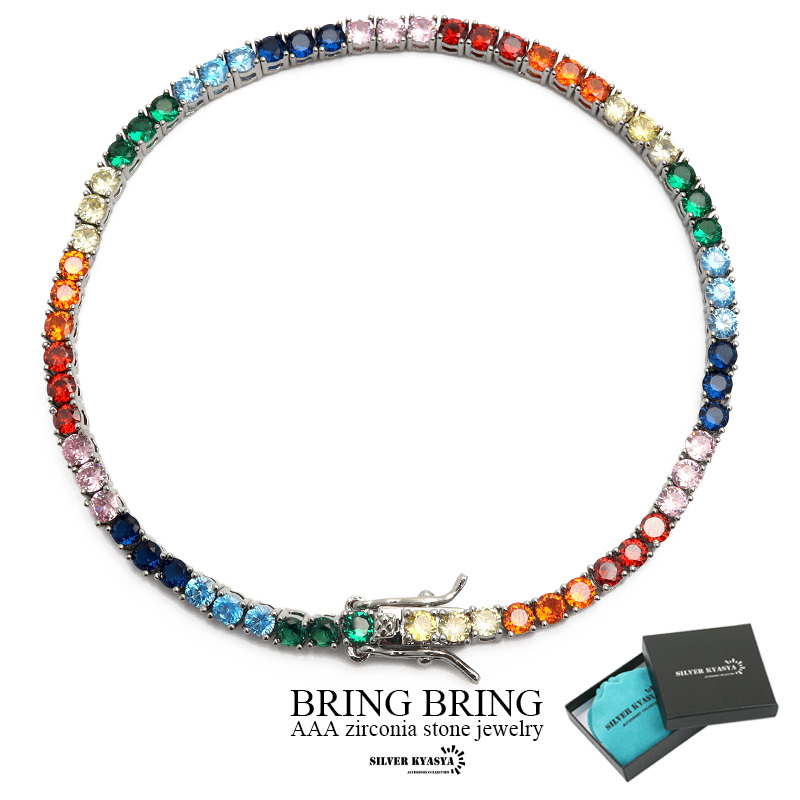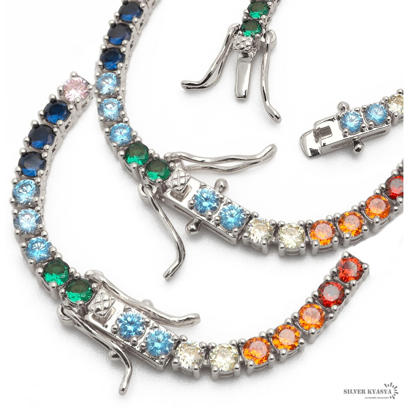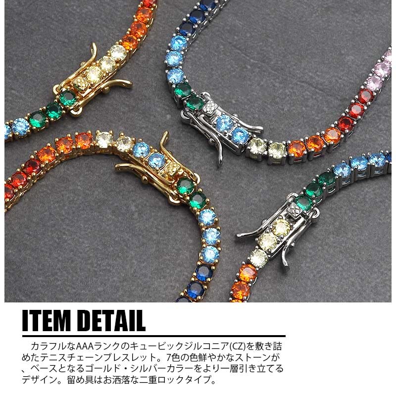 カラフルなAAAランクのキュービックジルコニア(CZ)を敷き詰めたテニスチェーンブレスレット。7色の色鮮やかなストーンが、ベースとなるゴールド・シルバーカラーをより一層引き立てるデザイン。留め具はお洒落な二重ロックタイプ。