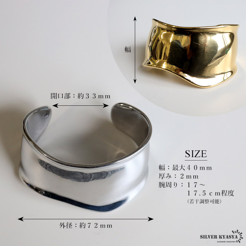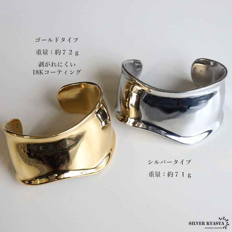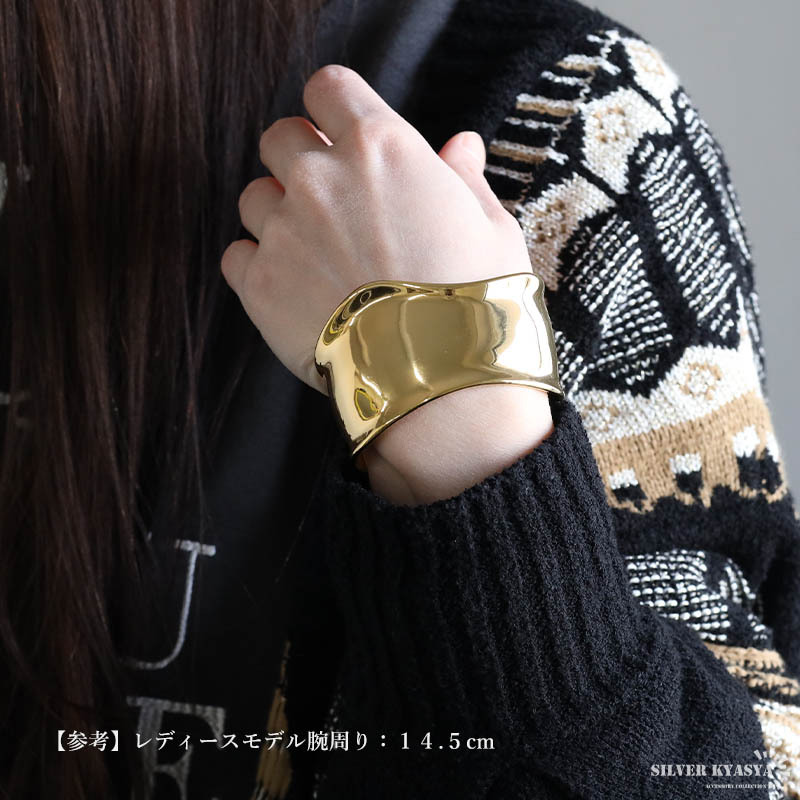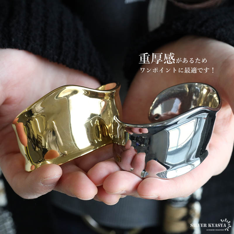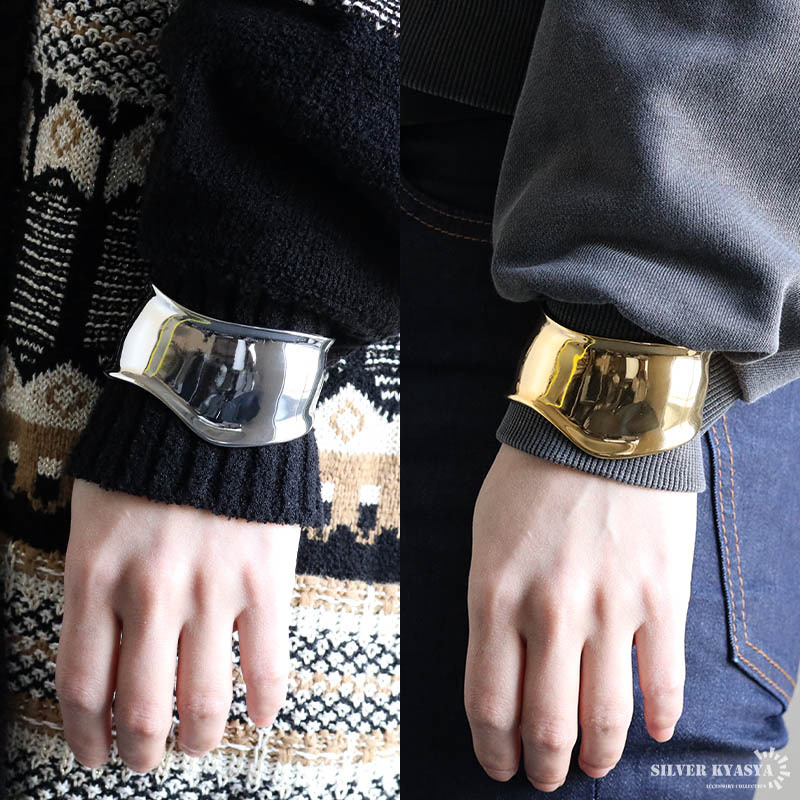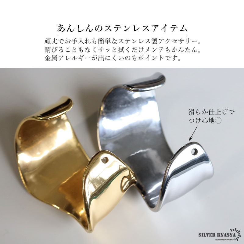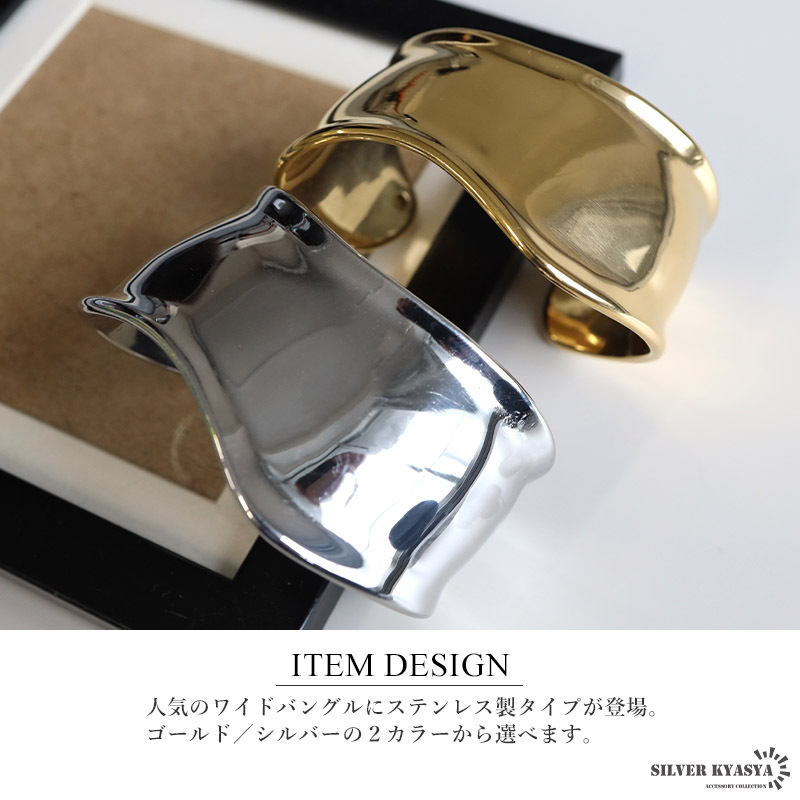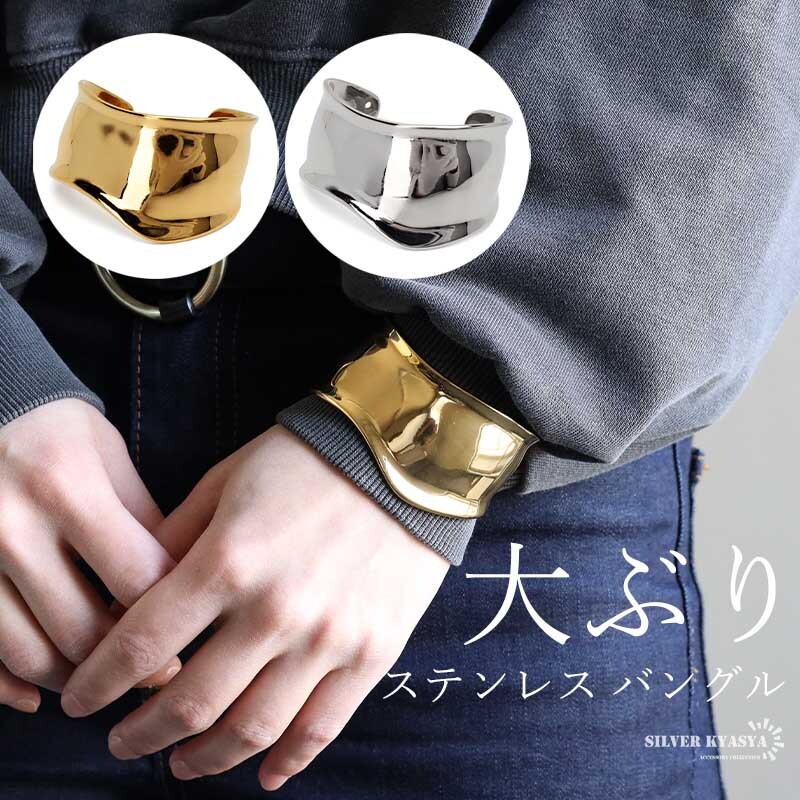 重厚感あるデザインのワイドバングルにステンレス製タイプが登場。人気のデザインでさらっとお洒落を楽しめます。ゴールド/シルバーの2カラー。