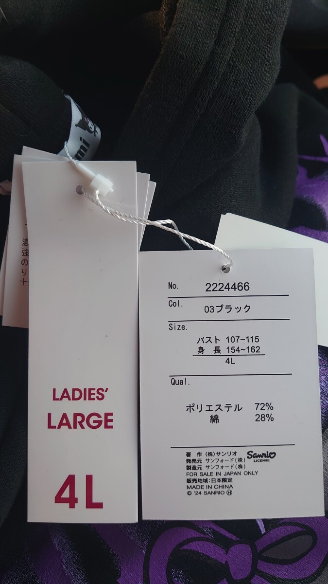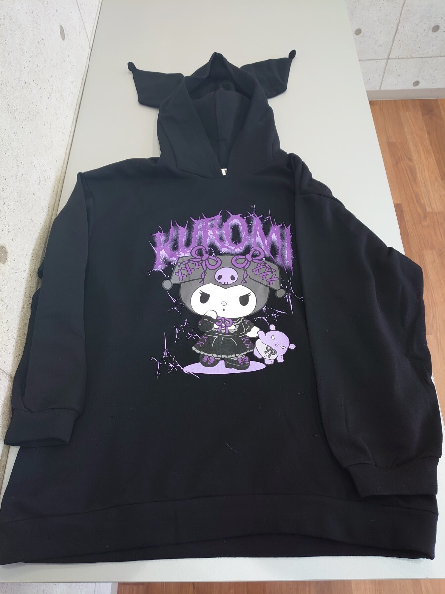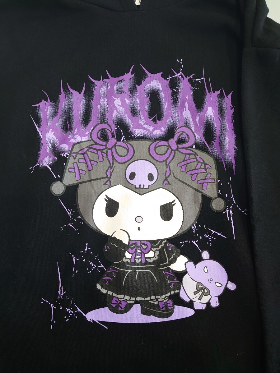 このパーカーは、人気キャラクターのクロミが描かれたユニークなデザインが特徴です。紫色のグラフィックが目を引き、個性的なスタイルを演出します。