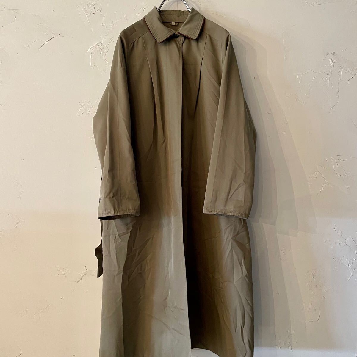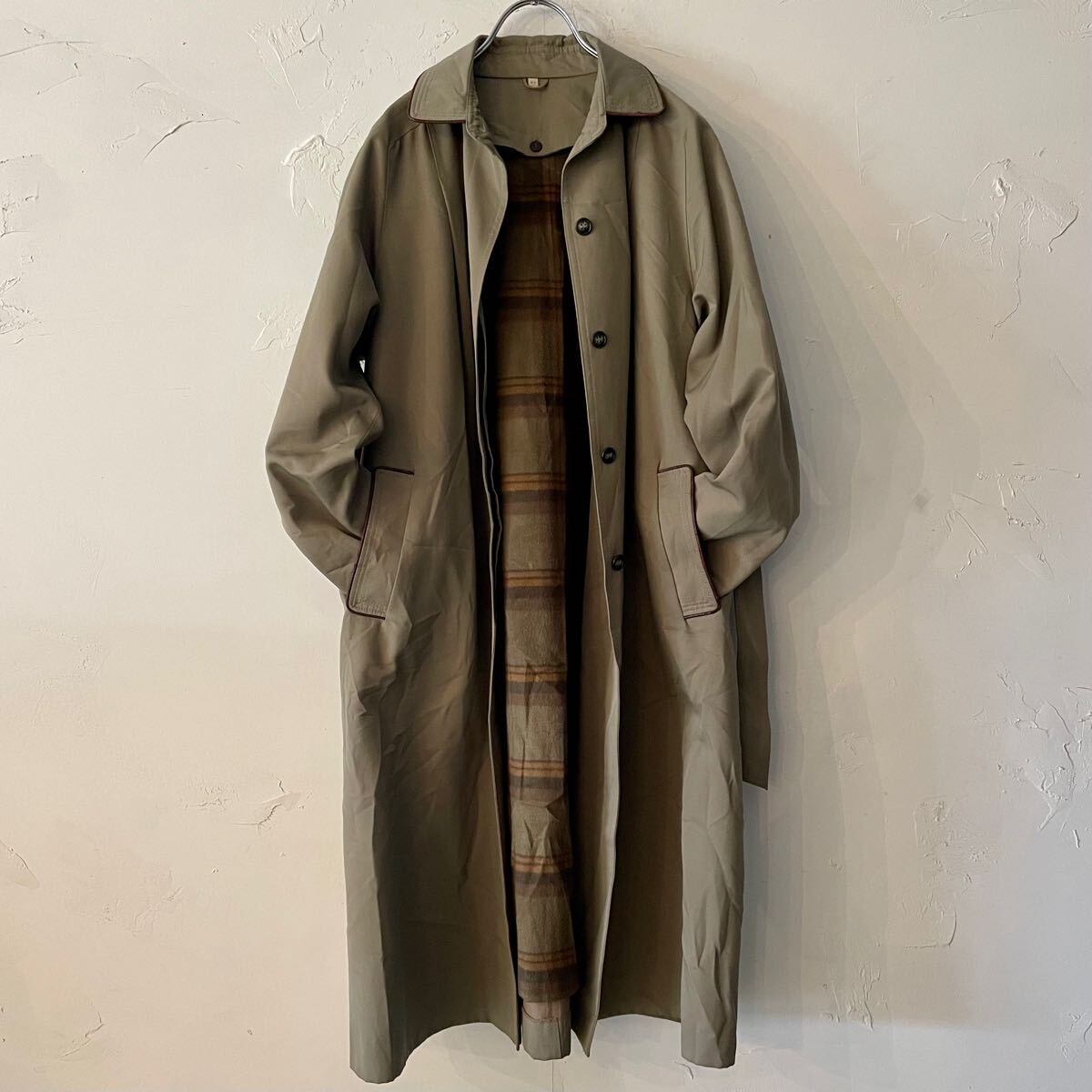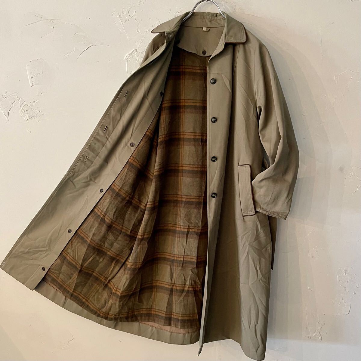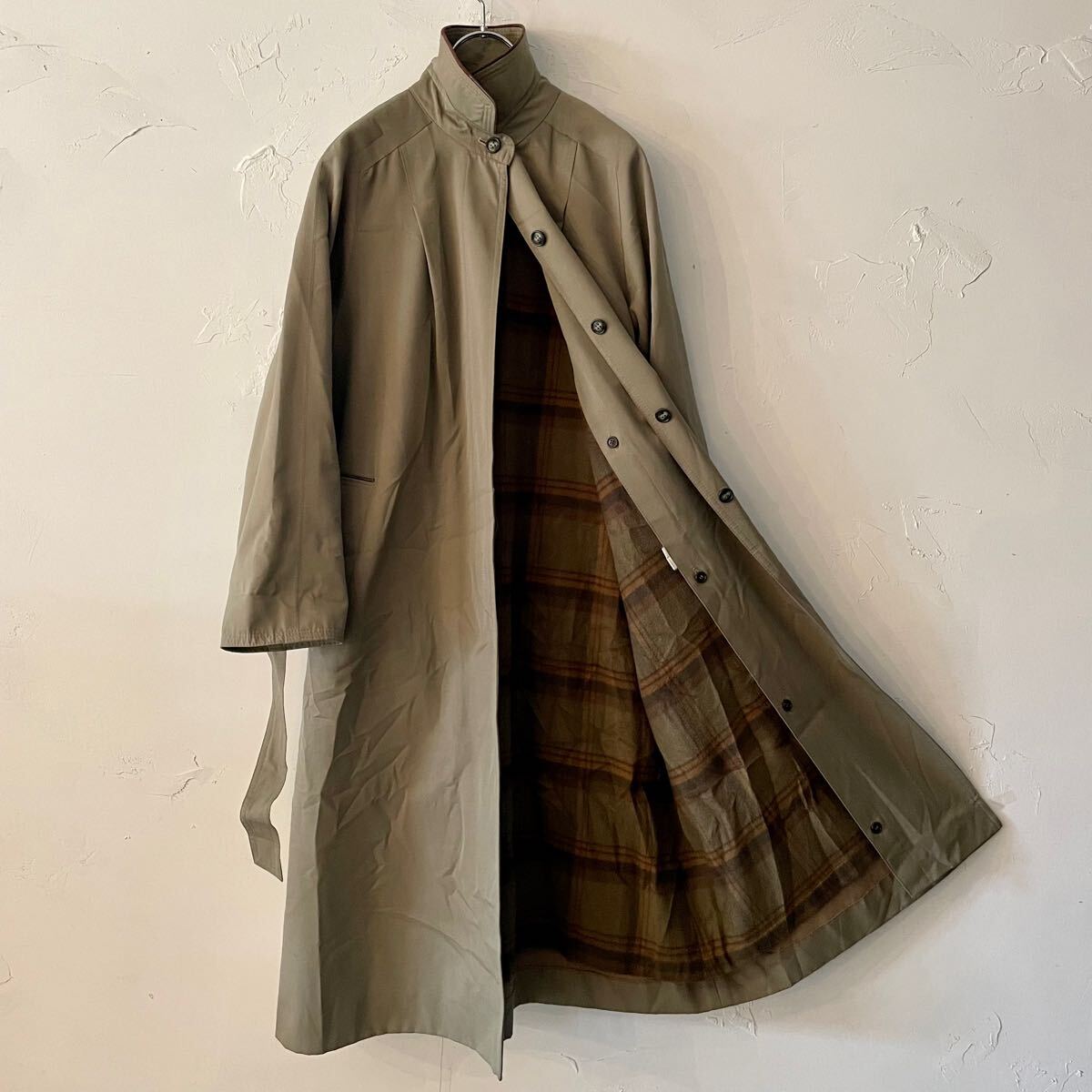 ヴィンテージ ステンカラーコート ロング丈タックコート ラグラン グレーカーキ色 比翼仕立て ライナー チェック柄 M レディース古着 5