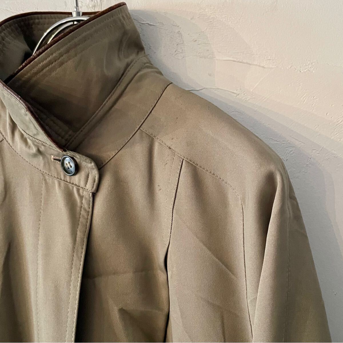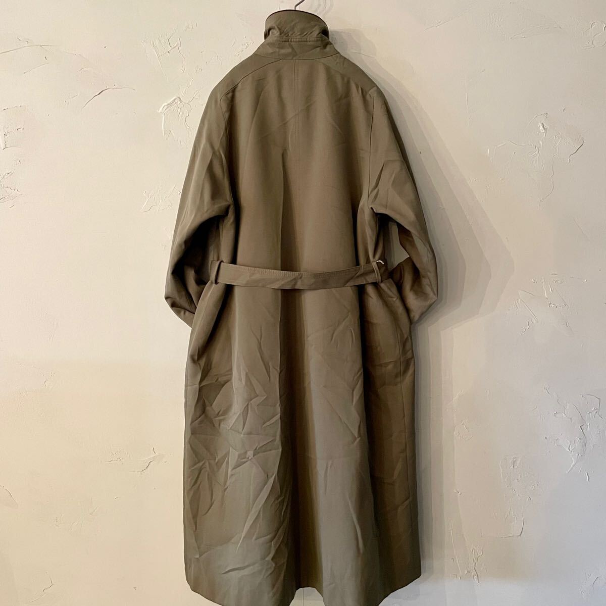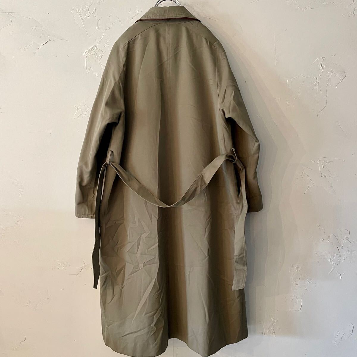 表生地 コットン15% ポリエステル85% 光沢感のある滑らかな生地感です。グレーカーキ色。ライナーチェック柄脱着可能。比翼仕立て。ベルト付き。レディースM。ラグランスリーブで肩のおちる良いサイズ感。フロント タック入りで広がりのあるフォルムの良い品です。