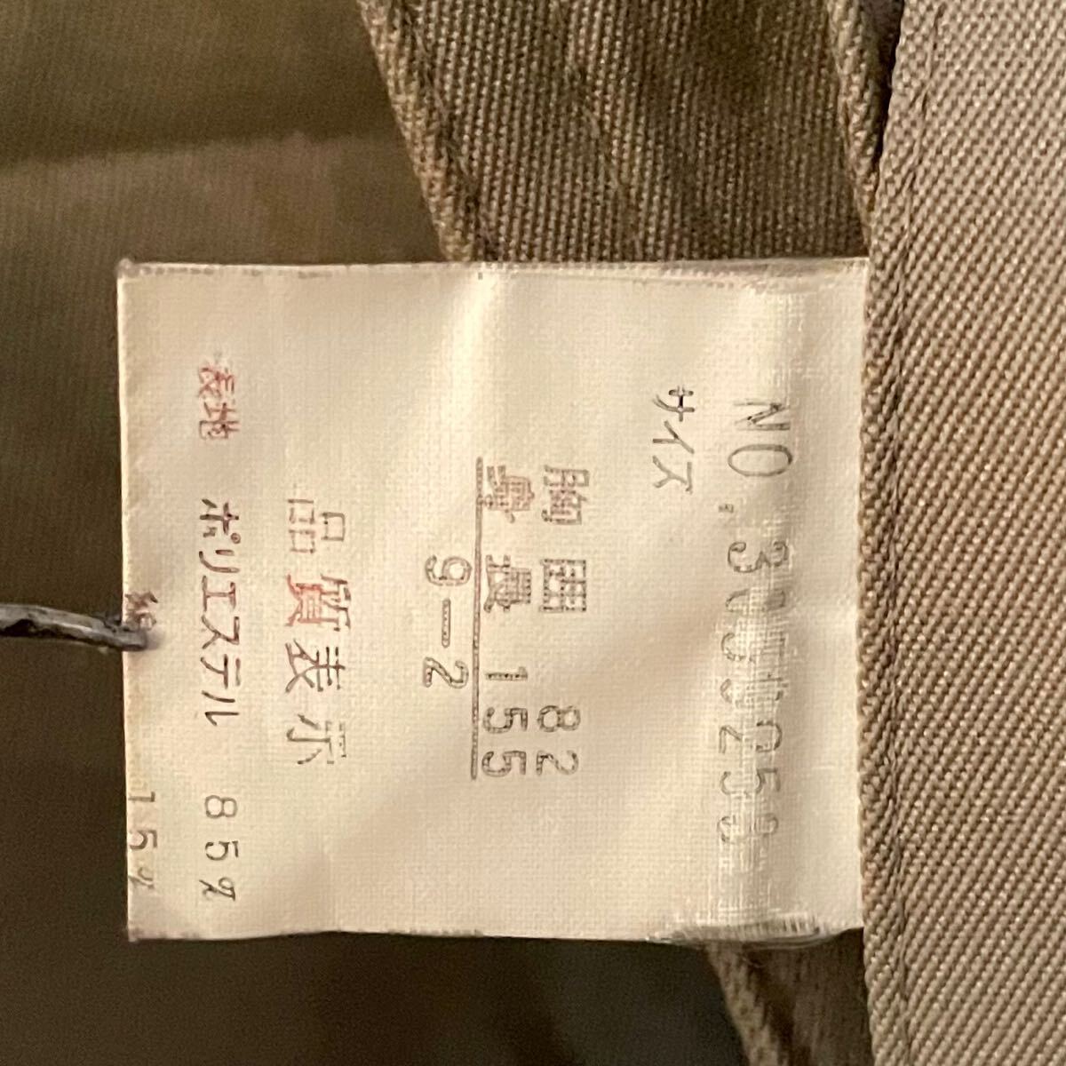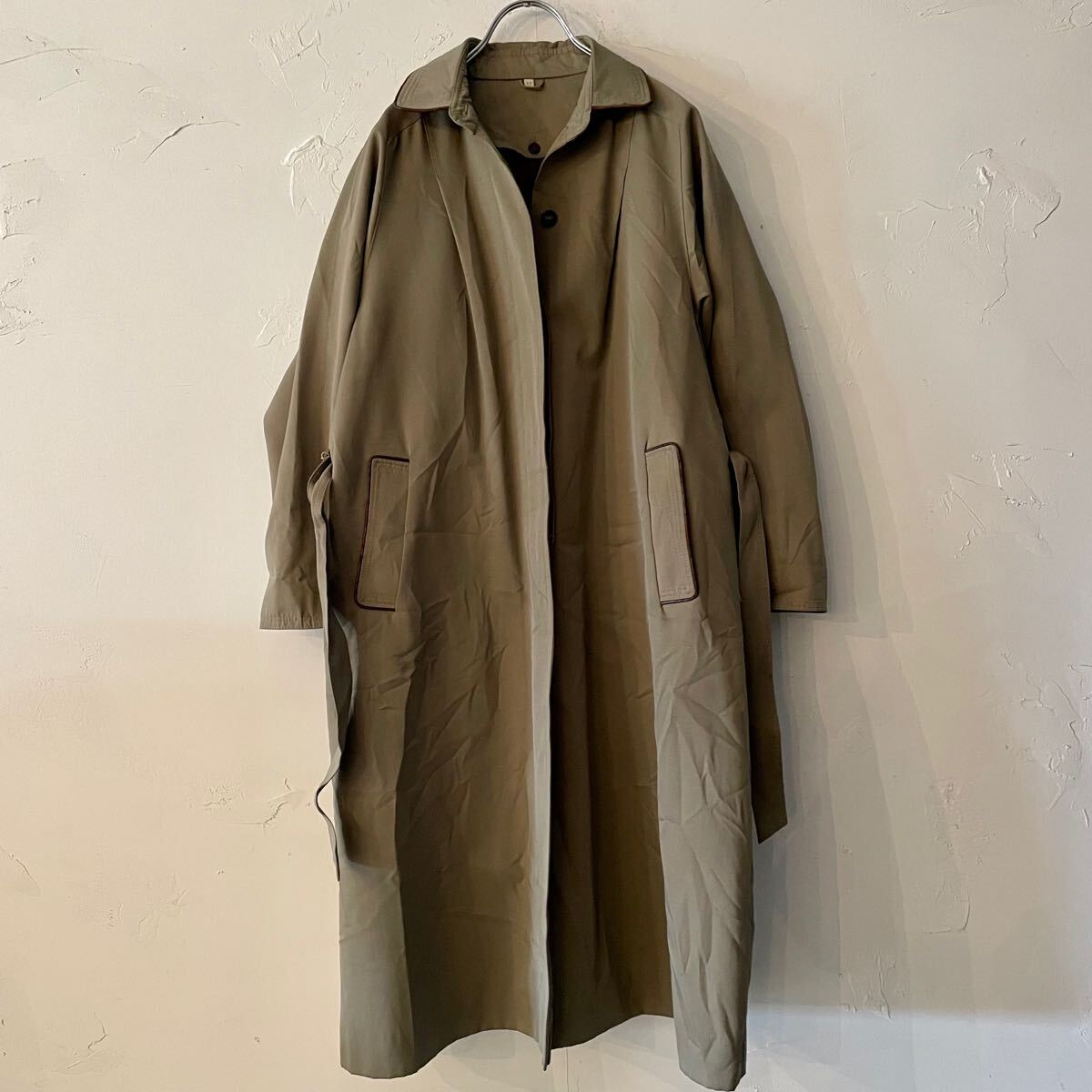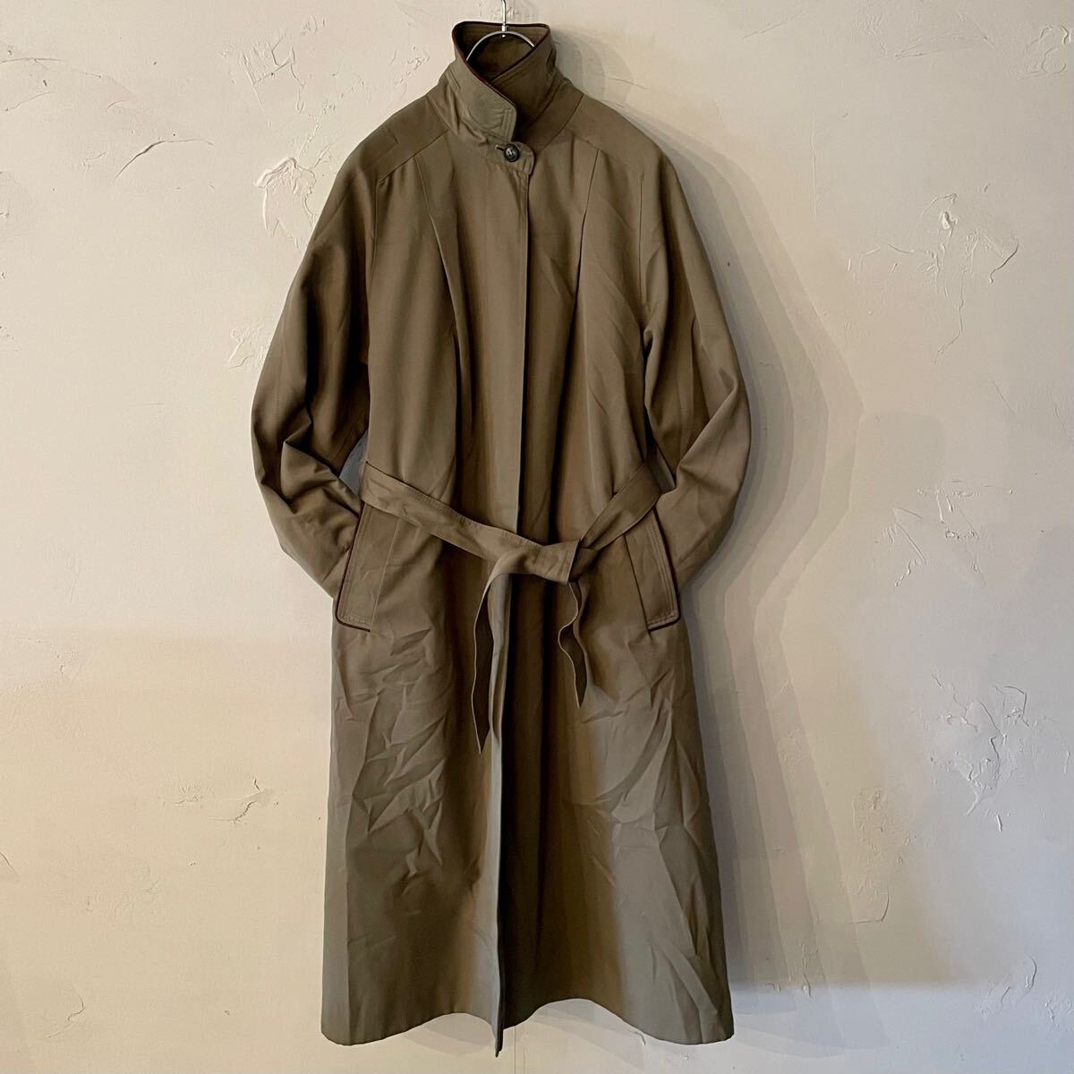 表生地 コットン15% ポリエステル85% 光沢感のある滑らかな生地感です。グレーカーキ色。ライナーチェック柄脱着可能。比翼仕立て。ベルト付き。レディースM。ラグランスリーブで肩のおちる良いサイズ感。フロント タック入りで広がりのあるフォルムの良い品です。