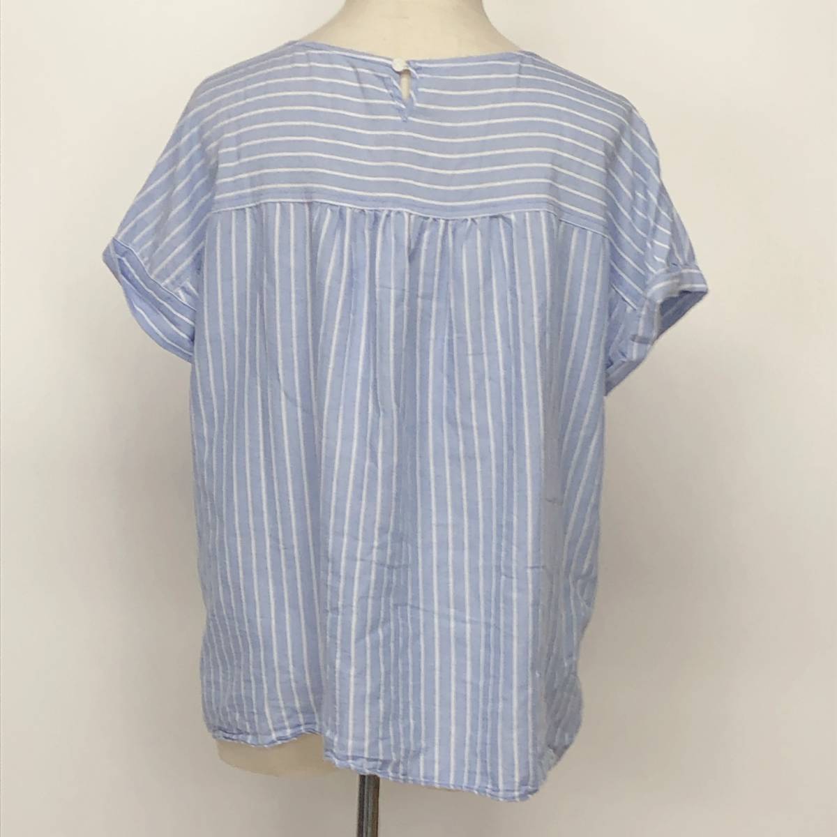 YX388 レディース トップス カットソー 半袖 薄手 LLサイズ 水色 ホワイト ストライプ 麻 レーヨン カジュアル おしゃれ 涼しげ 夏 休日