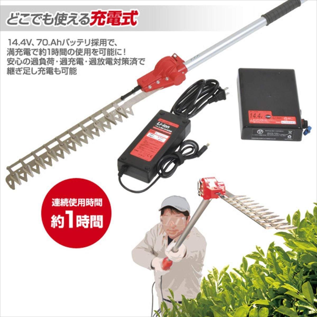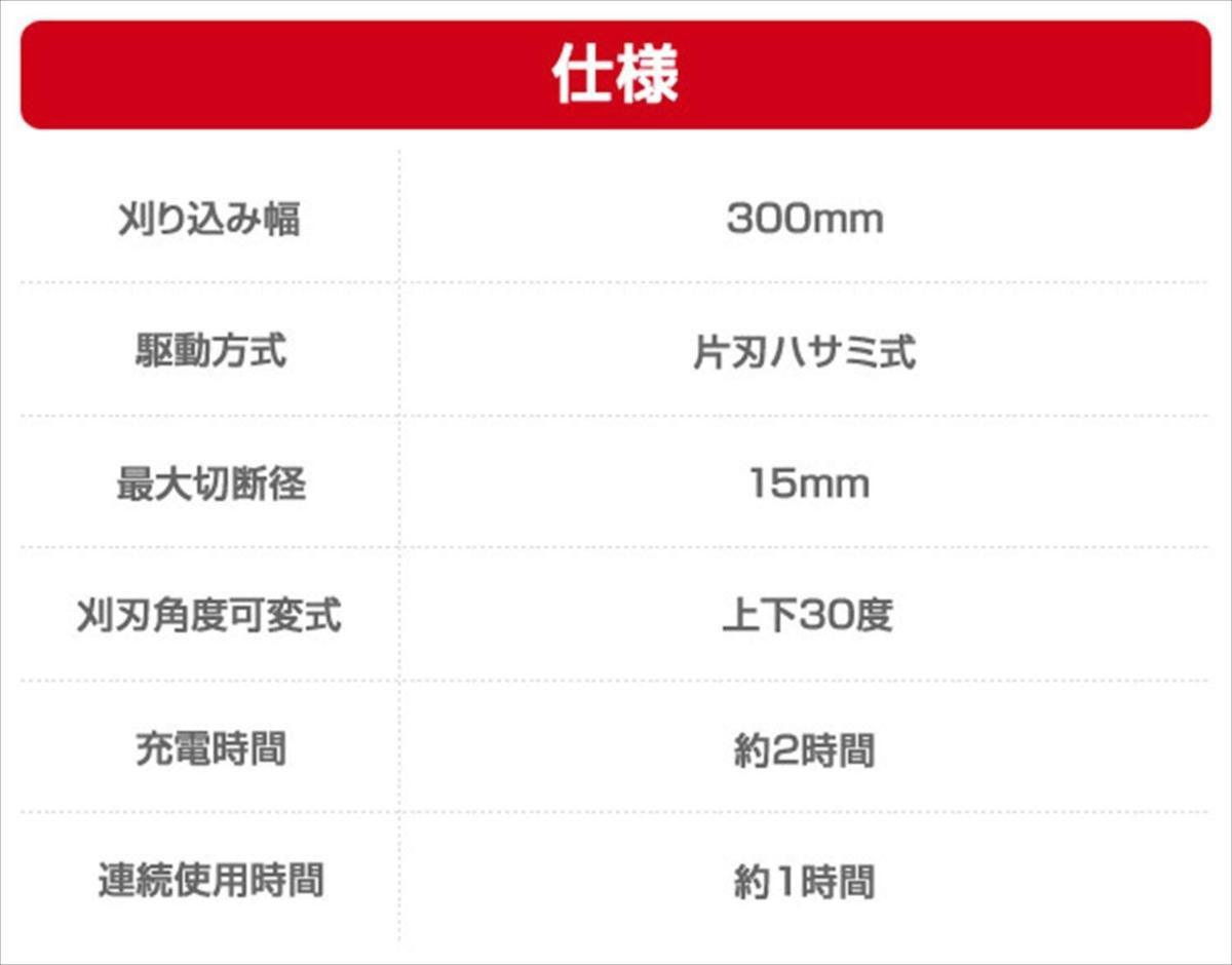 | 仕様・規格 | ■刈刃角度可変式:上下30度 ■本体寸法(mm):1500×100×70 ■質量:1.85kg ■モーター電圧:DC14.4V ■使用時間:約60分 ※満充電における連続使用の参考数値(目安)です。 ■ストローク数:1270min-1(回/分) ■刈込み幅:300mm ■駆動方式:片刃ハサミ式 ■最大切断径:15mm ※樹木の種類や刈刃の切れ味により異なります。 ■コード長:0.9m ■付属品:刃カバー、N-902-1充電池、N-902-3充電器 |