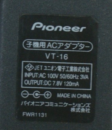 Pioneer パイオニア 純正 子機用 ACアダプター VT-16 FWR1131 センタープラス 7.8V 120mA 動作OK