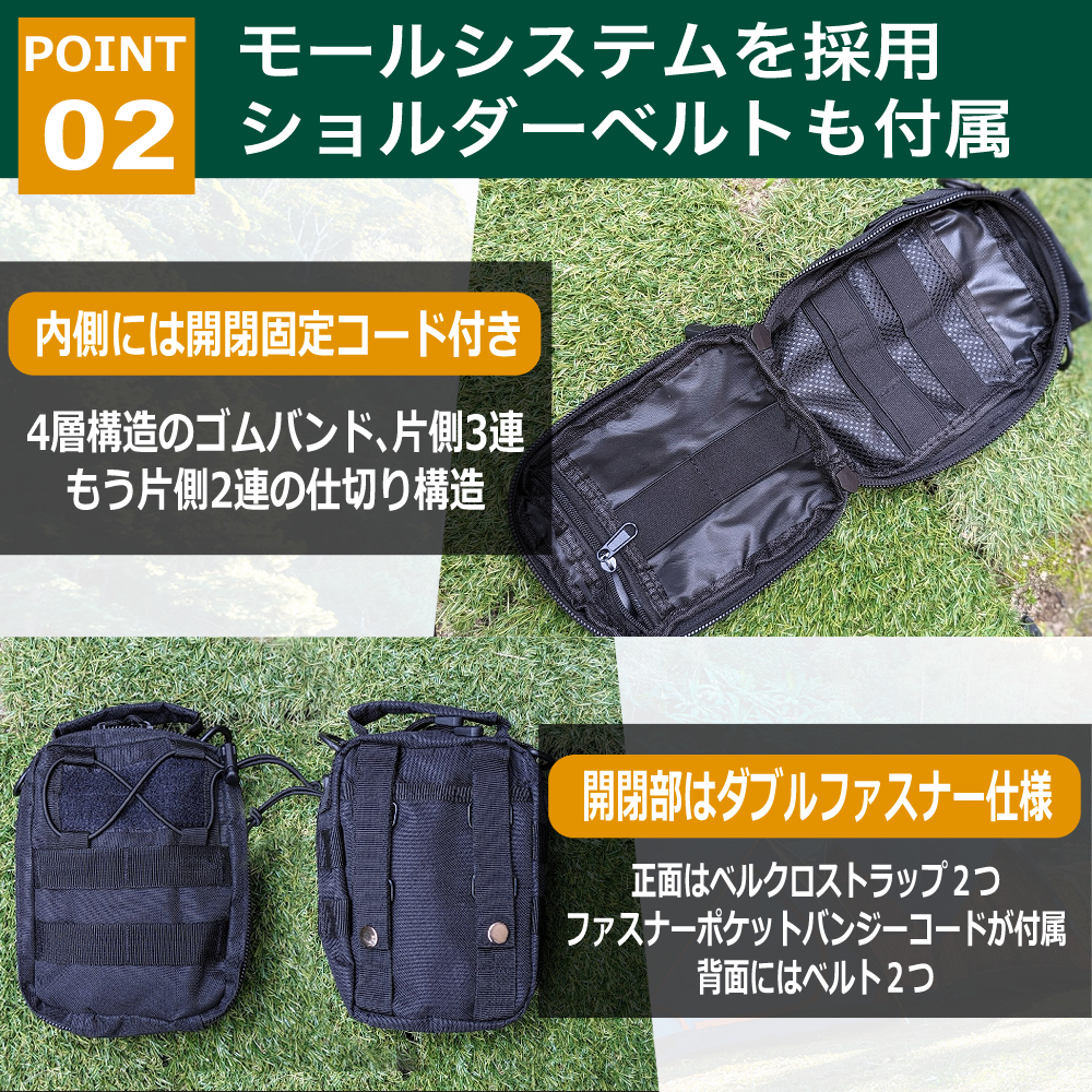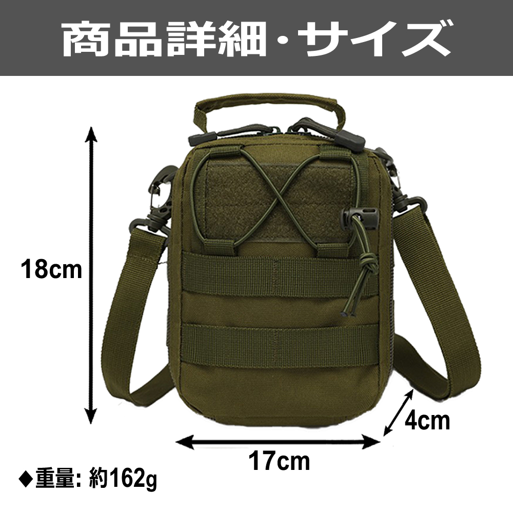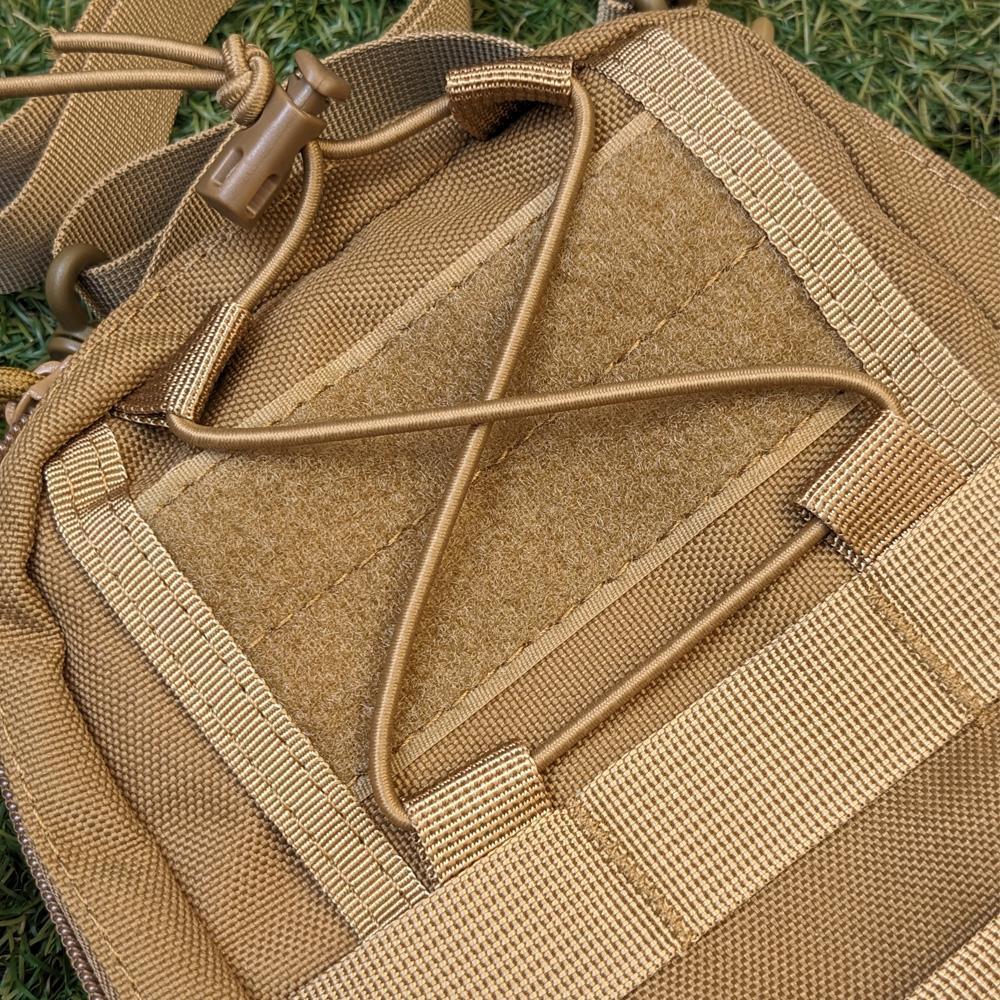 ◆【外側仕様】ショルダーベルト付属、肩掛け、斜め掛けも可能。上部の開閉部はダブルファスナー仕様、MOLLEシステムを採用し、背面はバッグに取り付けるためのベルトが2つ、正面にはベルクロストラップが2つとファスナーポケットが1つバンジーコードも付属しています