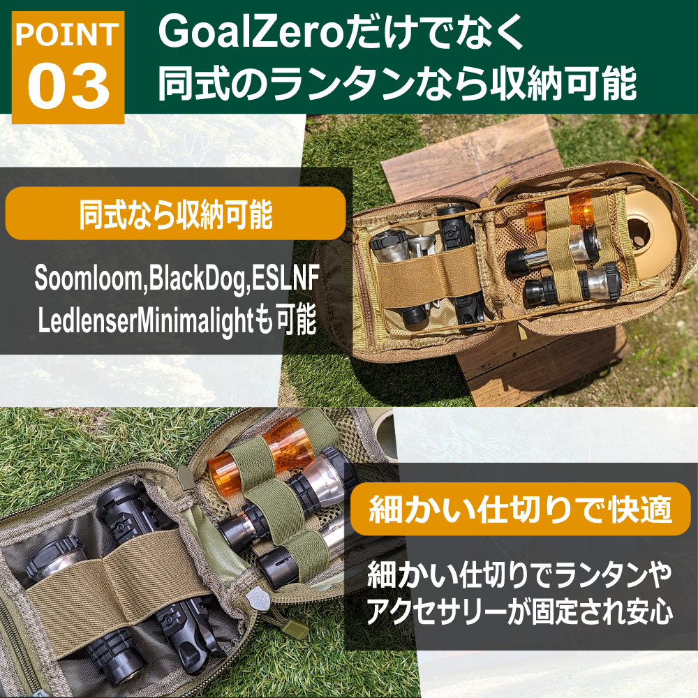 ◆【同式ライト収納可能】:Goal zeroと同型のSoomloom BlackDog ESLNF やLedlenser ミニマライトも収納可能