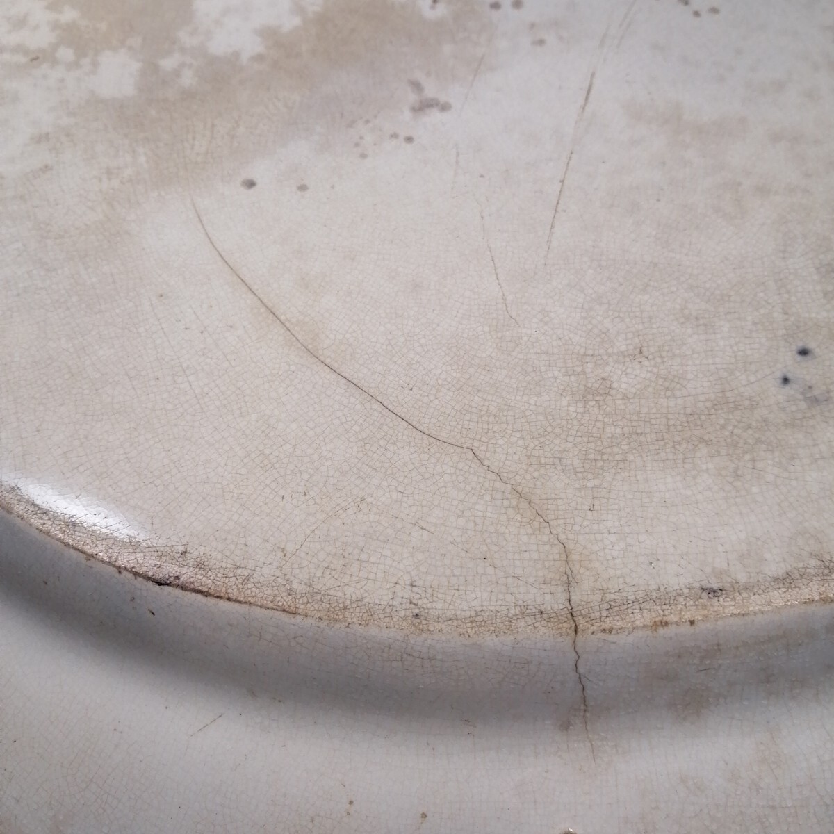19世紀イギリスビクトリア朝のミート皿です。染付でインドの虎狩の様子が描かれています。裏に[TIGER HUNT .LIVERPOOL ]の書き込みがあります。絵皿として鑑賞に耐えうるお皿です。ニューやホツレがあります。