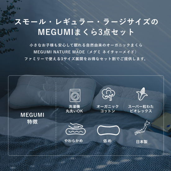 □□□□□□□□□□□□□□□□□□□□□□□□□□□□□□□□□□□□□□ ☆☆未使用新品・MEGUMI メグミネイチャーメイド枕 ファミリー3点セット(S・M・L)【ビオレックス/オーガニックコットン】です☆☆ ■未使用新品の商品です。 ※ダンボールに梱包して発送いたします ■メーカー希望小売価格は26,400円(税込み)の商品です。 ■お支払いは【落札金額+送料】のみ、となります。 上記の点を踏まえ、ぜひ入札のご検討をよろしくお願い致します。 □□□□□□□□□□□□□□□□□□□□□□□□□□□□□□□□□□□□□□ 製品名: メグミネイチャーメイド枕 ファミリー3点セット(S・M・L)【ビオレックス/オーガニックコットン】 ブランド:MEGUMI 素材 側生地:綿100% / 詰め物:ポリエステル 100%(わた) Sスモールサイズ:H30cm×W50cm お子様や小柄な方にちょうどいい、ちょっと小さくて低めのサイズです。 Rレギュラーサイズ:H35cm×W55cm 日本人の標準的な肩幅にあったベーシックなサイズです。 Lラージサイズ:H43cm×W63cm ゆったり使いたい方におすすめ。ホテルピローのような少し大きめサイズです。 お手入れ方法 ・汚れ防止の為にご使用の際はピローケースをかぶせてお使いください。 ・お手持ちの洗濯機の取扱い説明書を必ずご確認の上洗濯してください。 ・ドラム式洗濯機のご使用はお避けください。 ・洗濯により詰めものが片寄ることがありますので、脱水後は手早くわたをほぐして形を整えてから風通しの良い日陰で干してください。 ・詰めものに水分が残らないように十分に水気をとってから干してください。 『MEGUMI NATURE MADE(メグミ ネイチャーメイド)』 環境への負荷をできるだけかけないように配慮して生産された オーガニック&ナチュラルな自然由来素材をベースに、睡眠環境を快適に保つための最適な設計やカラダにフィットする立体的デザインなど、深い睡眠へと導くためのスリープエンジニアリングによって生み出された、地球にもやさしい、カラダにもやさしい、家族一緒に安心して使える、そしてみんなが笑顔になるスリーププロダクトです。 ■Webサイトにて製品詳細を確認することができます。→→Webサイトへ | ||