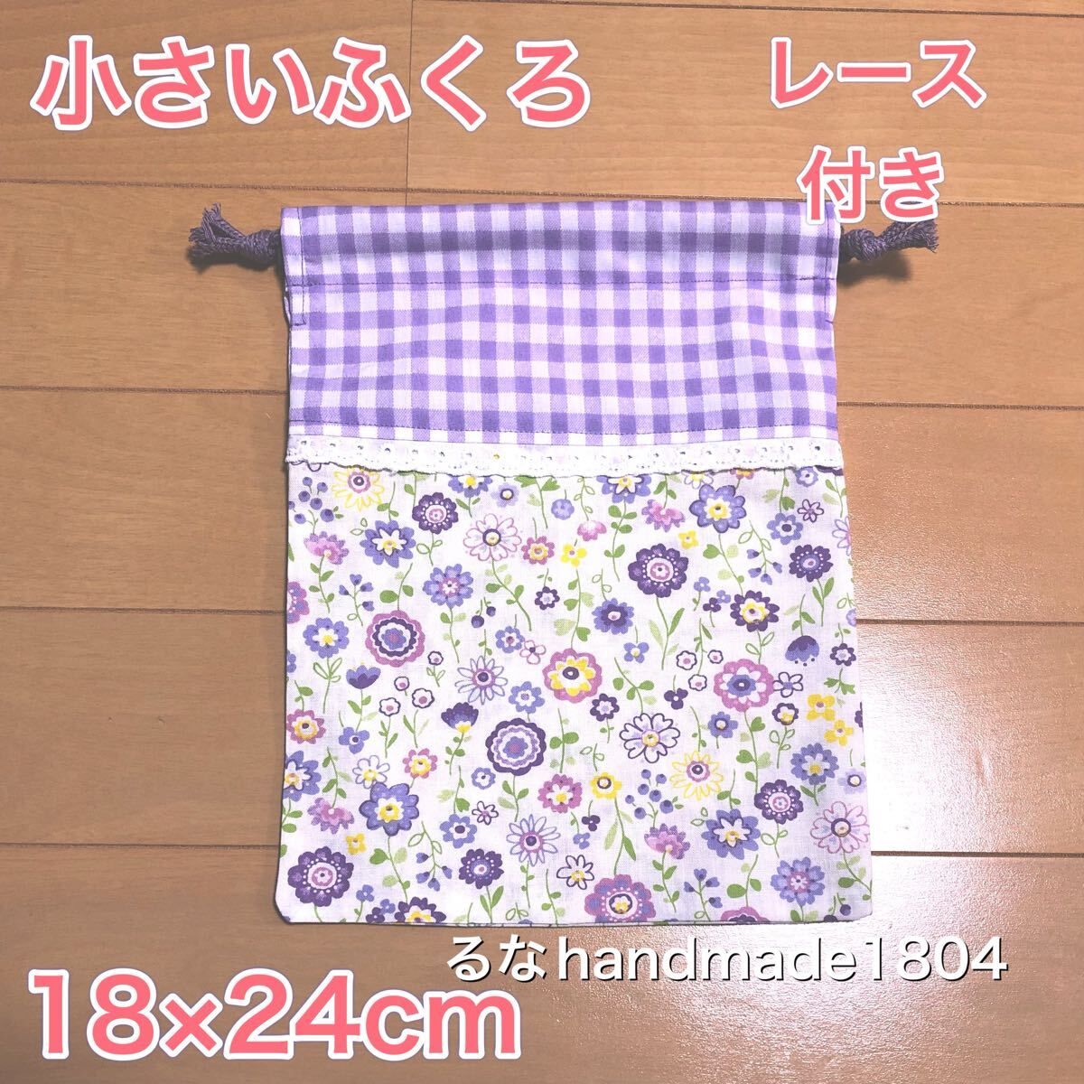 薄紫花柄とギンガムチェックの小さい巾着袋です。