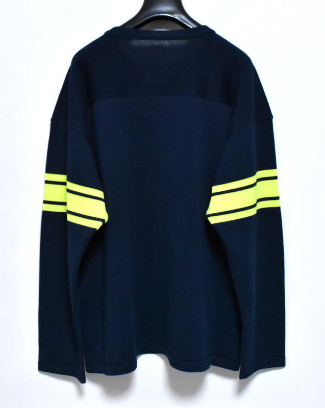 新品未使用。㈱ナナミカ取り扱いの国内正規品です。 70年代のアメリカンフットボールシャツをデザインベースにした、クラシックな趣あるセーター。 和紙とポリエステルを撚り合せた糸とラミー(苧麻)とナイロンを撚り合せた糸を引き揃えた14GG度詰天竺ボーダー。 中央のラインと細い両脇のストライプの間にベースカラーのストライプが入り、5本の線を組み合わせたクラシックなアメフトシャツによく見られるノースウェスタンストライプ柄。 アクセントにポリエステルの発色の良い配色の糸と組み合わせて表現。 【色】・・・ネイビー。フラッシュの関係で実物と画像では多少の色の濃薄が見られます。ご了承の上ご入札お願い致します。 【素材】・・・麻49%、和紙25%、ポリエステル19%、ナイロン7%、ラインパーツ:ポリエステル100%。 【サイズ】S・・・肩幅約62cm、身幅約60cm、着丈約68cm、袖丈(肩の付け根から計測)約56cm。 【状態】・・・新品未使用。保管時の軽度のしわが見られます。 ご了承の上、入札お願いいたします。 他にも多数出品致しておりますので、宜しければご覧になって下さい。安値での出品ですのでこの機会に是非どうぞ! |