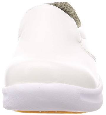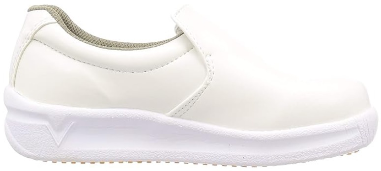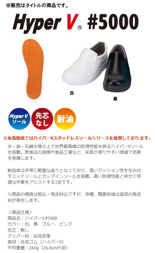 日進ゴムNISSHIN RUBBER滑らない厨房靴を追求したHyperV#5000 サイズ:28.0cm※氷雪路面ではハイパーVスタッドレスソールシリーズを推奨しております。■特長水・油・石鹸水等の上で世界最高峰の防滑性能を誇るハイパーVソールを搭載。飲食店の厨房や食品工場など、床面が滑りやすい現場で効果を発揮します。靴自体は非常に軽量な造りとなっており、高いクッション性を生み出すミッドソールとカップインソールを搭載。高い防滑性能と併せて快適な作業をアシストする1足です。■商品仕様・商品名:ハイパーV #5000・カラー:白・先芯:無し・アッパー材:合成皮革・底材:合成ゴム(ハイパーV)・平均重量:260g(※26.0cm片足)