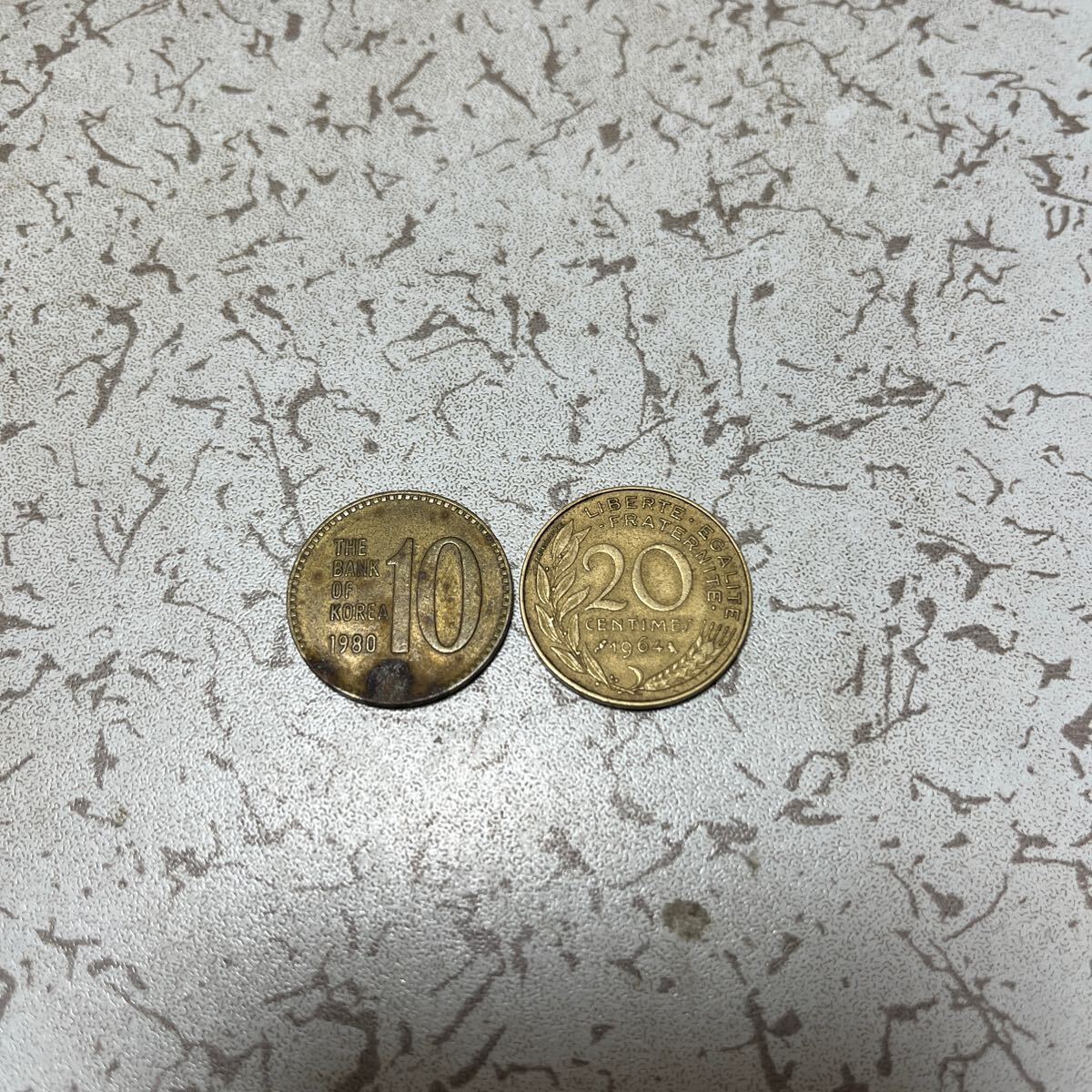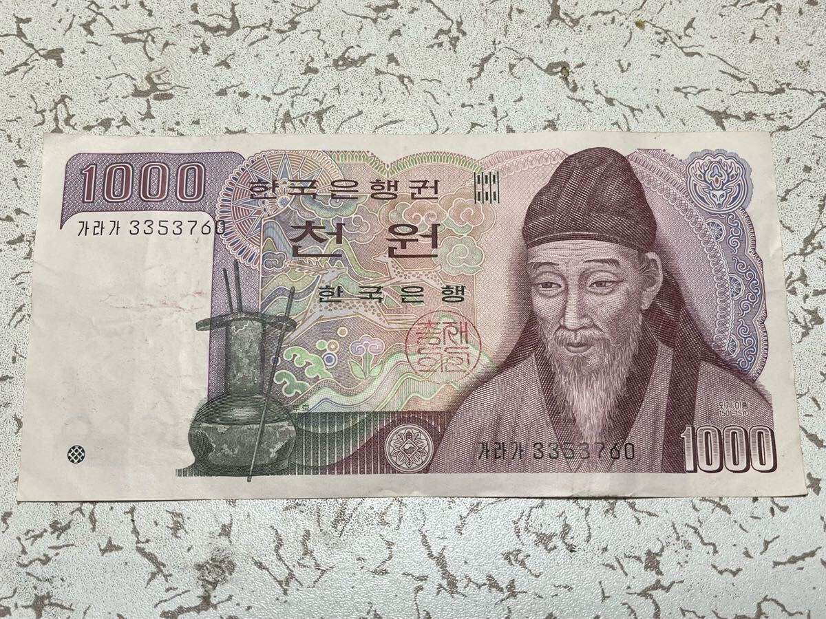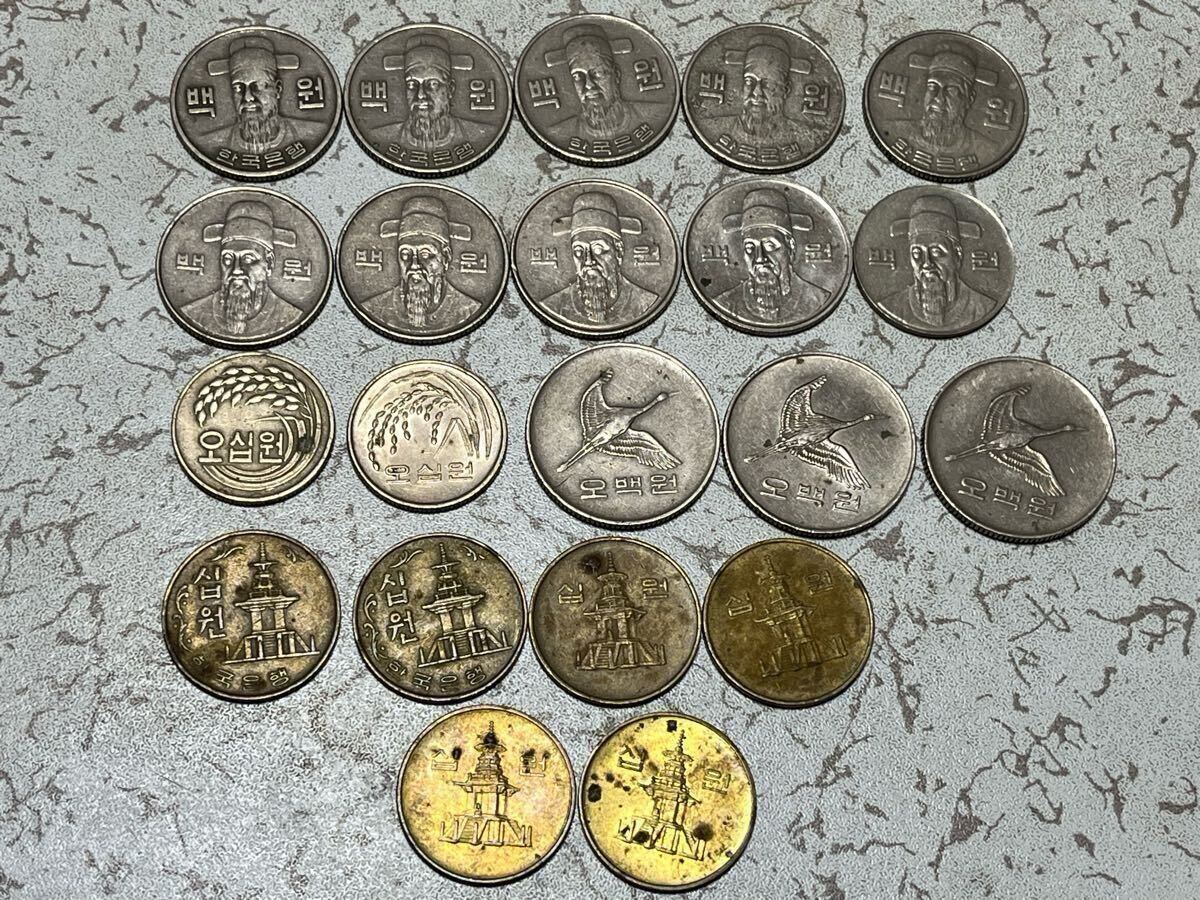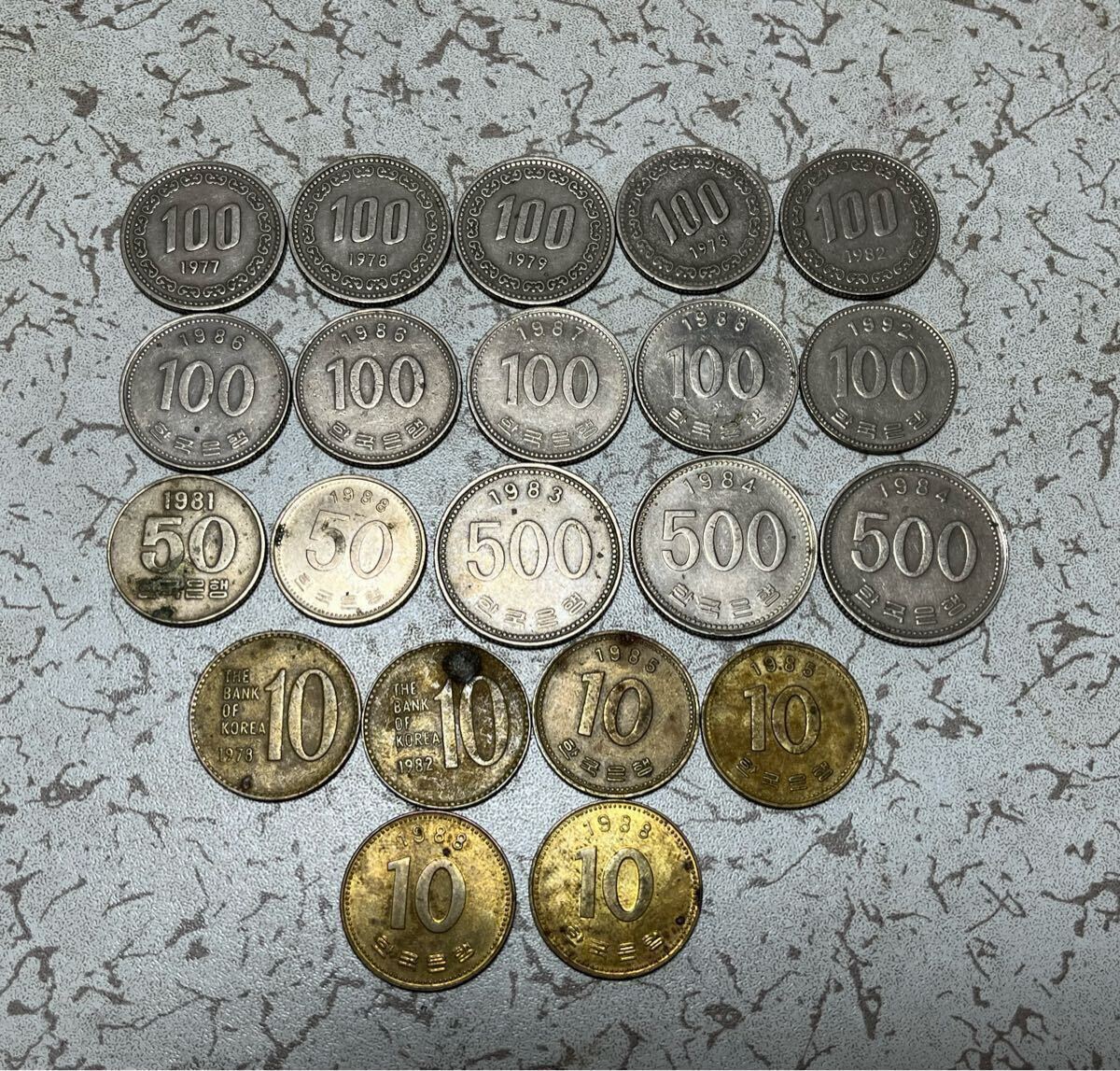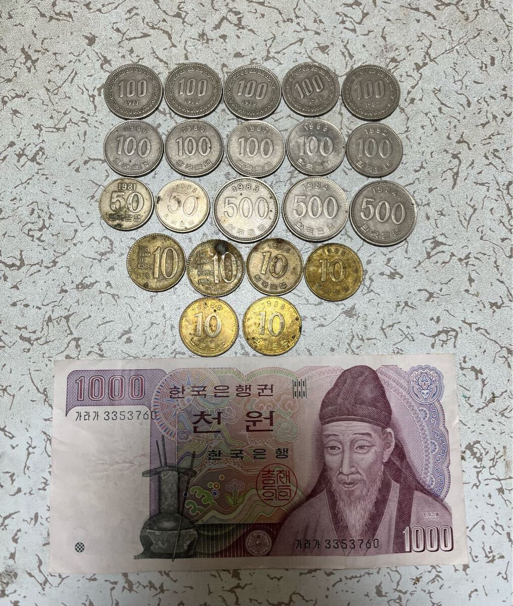 10ウォン7枚・20枚1枚・50ウォン2枚・100ウォン10枚・500ウォン3枚・1000ウォン1枚です。