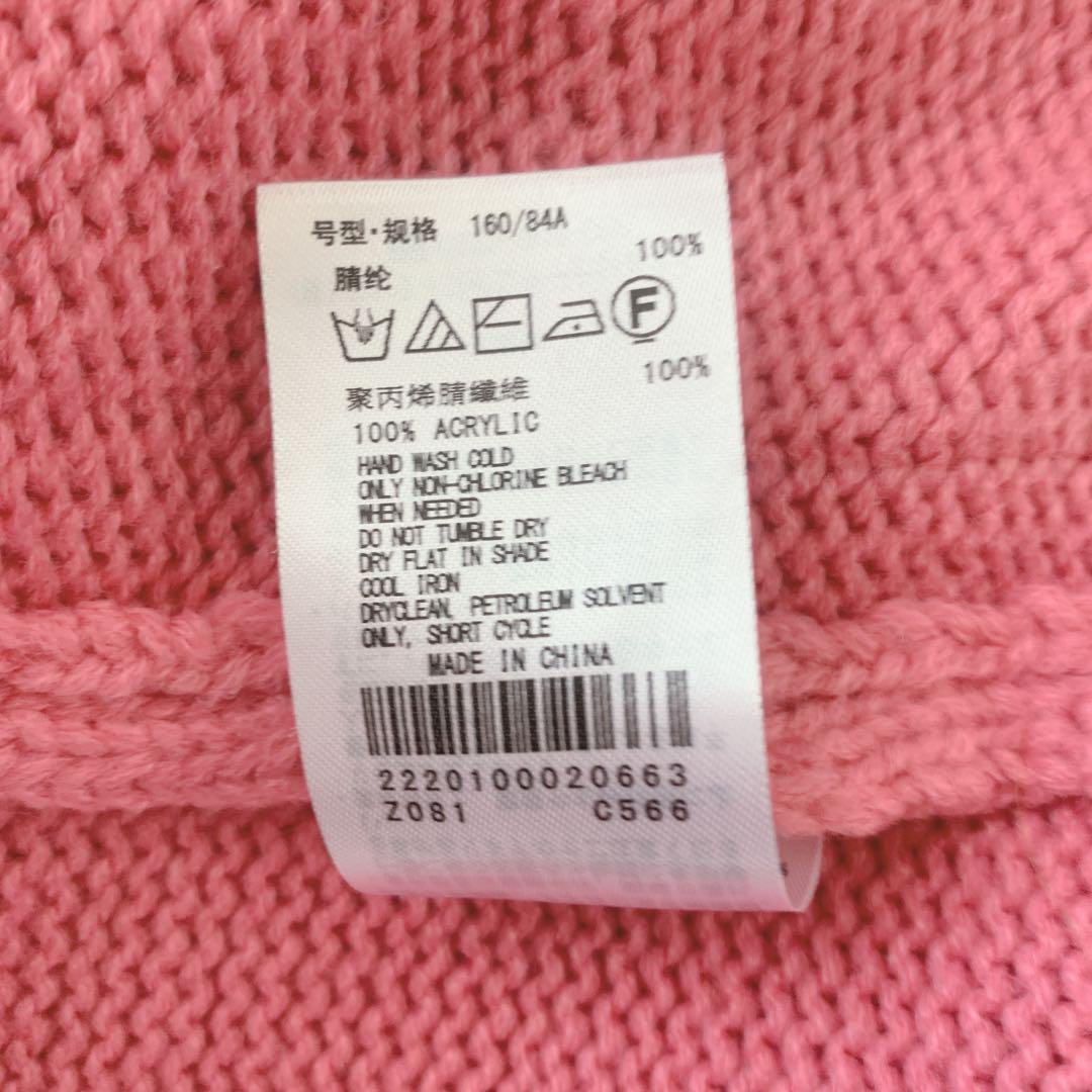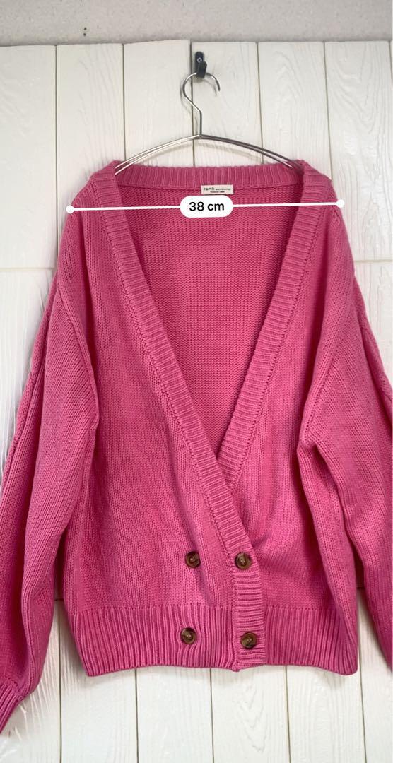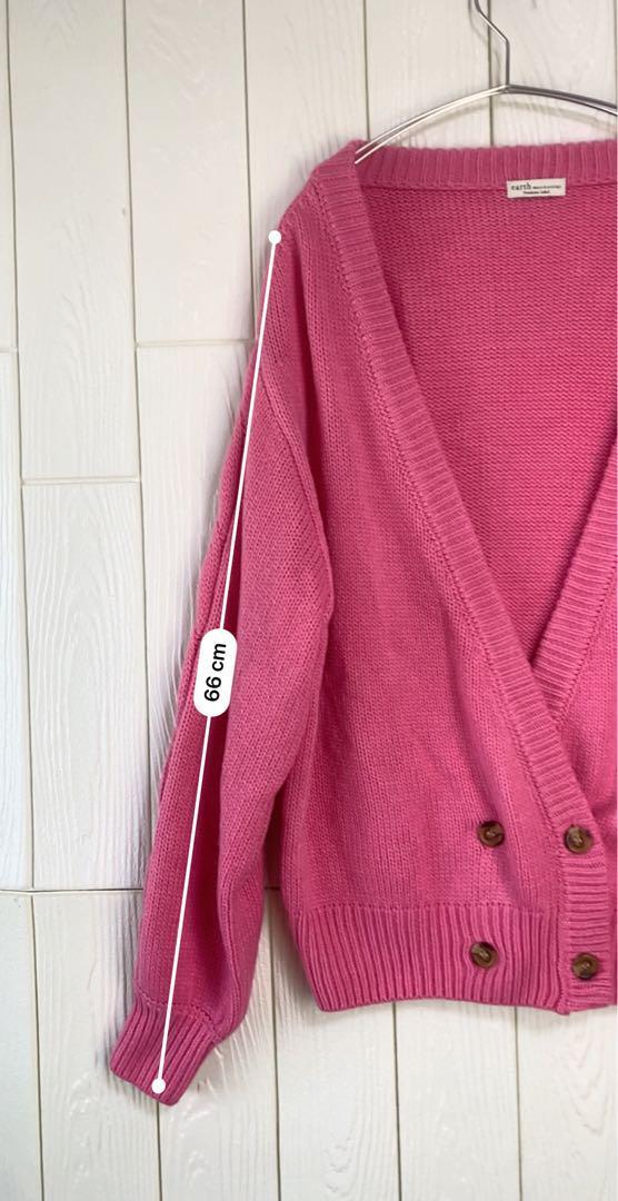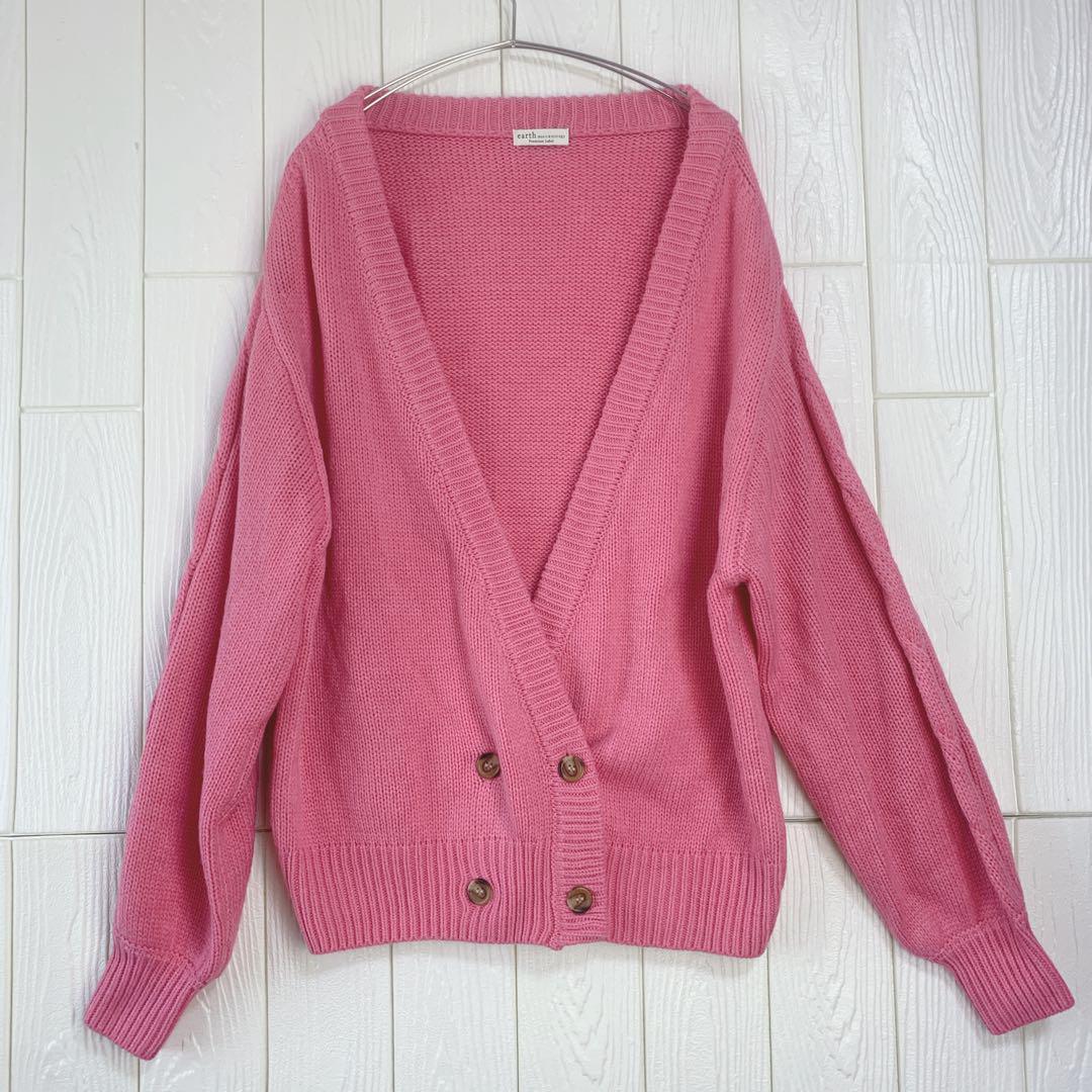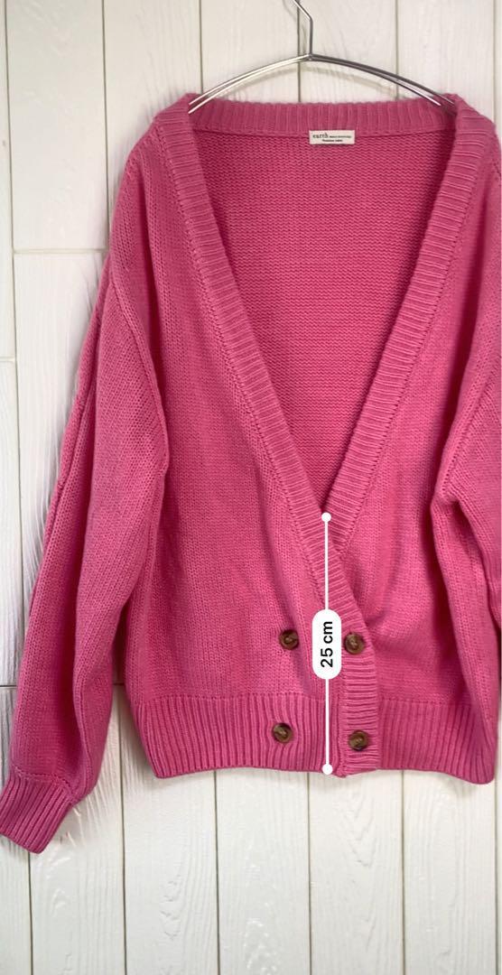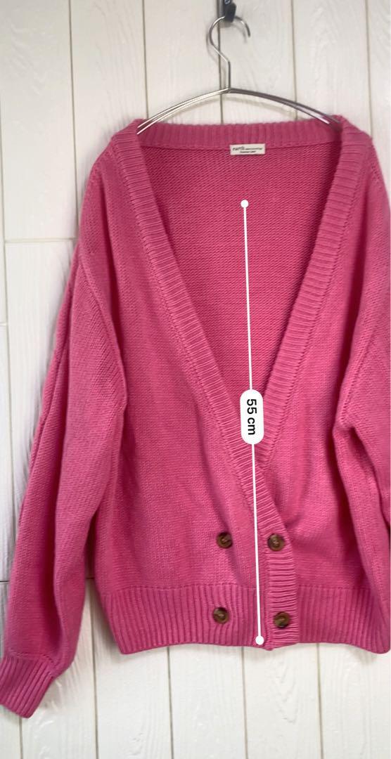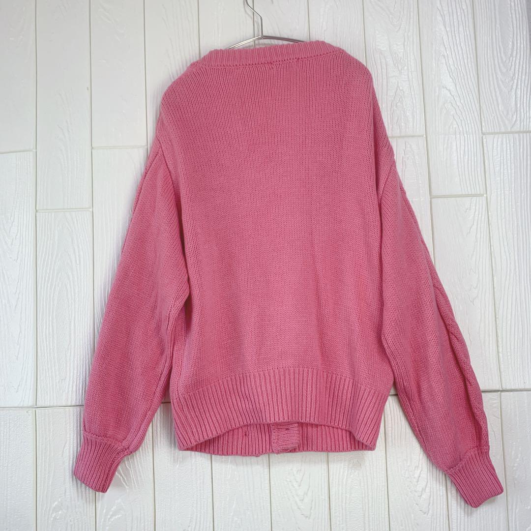 ピンクの長袖カーディガン、ゆったりしたデザインで、ボタン付き。