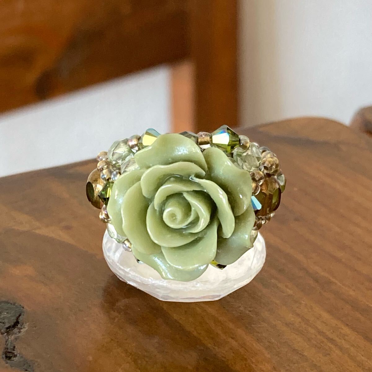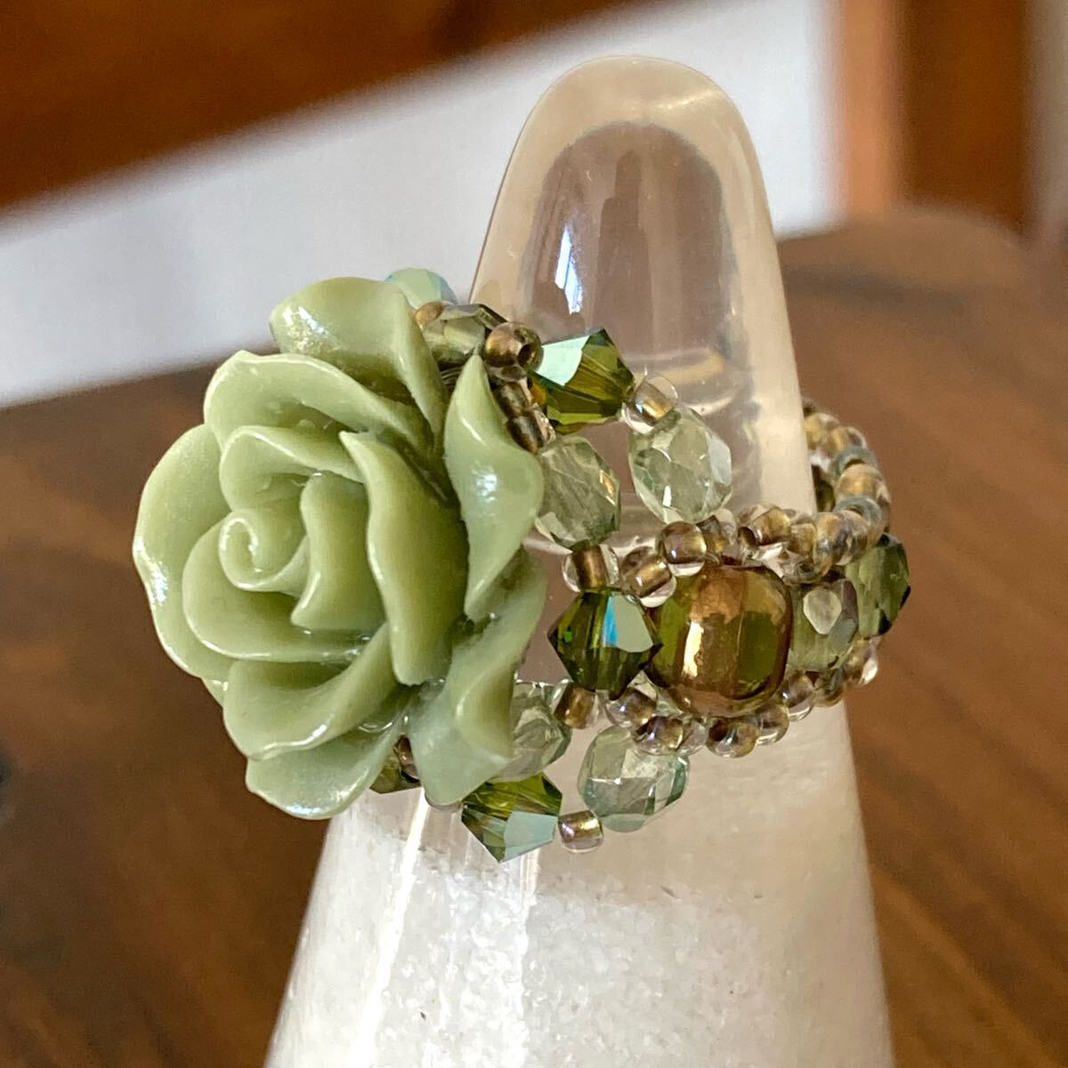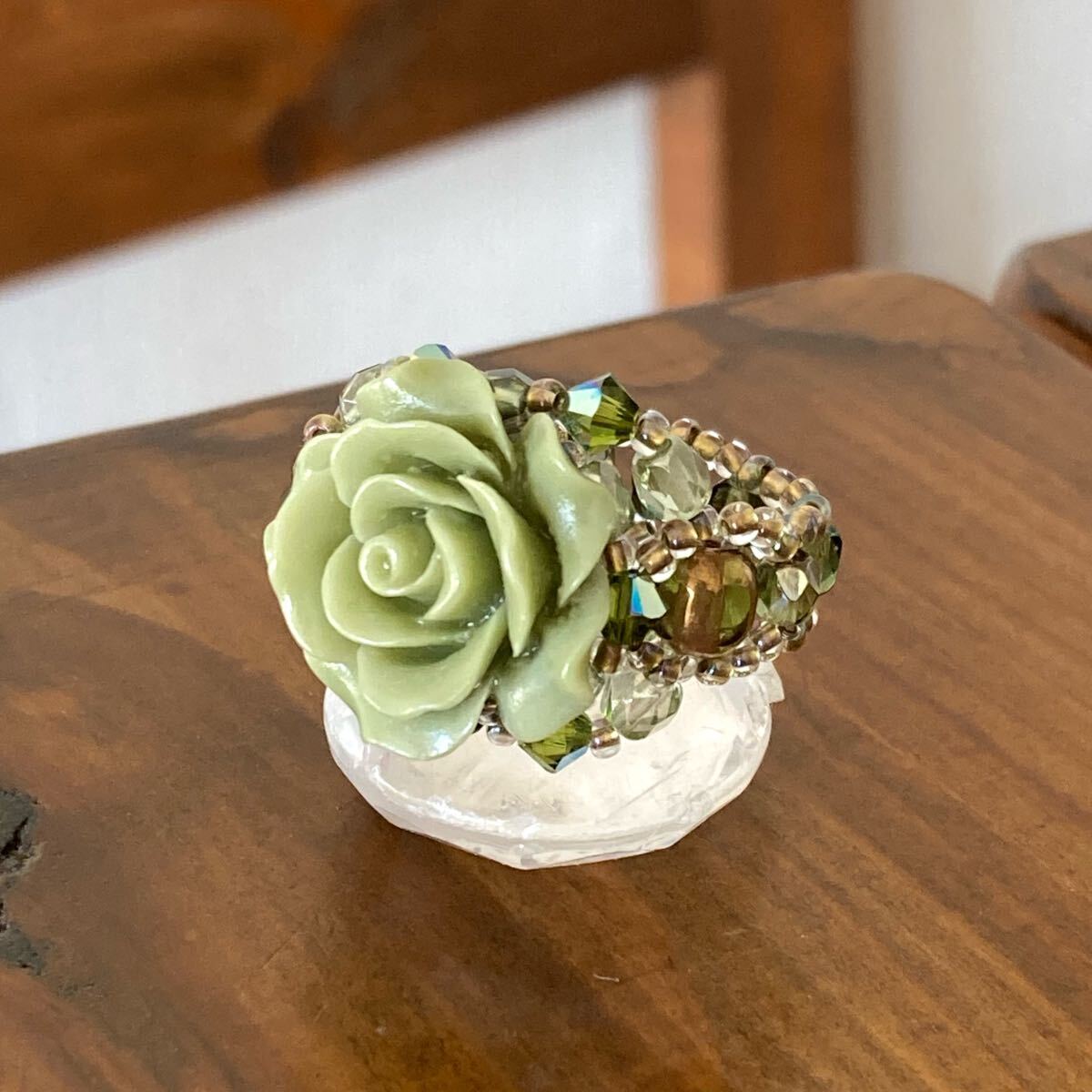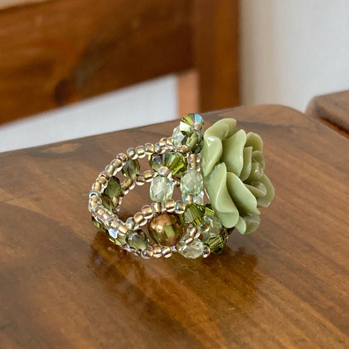 20mmのライトグリーンの薔薇のビーズ、4mmのライトグリーン(2種類)のチェコビーズ、4mmのライトグリーンのスワロフスキー、5mmのライトグリーンのチェコビーズ、クリアゴールド系の丸小ビーズで作ったリングです。