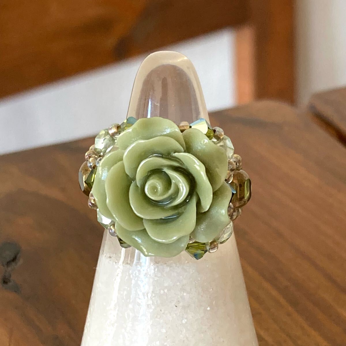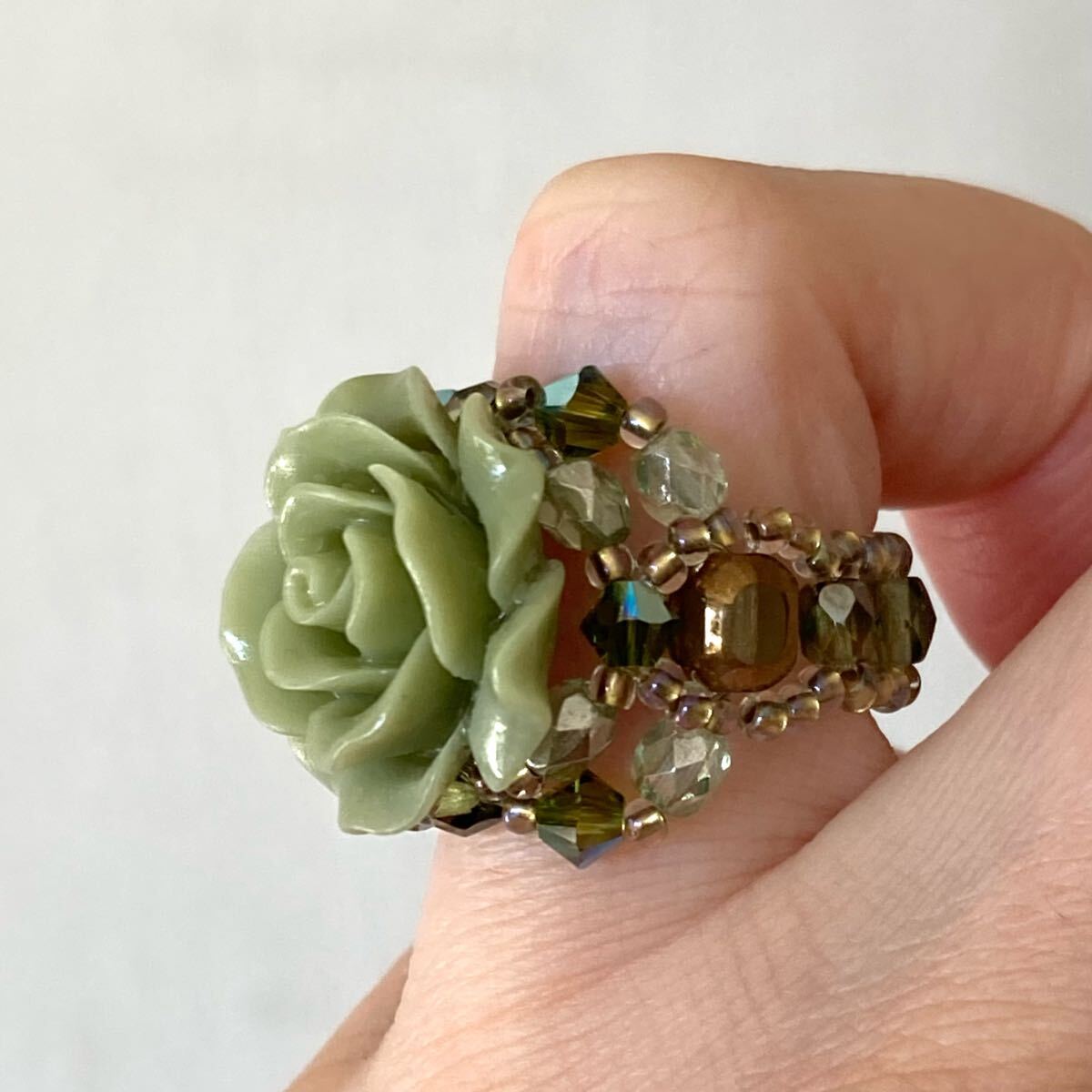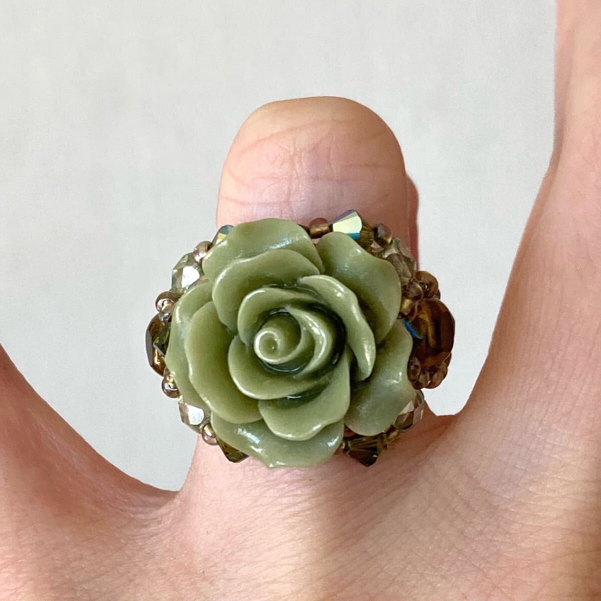 14-16号 ビーズ リング 指輪 ハンドメイド  大きい薔薇のビーズリング ライトグリーン です。