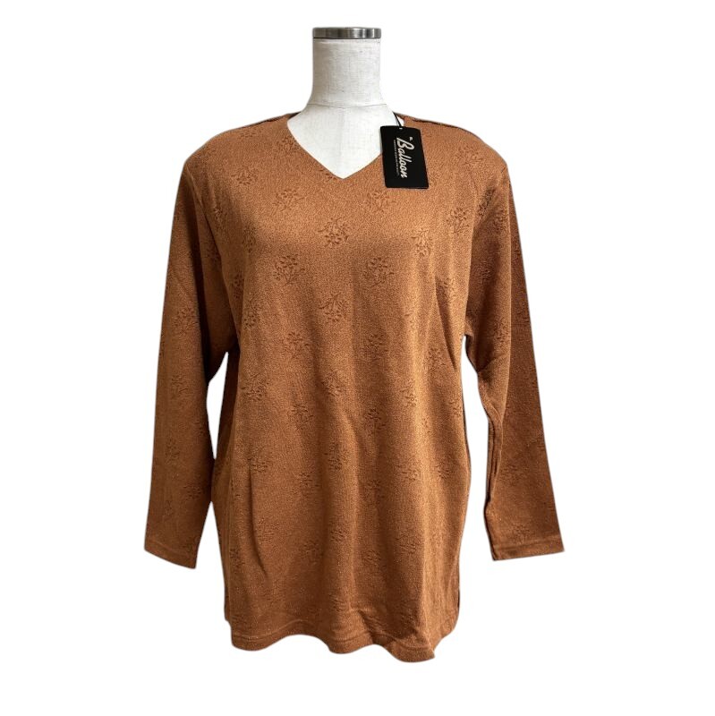 温かみのあるテラコッタブラウンが魅力的な、Vネック長袖カットソー。