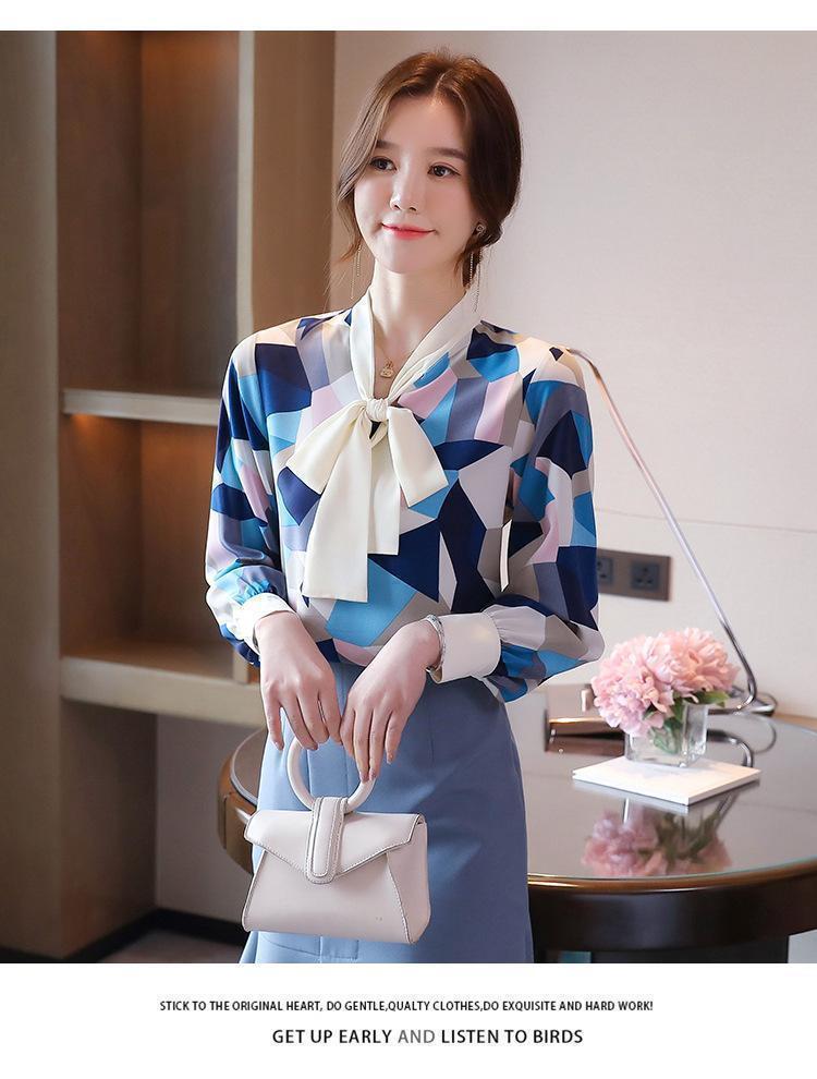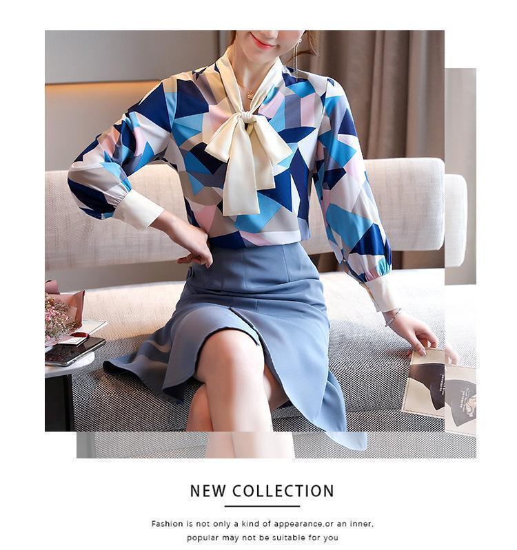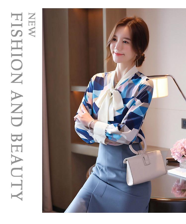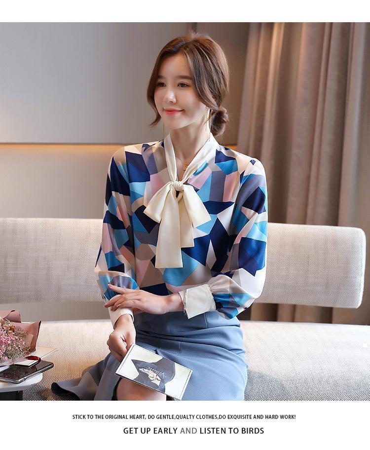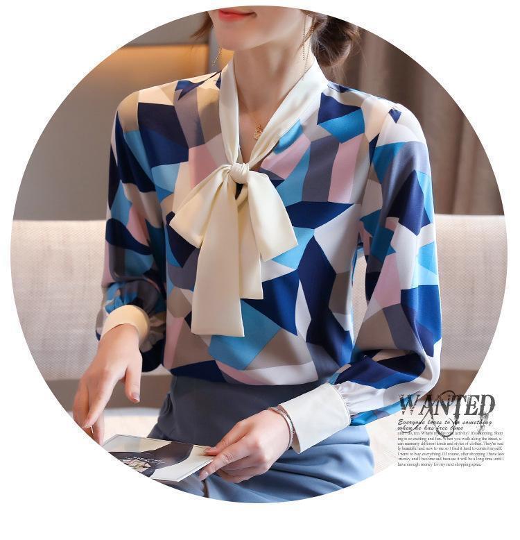 マルチカラーリボン長袖の女性ブラウスシャツブラウス女性ボウVネックプリントシフォンブラウスシャツ女性トップ