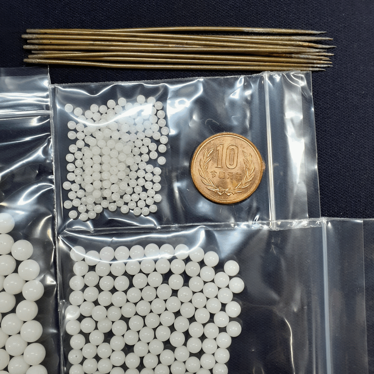 商品のご説明 ユリア樹脂 片穴 ( 0,8mm 穴 ピアス用 ) 3mm , 5mm , 7mm , 9mm 各100個 何も塗っていない すっぴん玉です ( 3mm のみ 200個入れてます。 無穴が混じってますので念の為です。) 差す為の真鍮串( 中古ですが )を 10本入れてます。 | ||