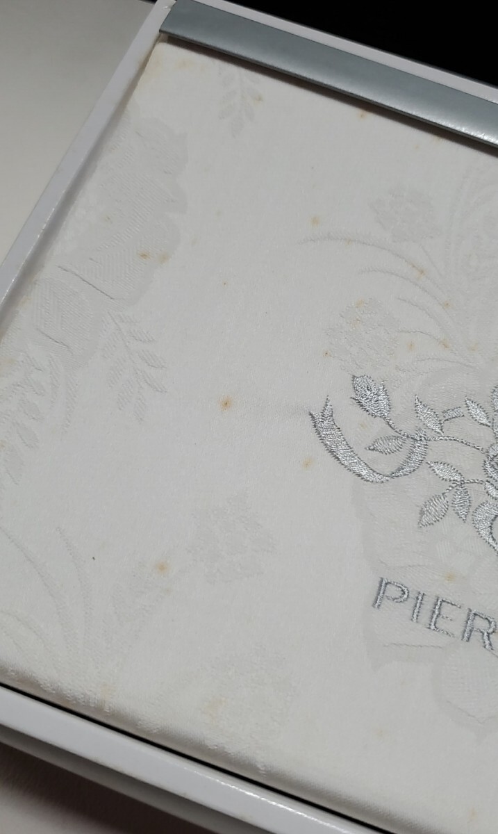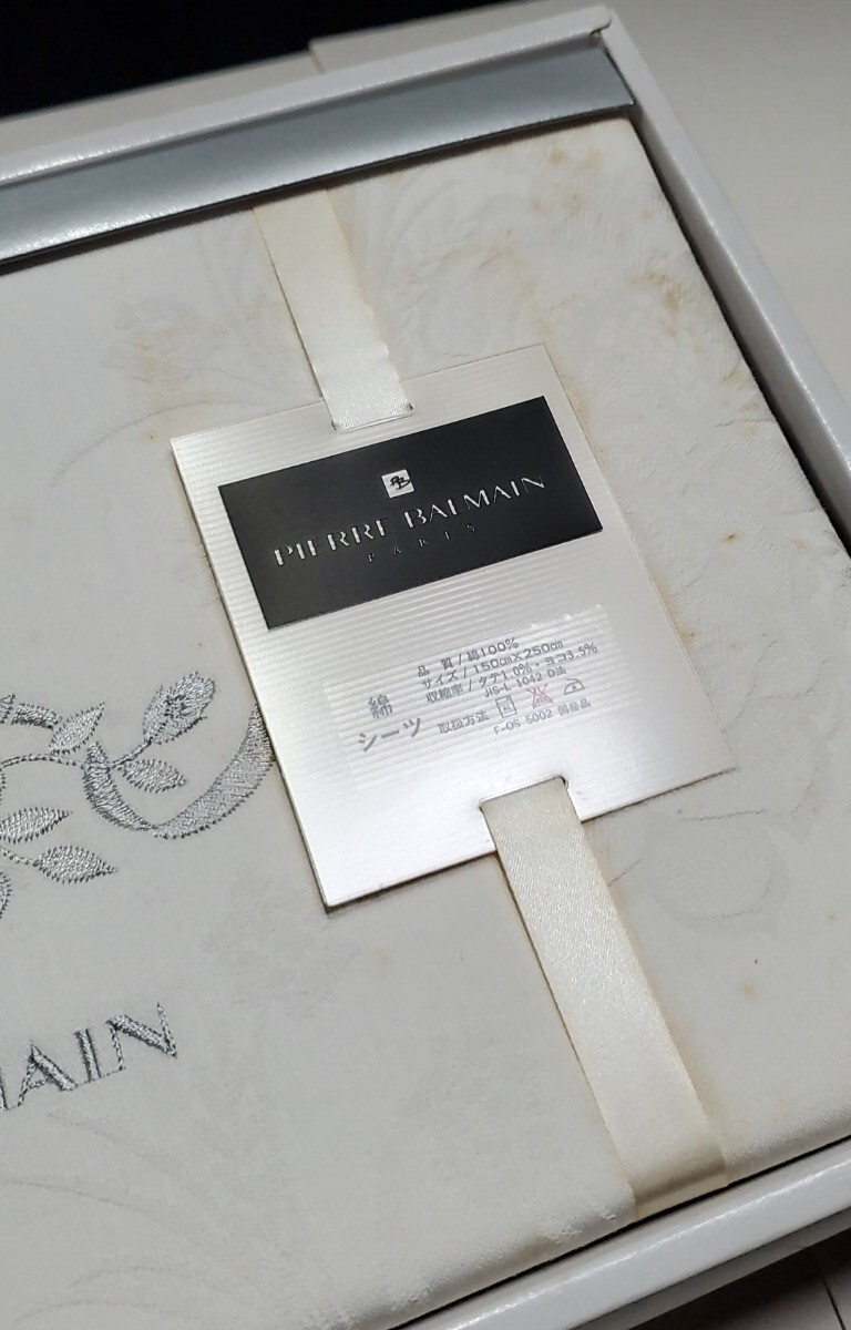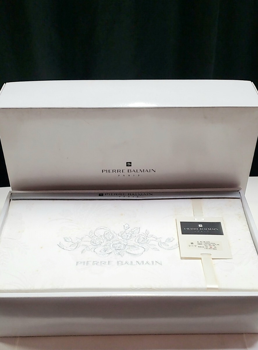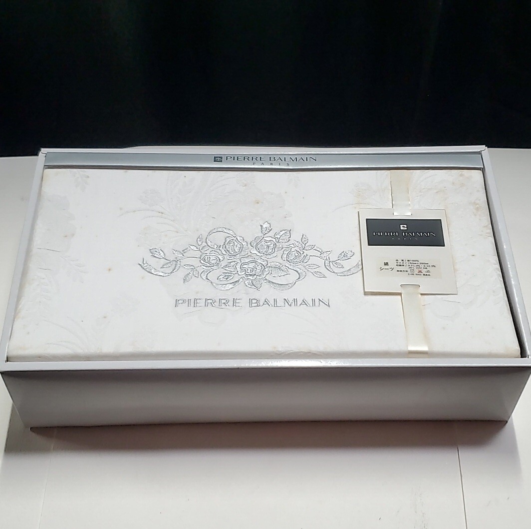 ピエールバルマン フラットシーツです。未使用品。長年におきましての自宅保管となりますが、所々に経年によるシミが見受けられる状態となっています。