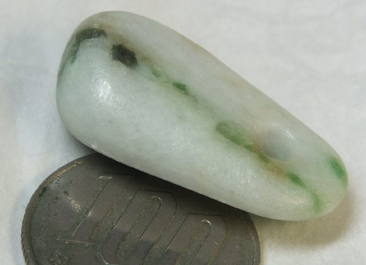 ▲商品説明▲ | サイズ:30×16×10mm 重さ:8.2g 糸魚川翡翠は日本翡翠独特な落ち着いた石質です。全面研磨され綺麗な仕上がりです。貫通穴が有ります。石コレクションやアクセ作り、ペンダントトップや下げ飾り等に。 ※当方の糸魚川翡翠は、新潟のヒスイ海岸に打ち上げられた小翡翠です。地元の職人さんにより、手磨きで作られた貴重な勾玉で、当サイトでも数に限りがある人気商品です。 ◎商品につきましては注意を払った検品を行っておりますが、稀に石の表面にクラック状の筋や凹みが見受けられる場合が御座います。それは石本来の石紋で傷ではありません(割れが生じ易いヒビではありません)。返品の対象にはなりませんのでその旨御了承の上、ご検討下さい。 |