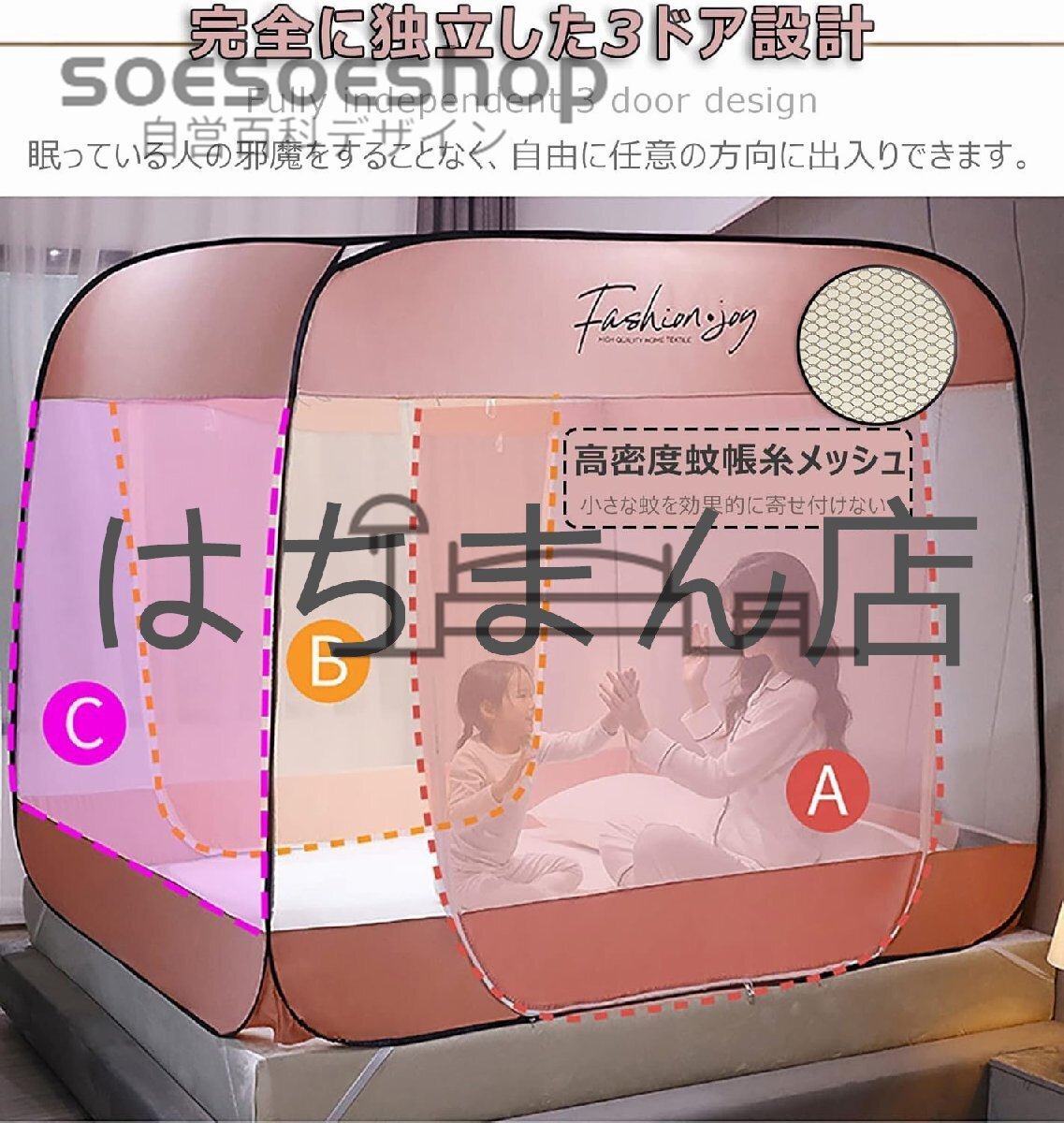 【3ドアタイプ&両面ジッパー】★3ドアタイプで、入り口も大きくして出入りやすく、部屋内の移動する時も便利です。テントに出入りしても眠る人の邪魔になりません。★両面ジッパーついて、外側はもちろん、内側からも簡単に開閉できます。