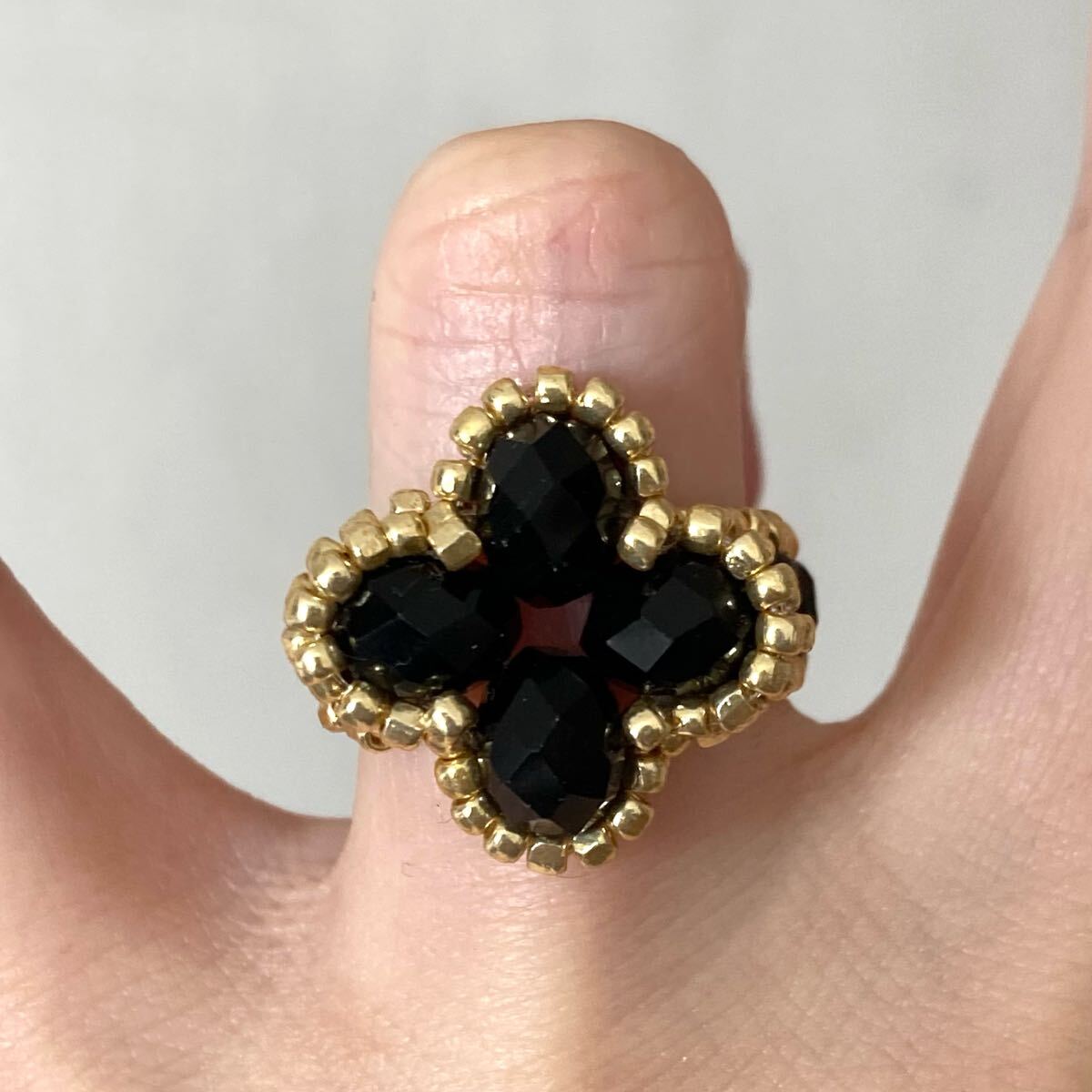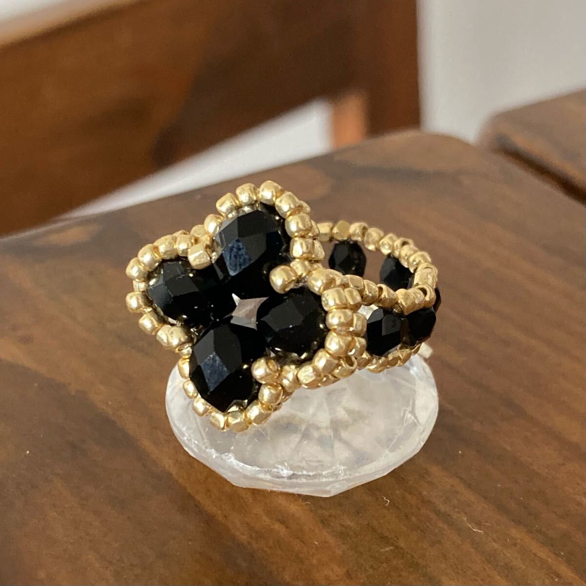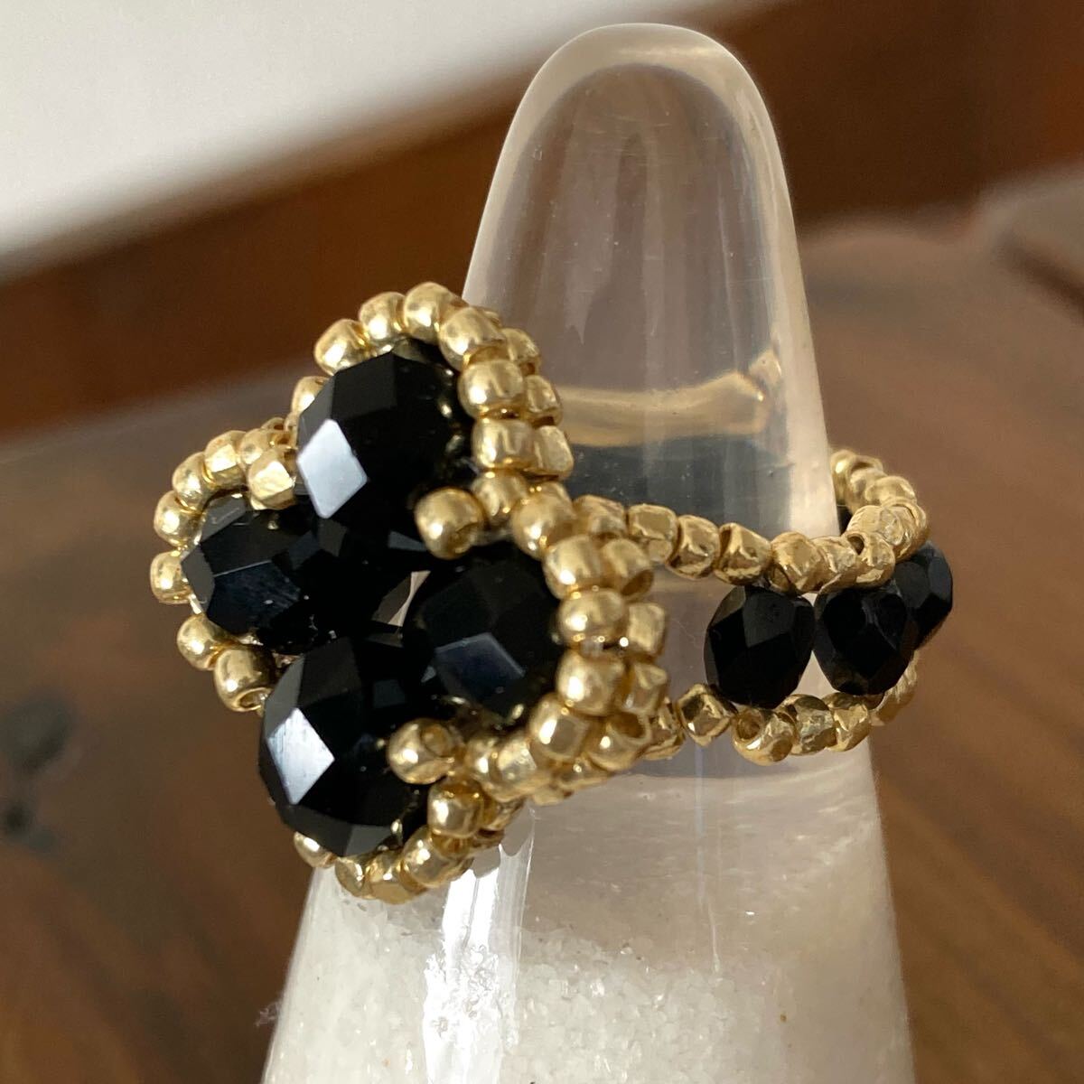 大きめの黒のボタンカットビーズの周りをゴールドのスリーカットビーズで2重に縁取ったクローバー風デザインのリングです♪