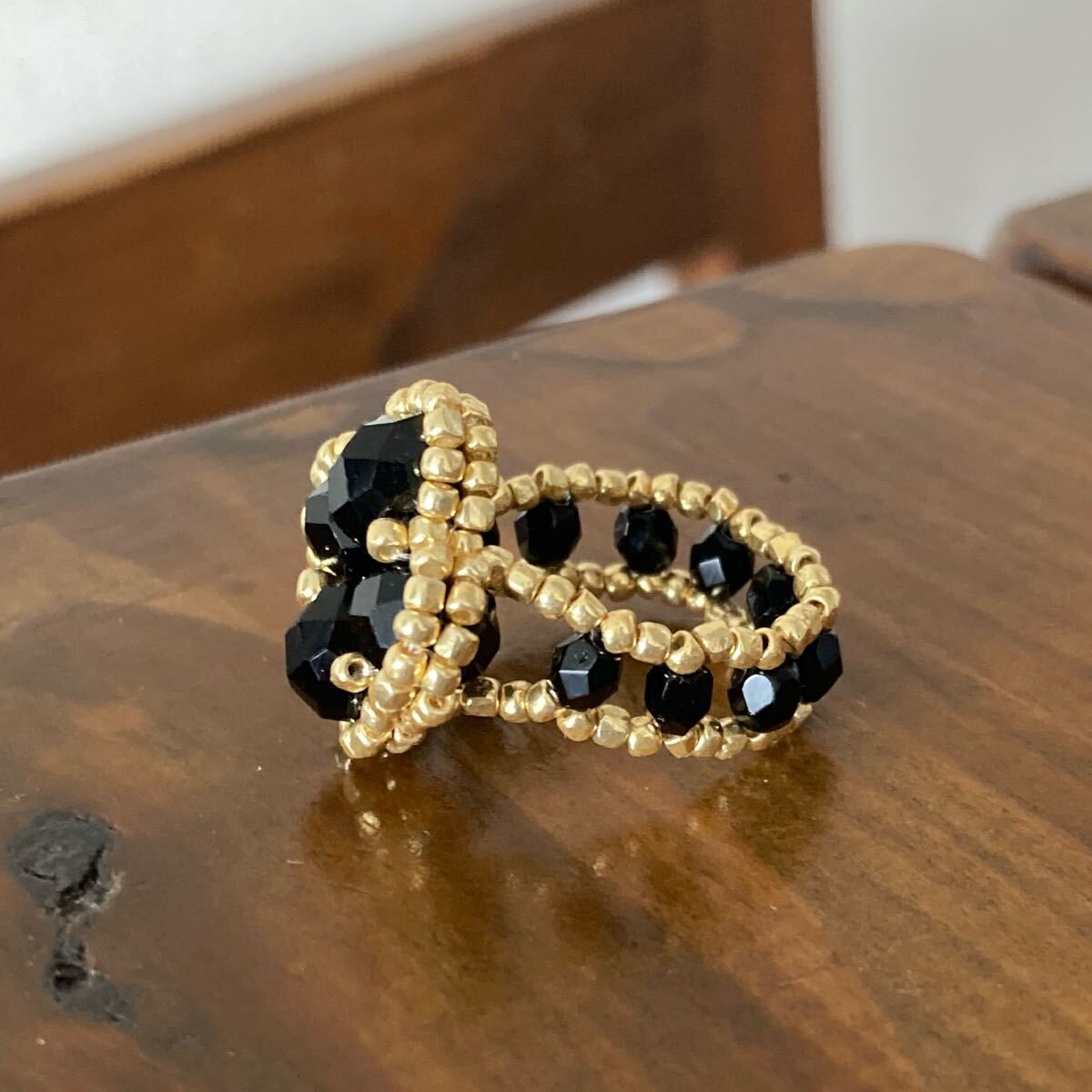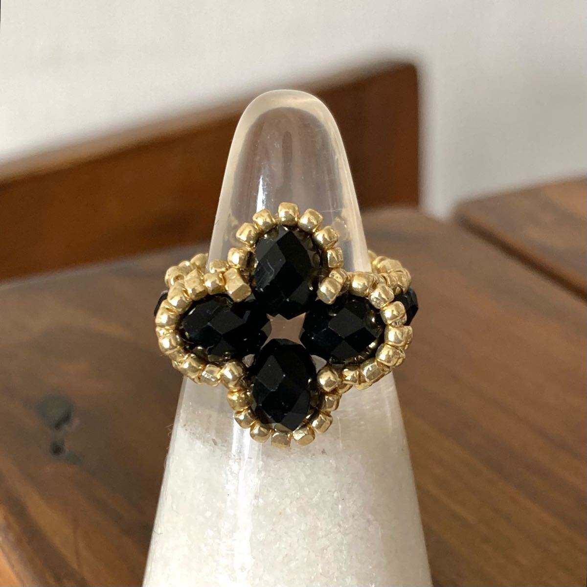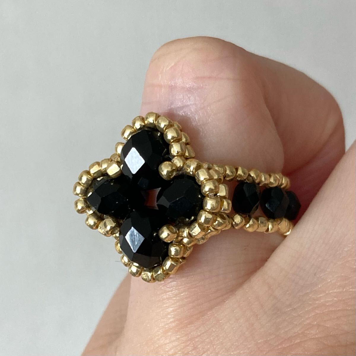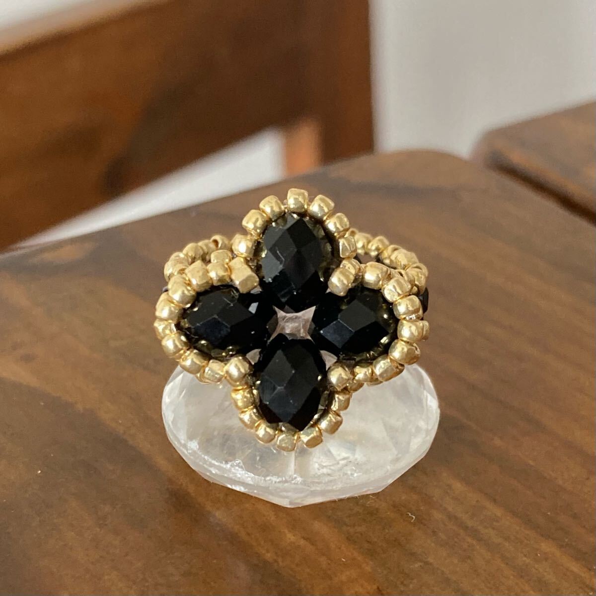 大きめの黒のボタンカットビーズの周りをゴールドのスリーカットビーズで2重に縁取ったクローバー風デザインのリングです♪