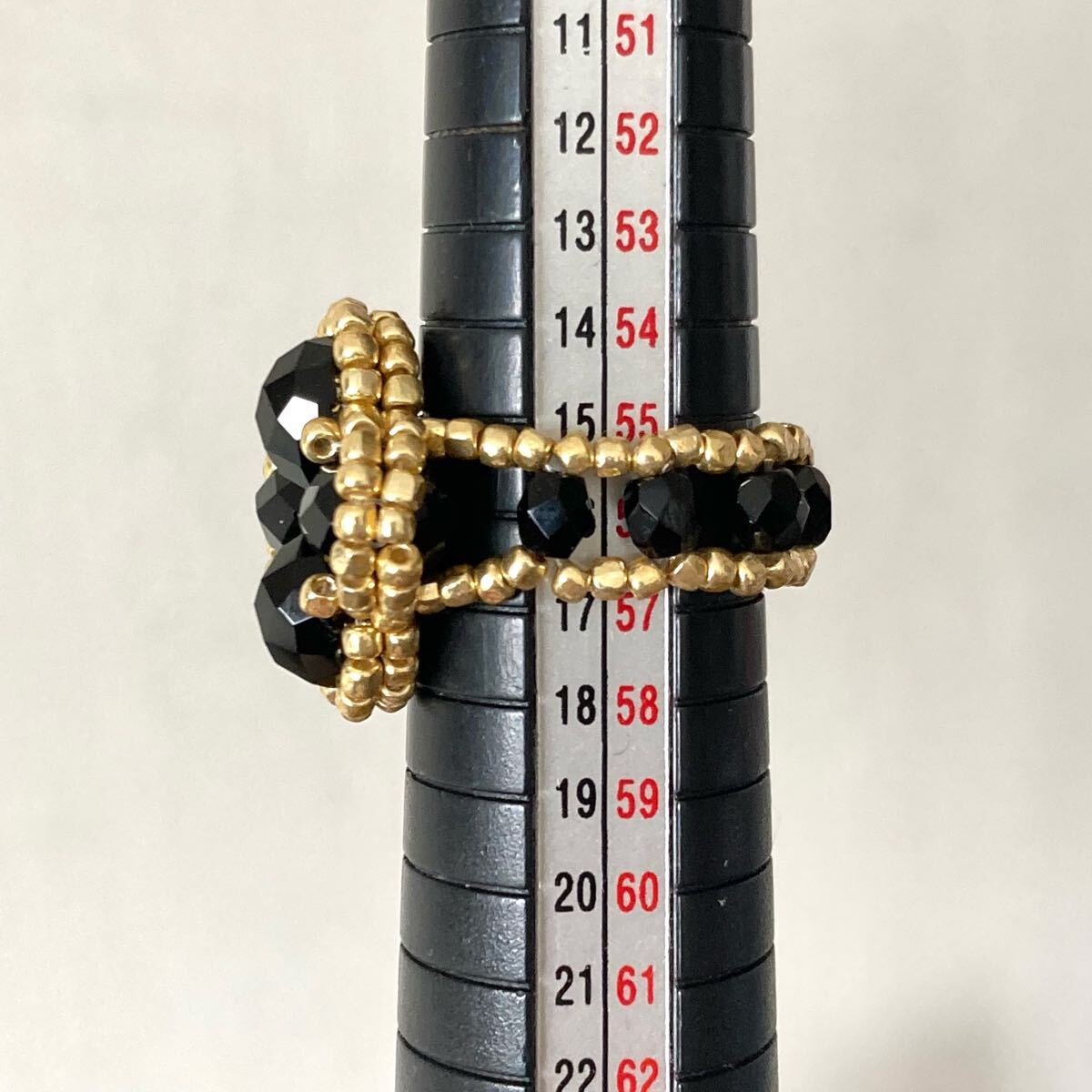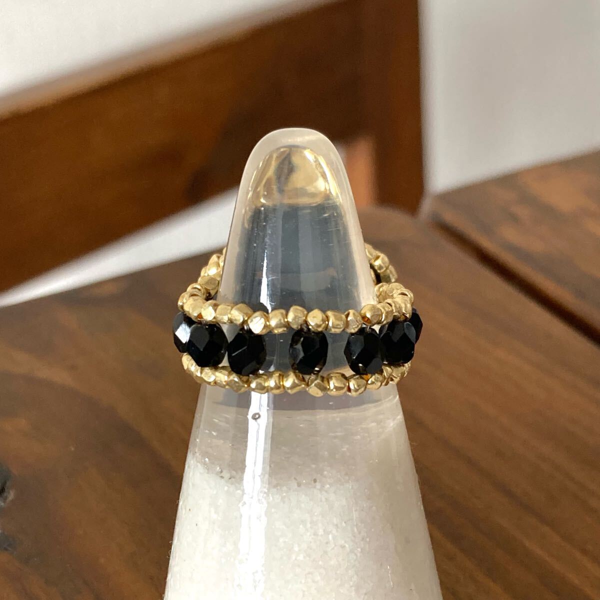 8mmの黒のボタンカットビーズ、4mmの黒のチェコビーズ、ゴールドのスリーカットビーズで作ったリングです。