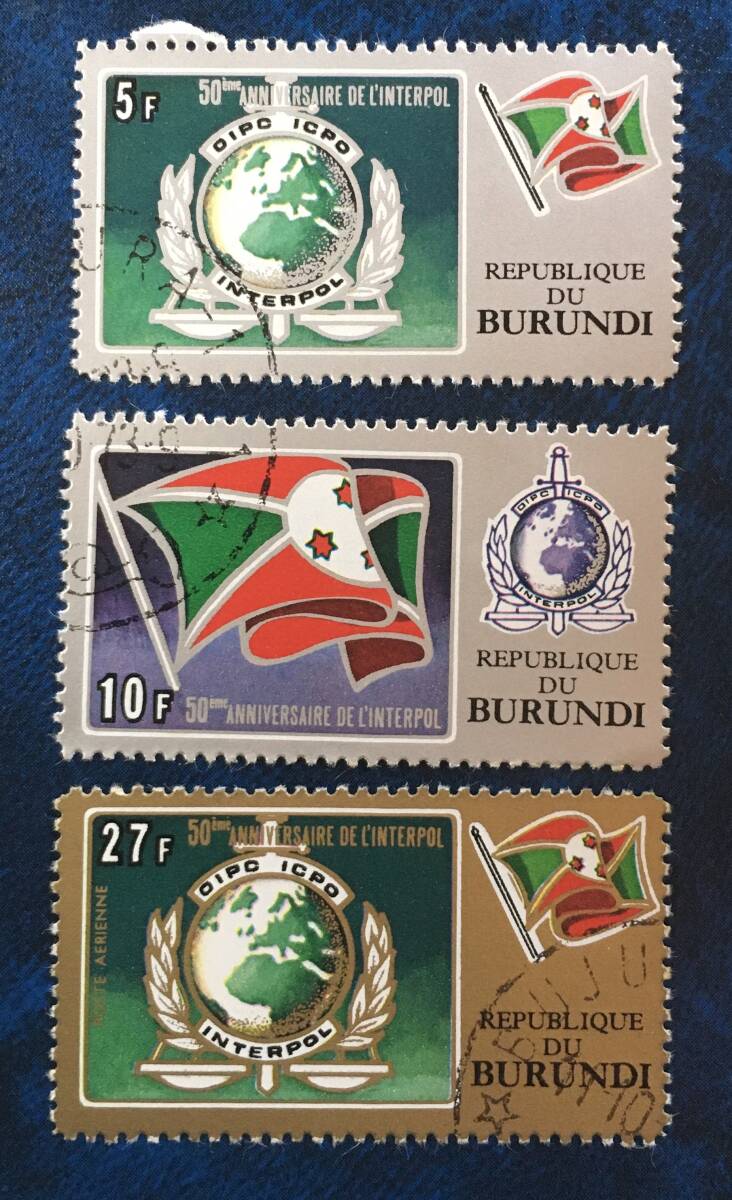 【旗.国旗】ブルンジ 1973年 インターポール50周年 3種 押印済み インターポールの旗と紋章、ブルンジの国旗 ICPO