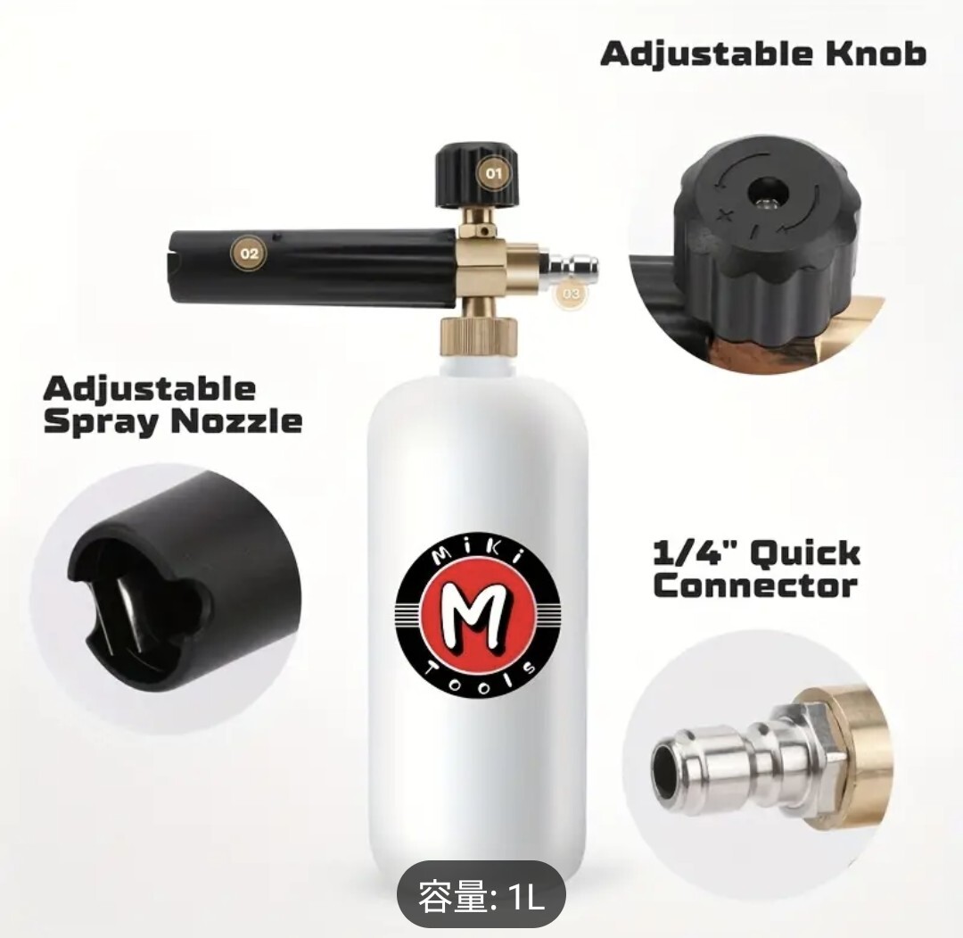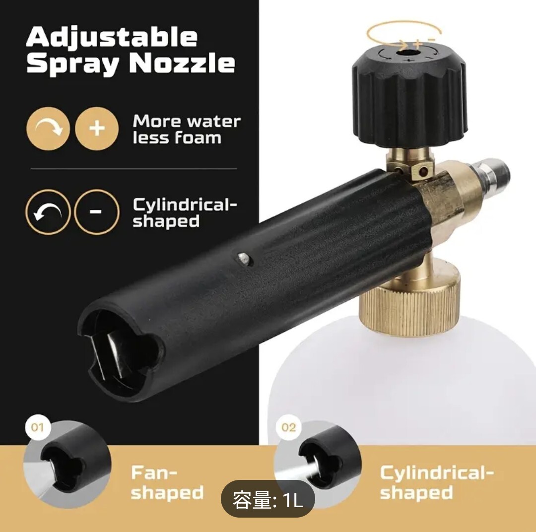 【取り付け簡単】:まず、石鹸を温水で満たして厚い泡を作ります。次に、1/4インチのクイック接続プラグを高圧洗浄機ガンまたはワンドに接続します。最後に、上部のノブを希望の泡レベルに調整し、泡が発生するようにします。ブラスターは濃厚な泡を分散させます。ノブは泡吐出量を調整し、ノズルはスプリンクラーパターンを調整します