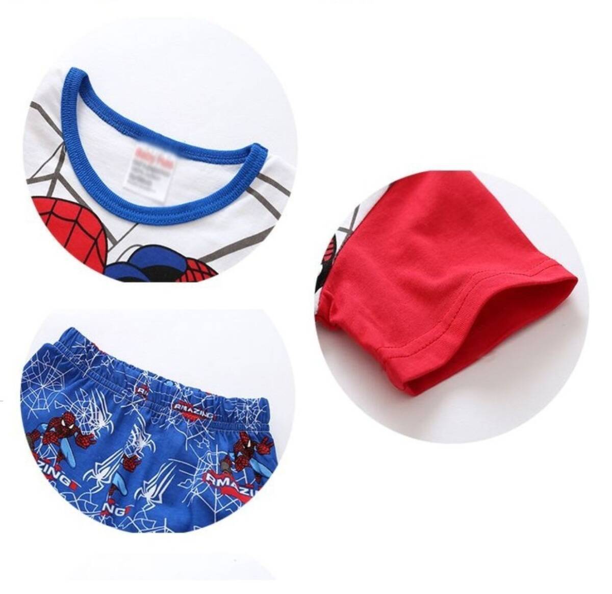 スパイダーマンデザインの子供用パジャマです。上下セットでグレーの半袖Tシャツと白地にスパイダーマン柄のショートパンツがセットになっています。夏に最適な涼しい素材感で、お子様の快適な睡眠をサポートします。
