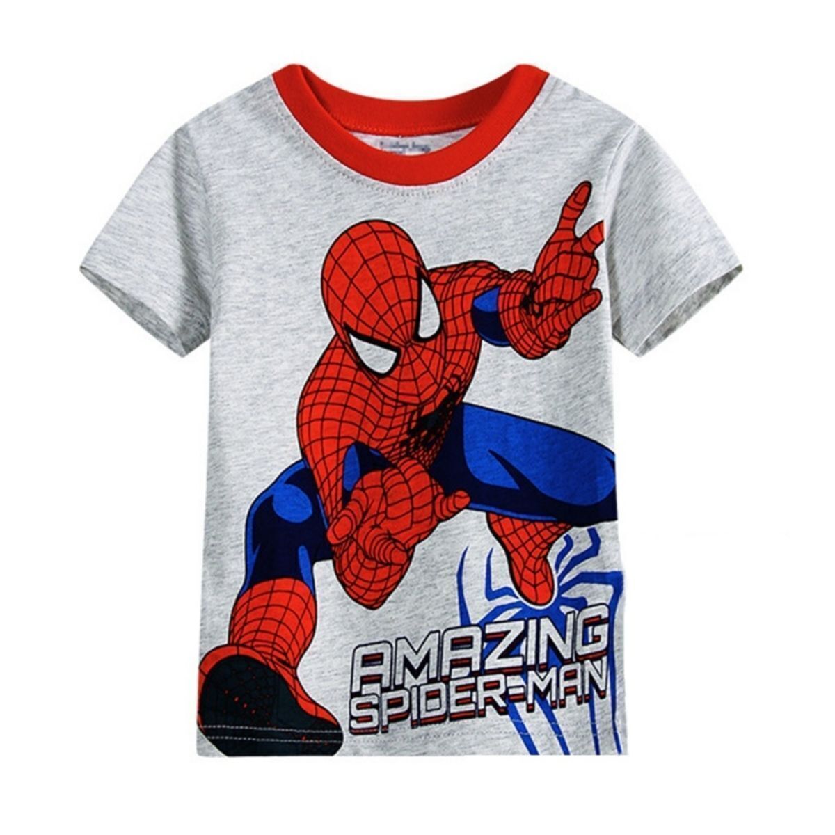 ・上部:グレー地に赤いネックライン、スパイダーマンのプリント、「AMAZING SPIDER-MAN」のロゴ入り