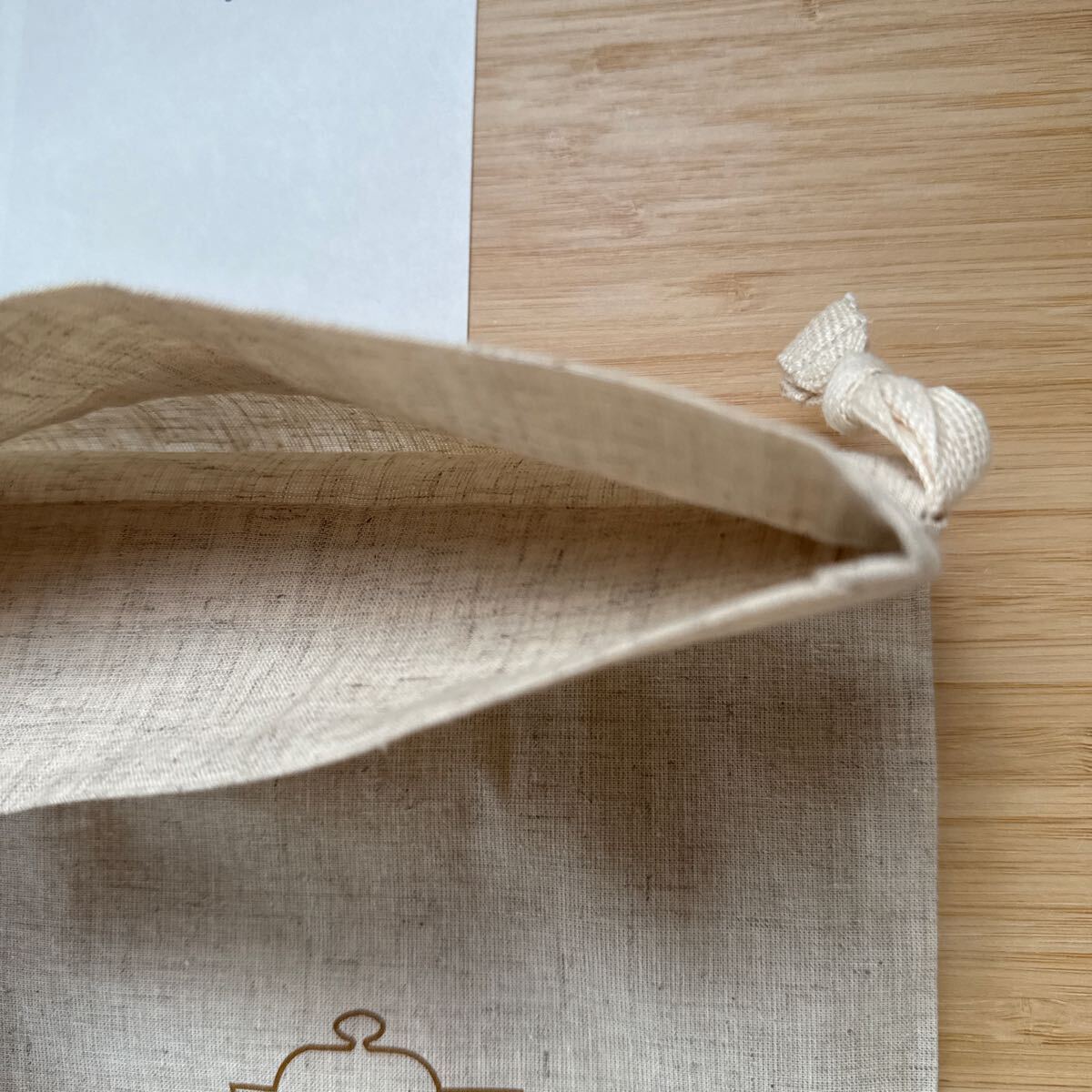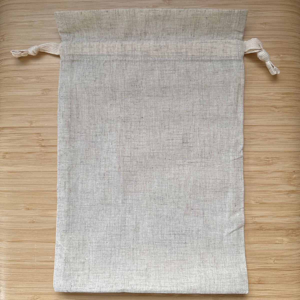 恐らくシーチングかと思いますが、麻の雰囲気でシッカリ素材です。素朴な紐も雰囲気良しです。