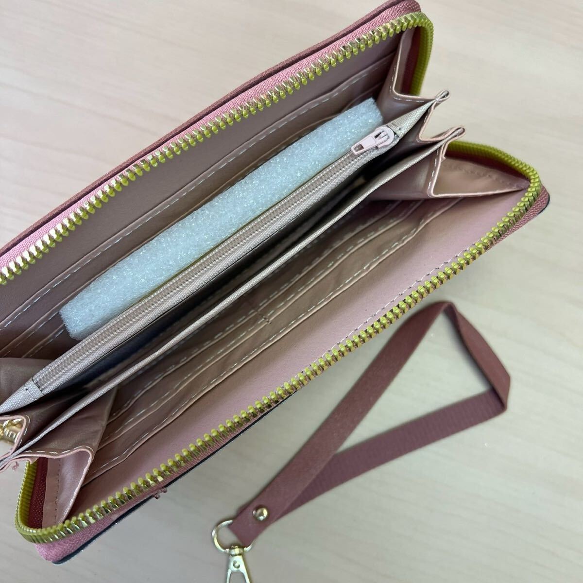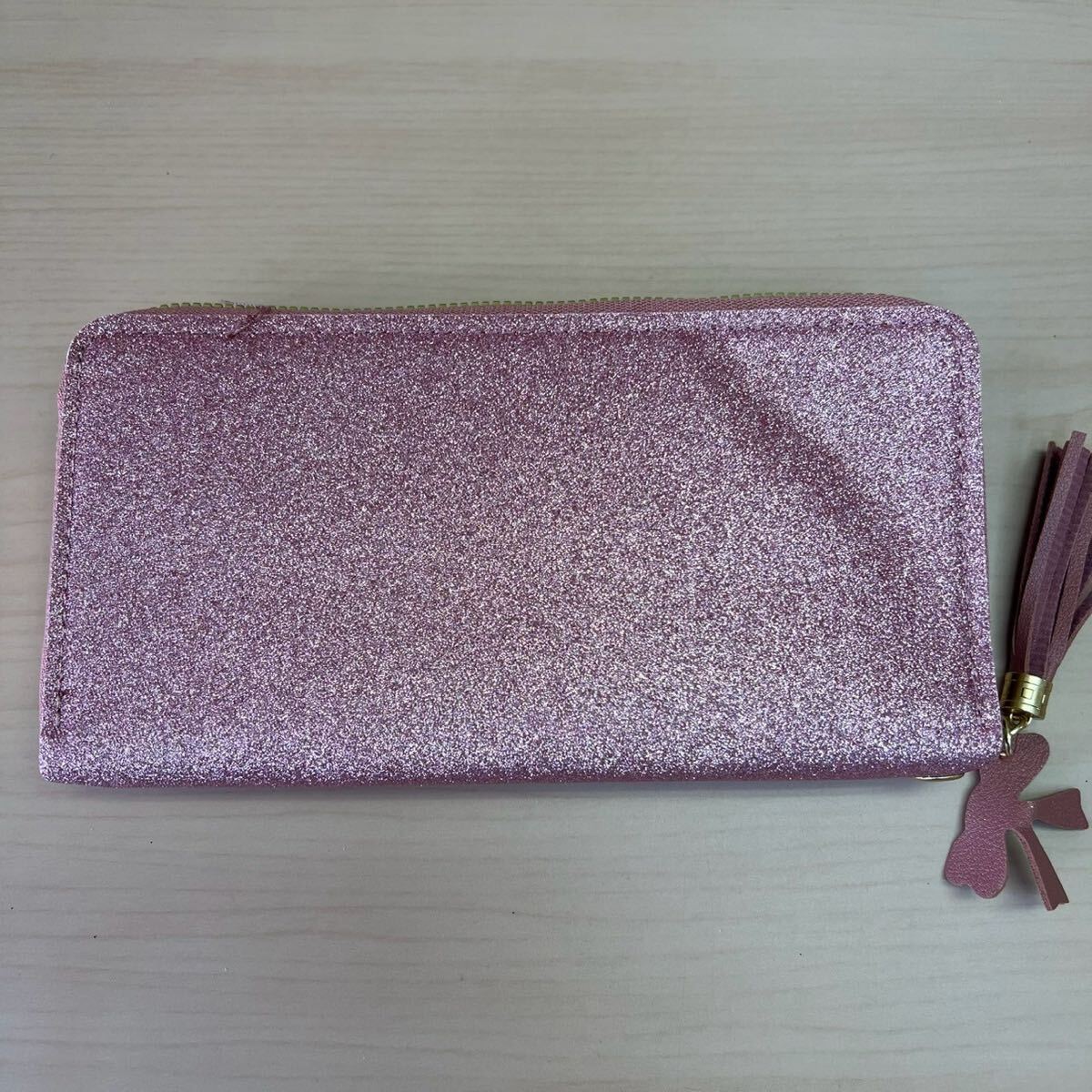 グリッター仕上げのピンク長財布、タッセル付きでスタイリッシュ。
