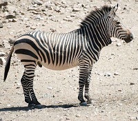 山岳地帯のごく限られた地域にわずかに生息している、たいへん珍しい種類のハートマンシマウマ(国際政府許可要)で、平原で群れをなしているバーチェルシマウマ(許可無)ではございません。(わかりやすいところは、背中の縞模様が異なります)