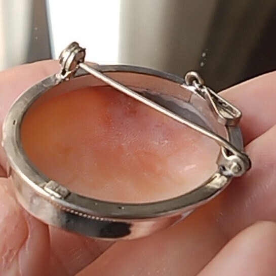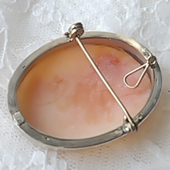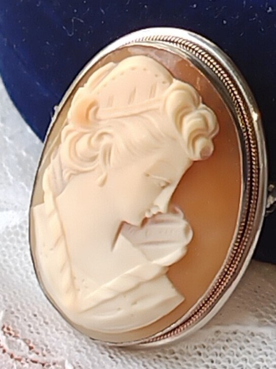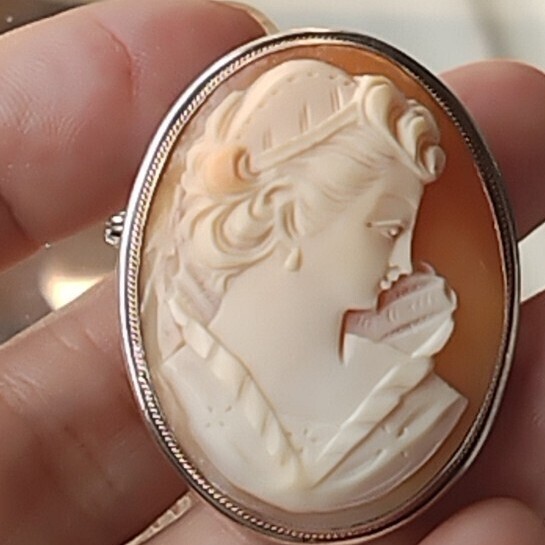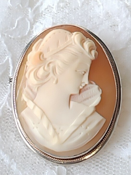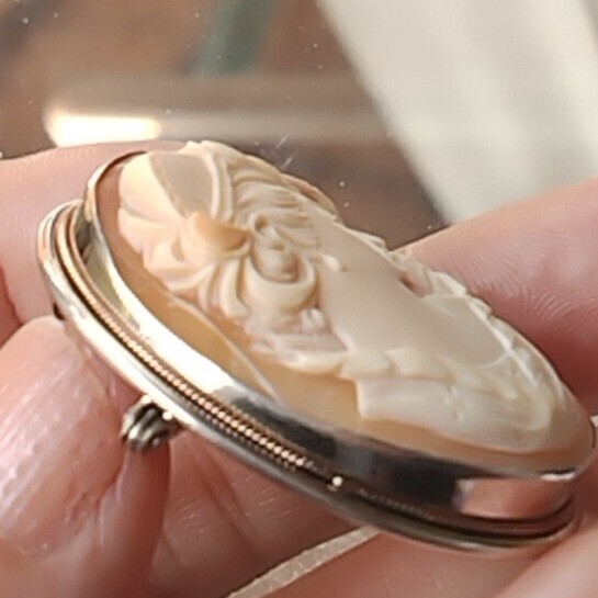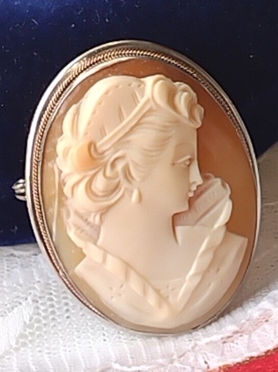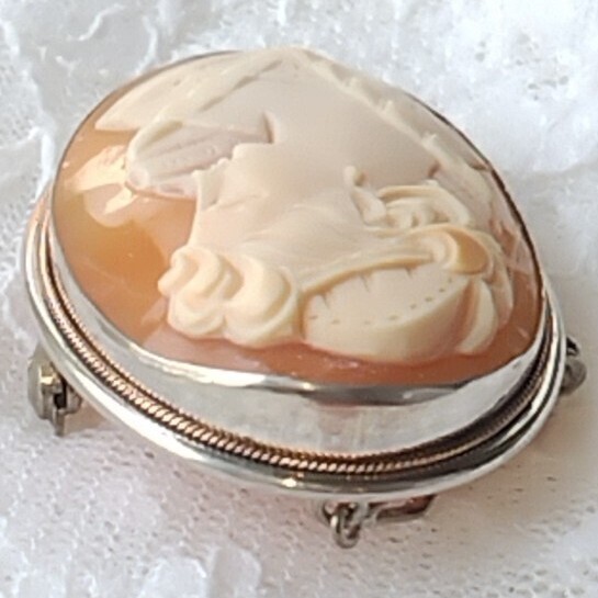 美しいカメオデザインのブローチ、女性の横顔を描いたオーバル型、美しいお顔と、お洋服も素敵な一品です。ブローチ、ペンダントトップとしてもお使い頂けます。