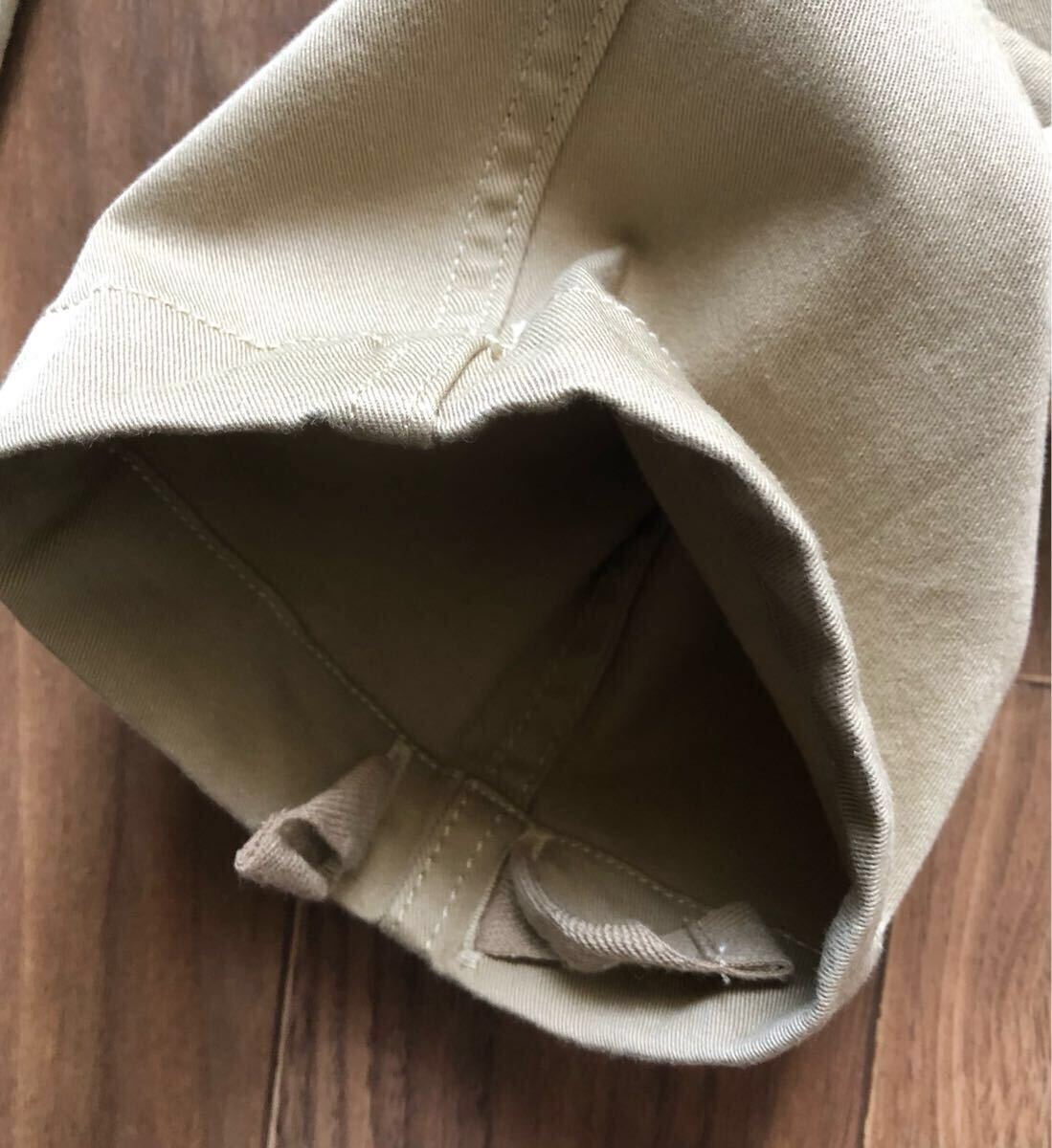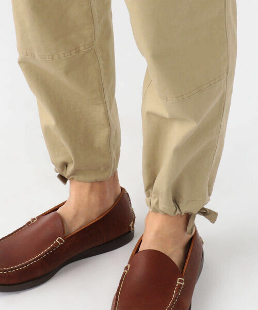 今回は、ベルギー軍のフィールドオーバーパンツをベースにデザインしました。シルエットは<sage de cret>らしい裾にかけてテーパードがかかる美しいシルエット。ウエスト部分にはゴムを施しシャーリング仕様にし、ドローストリングでウエストを調整もできるためイージーパンツ感覚で着用が可能です。体型を問わずに愛用できるパターンを今回も採用しています。ウエストの平紐が通る口部分は、見え方にこだわった手縫いの両玉縁仕様です。